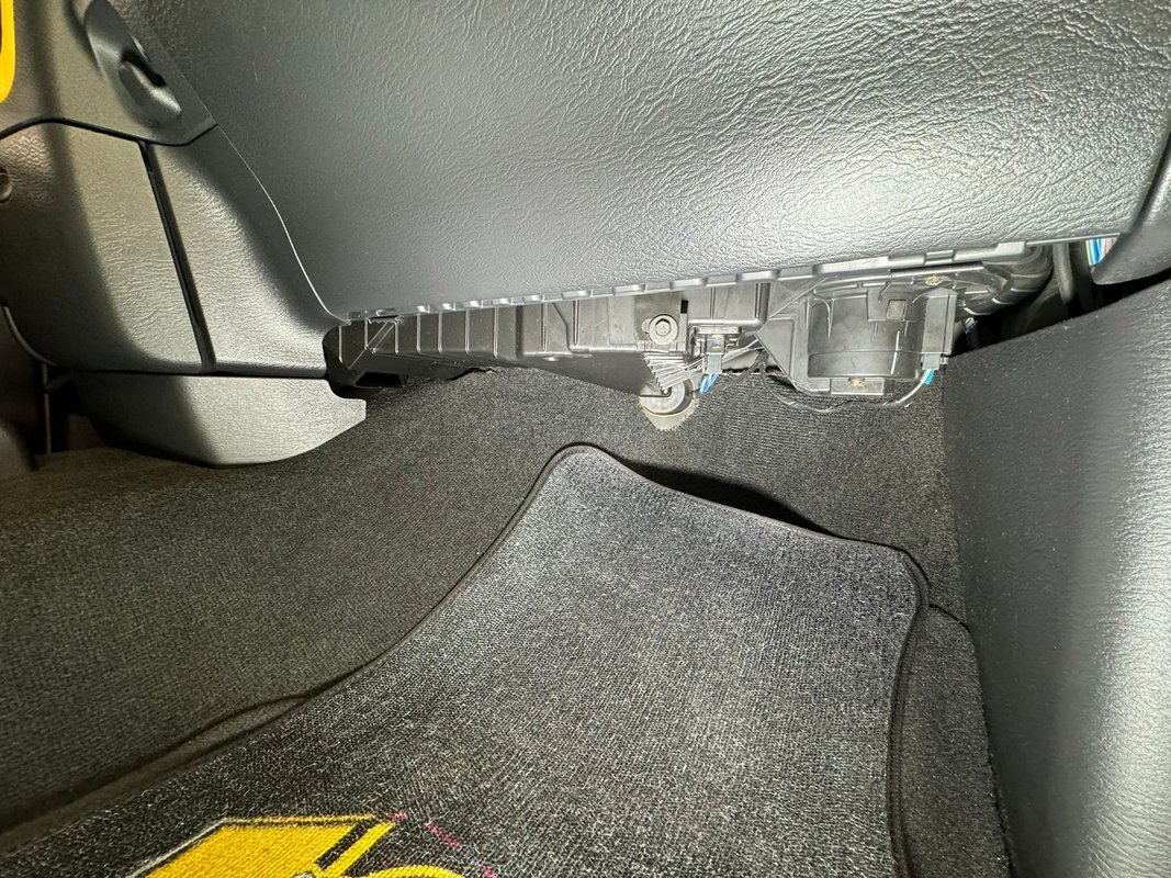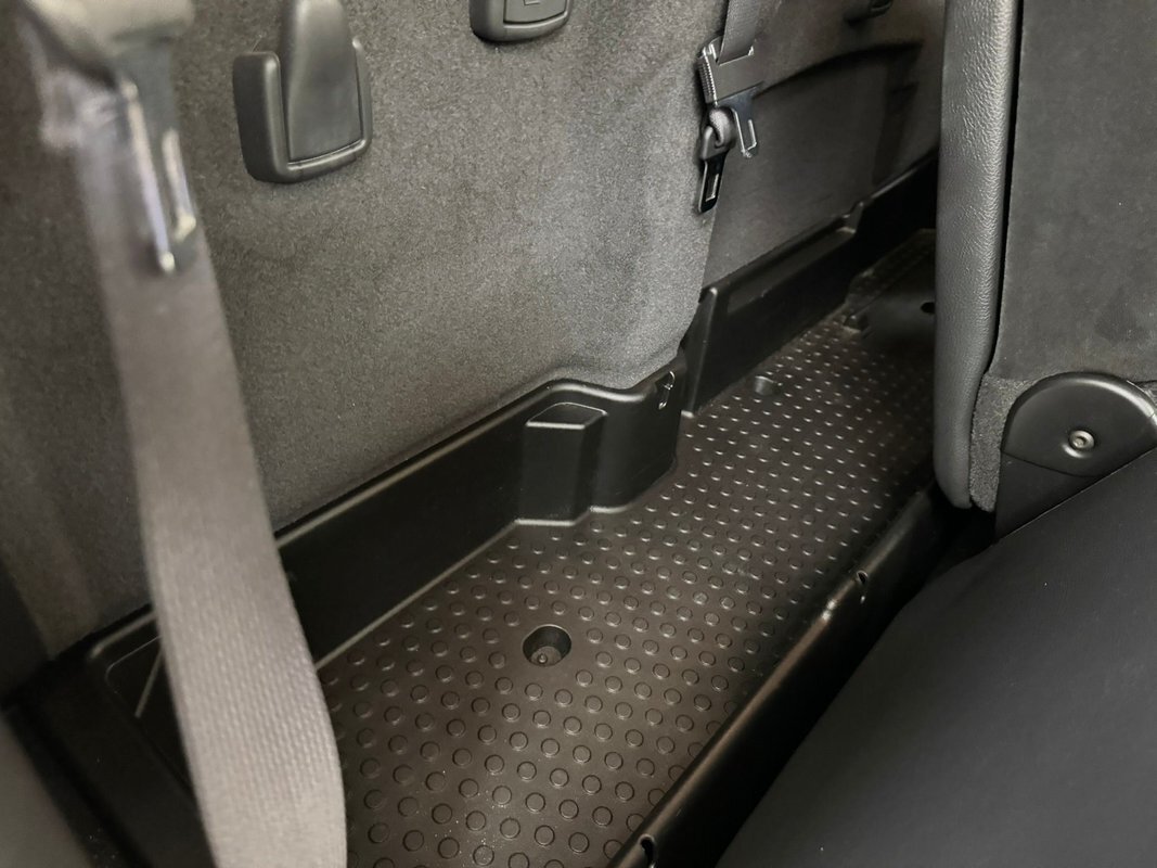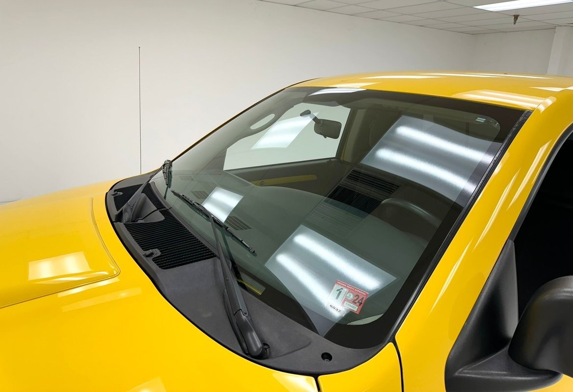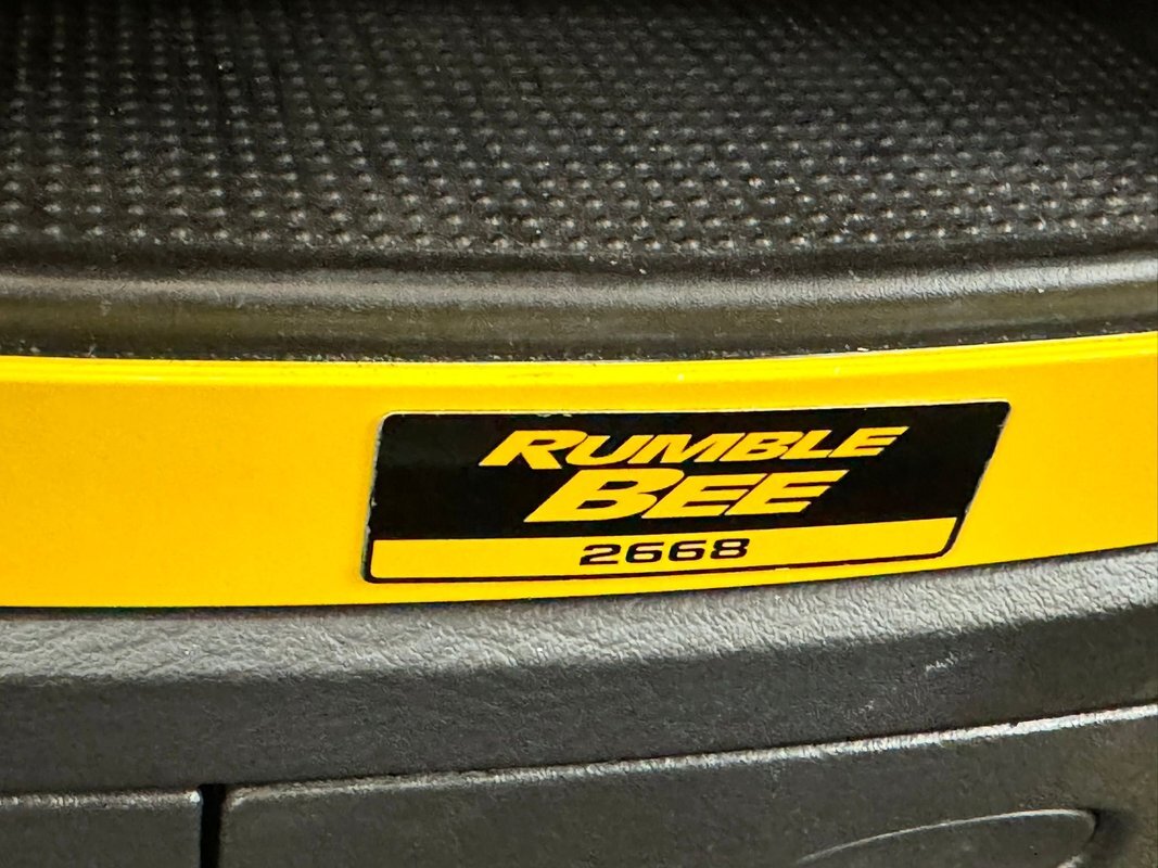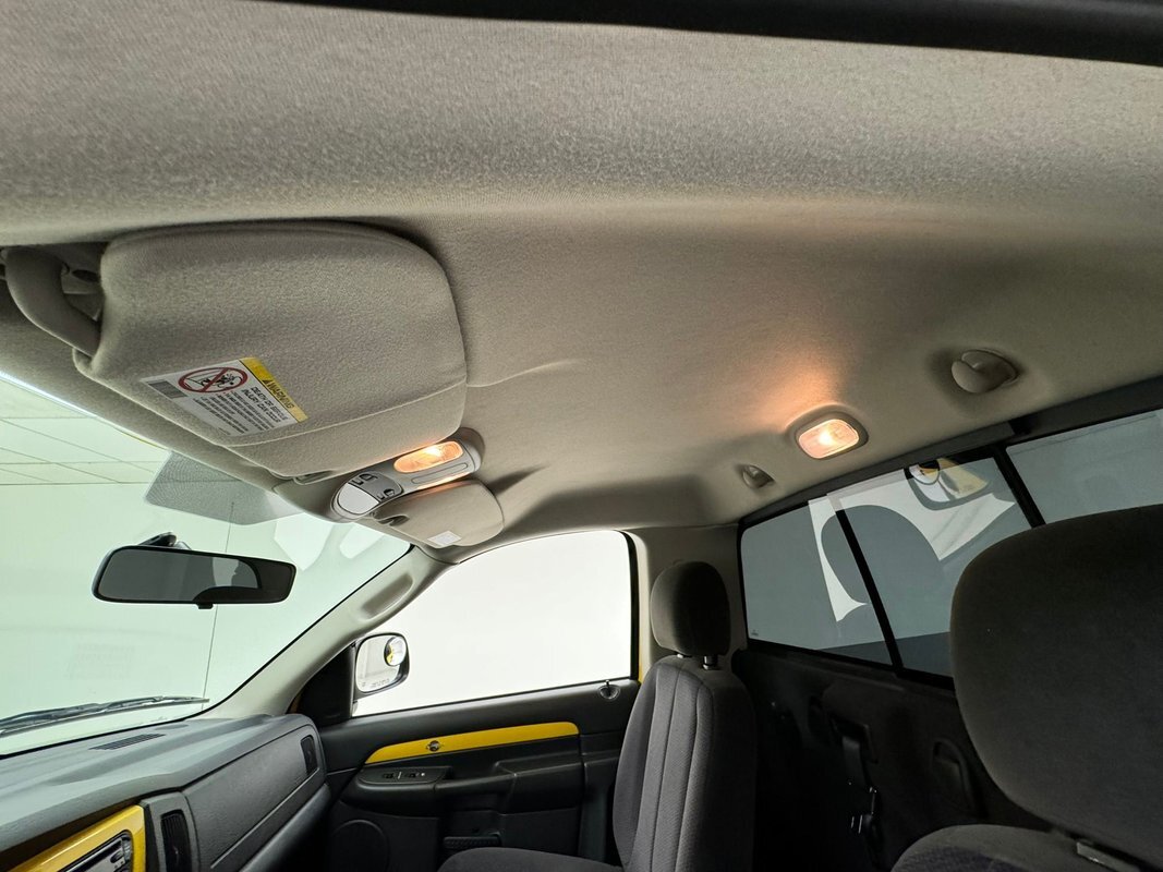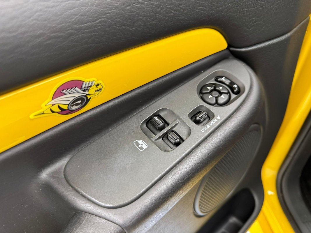 A swing of the doors reveals a black plastic molded complex panel and it has some yellow accenting. Storage bins abound and some more toggles are within this complex field. Inside you can land upon dual high backed gray oval broadcloth pattern buckets in broadcloth. There is a large center console/armrest and it can be flipped up to make room for a third passenger. In front, more molded black plastic forms the dash which has white faced instruments, and a yellow central accenting panel. This panel houses the AM/FM/CD radio and the climate control knobs. The factory dash presents as very clean and like new. Also very clean is the black carpeting which has some Rumble Bee Logo black floor mats. A fuzzy broadcloth gray headliner is installed tightly above.