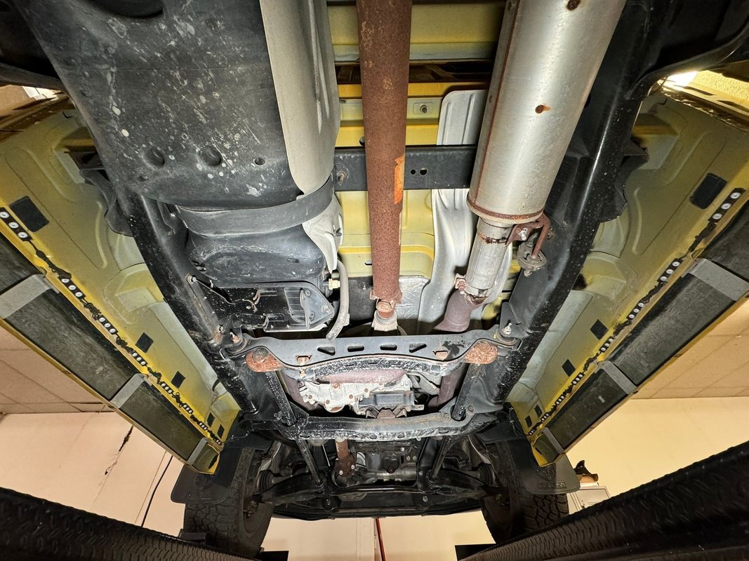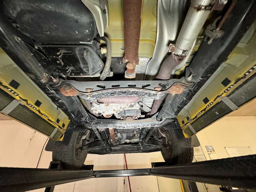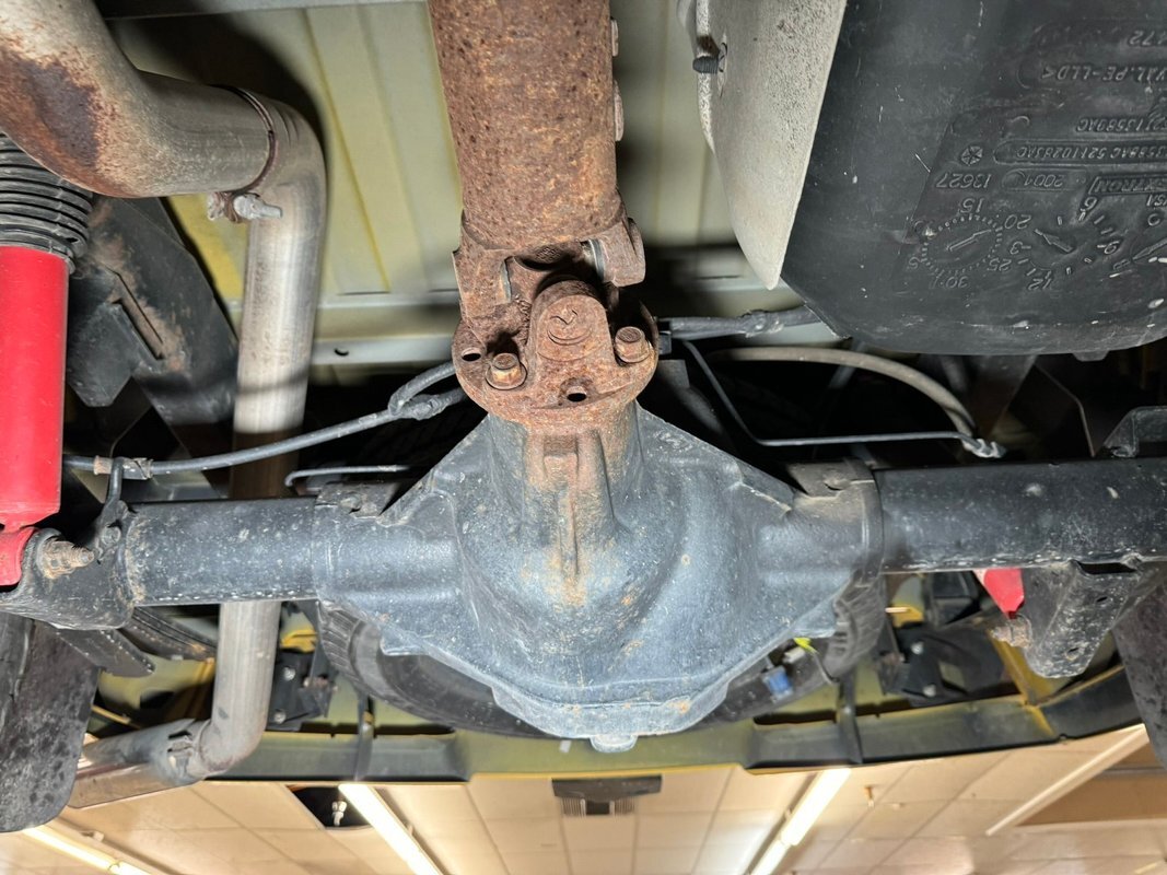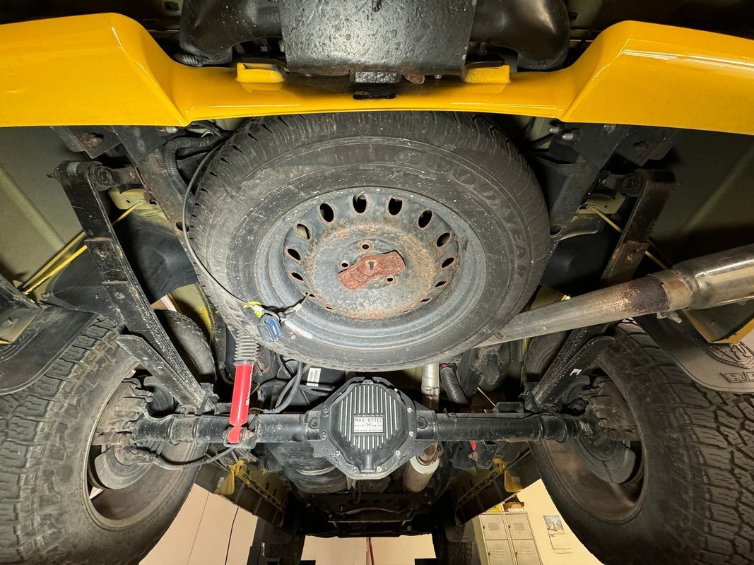 Black rust free structural steel abounds underneath with some light factory overspray of yellow on the inner fenders and floor pans. A little road dirt can be thrown in on that too! Front suspension has independent torsion bars and rear is leaf springs. Power disc brakes are on all 4 corners.