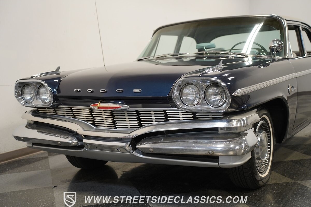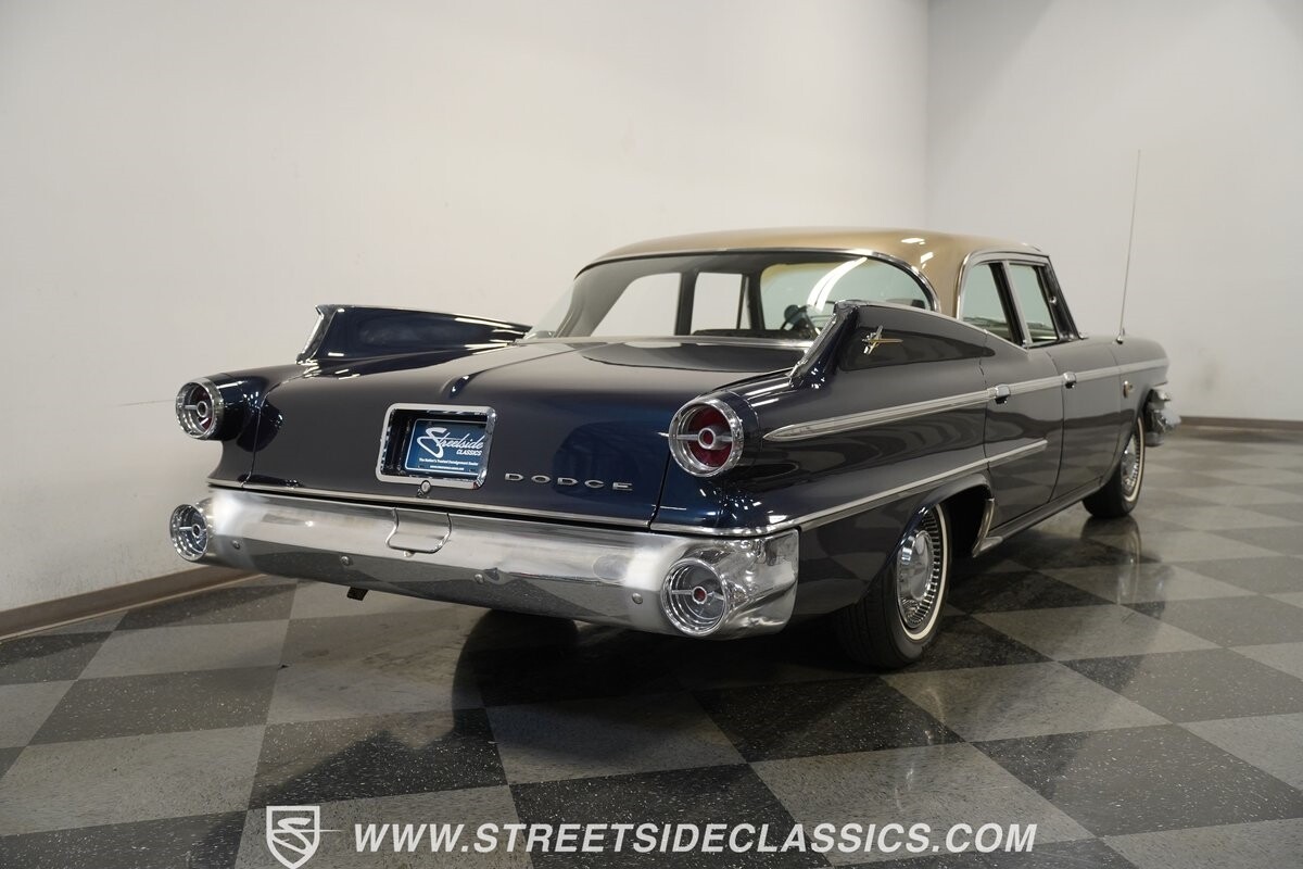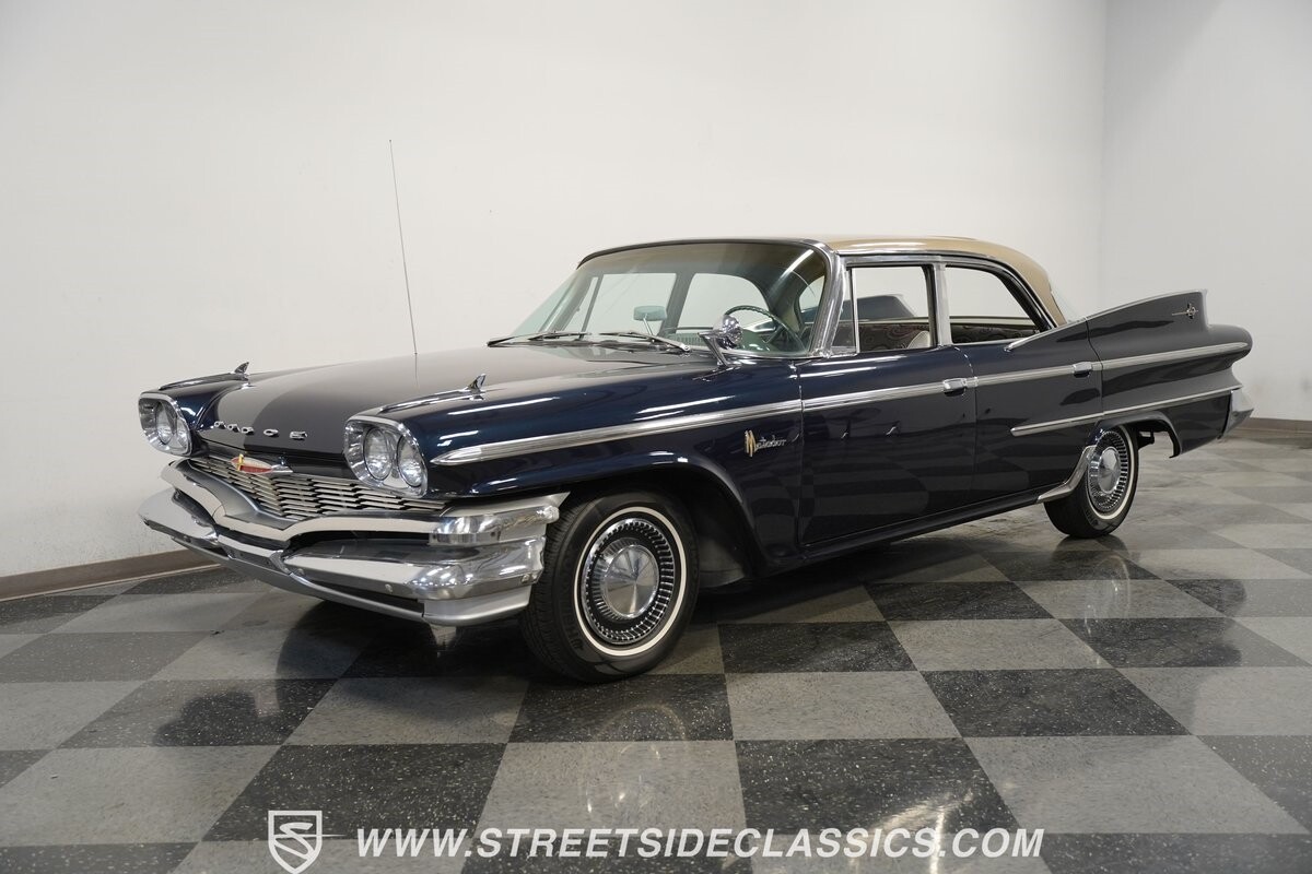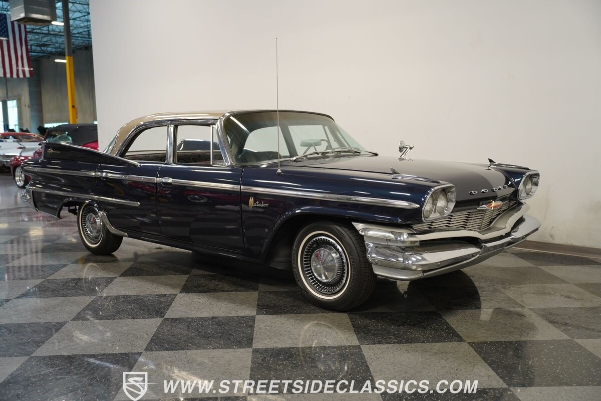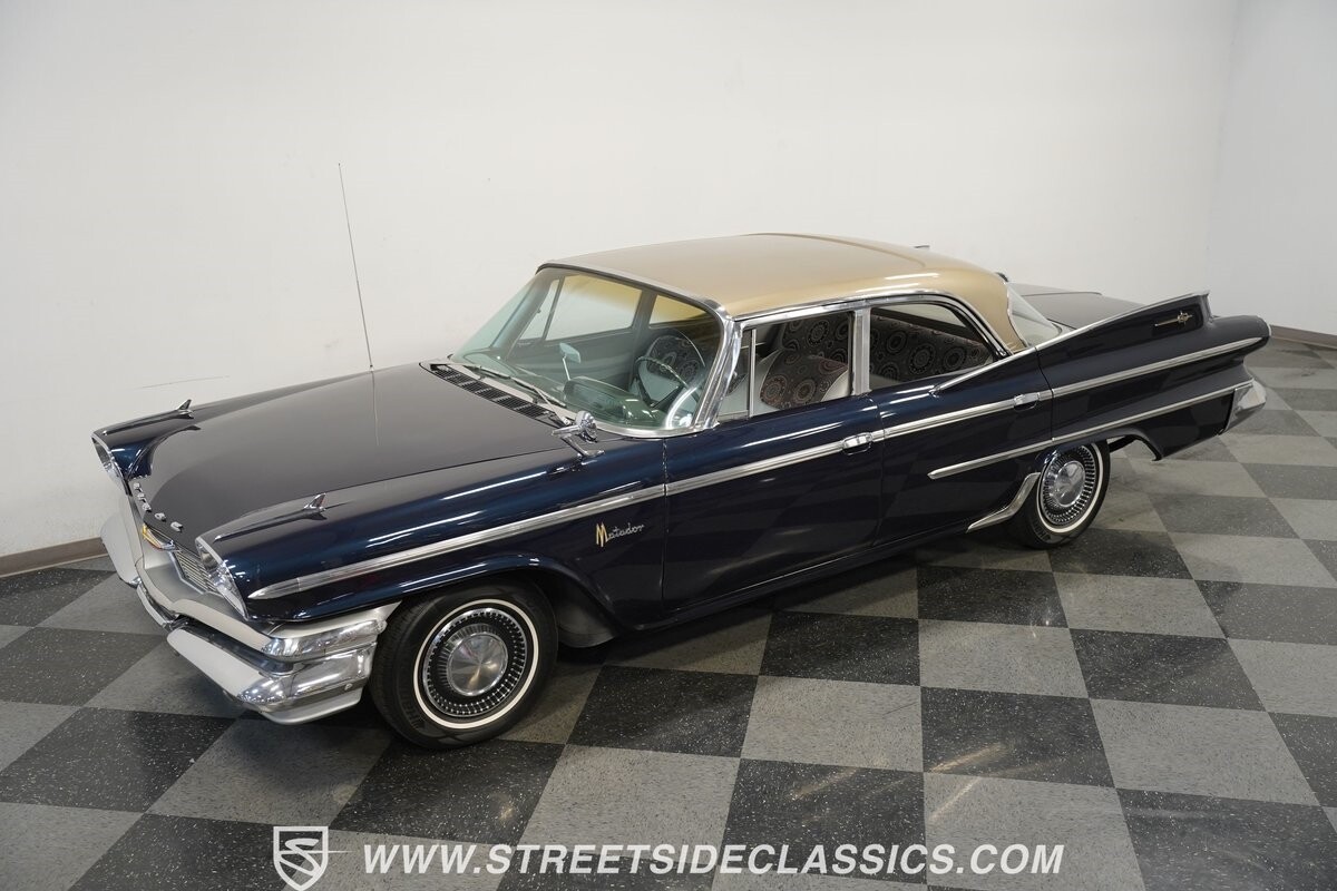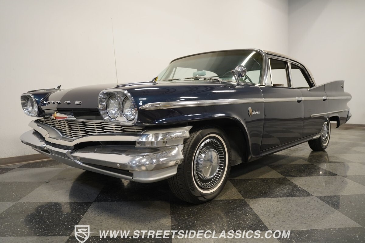 The 1960 Dodge Matador, a rare single-year model, is a classic boulevard cruiser that encapsulates the essence of vintage Americana. Draped in a captivating navy blue metallic paint, this particular Matador showcases a striking gold roof that adds a touch of elegance to its already impressive presence. Matador logos adorn the body, serving as a subtle reminder of this car's unique identity. Rolling on a set of 14" wheels wrapped in 215/75R14 tires, the Matador effortlessly glides down the road, its chrome bumpers and trim gleaming in the sun.