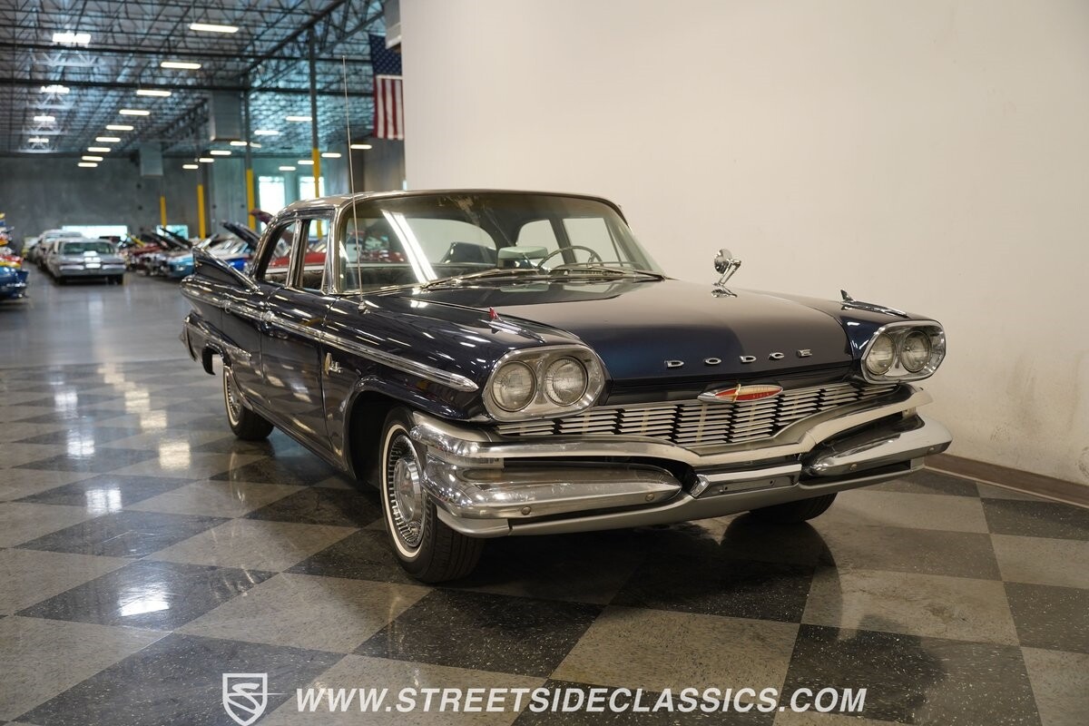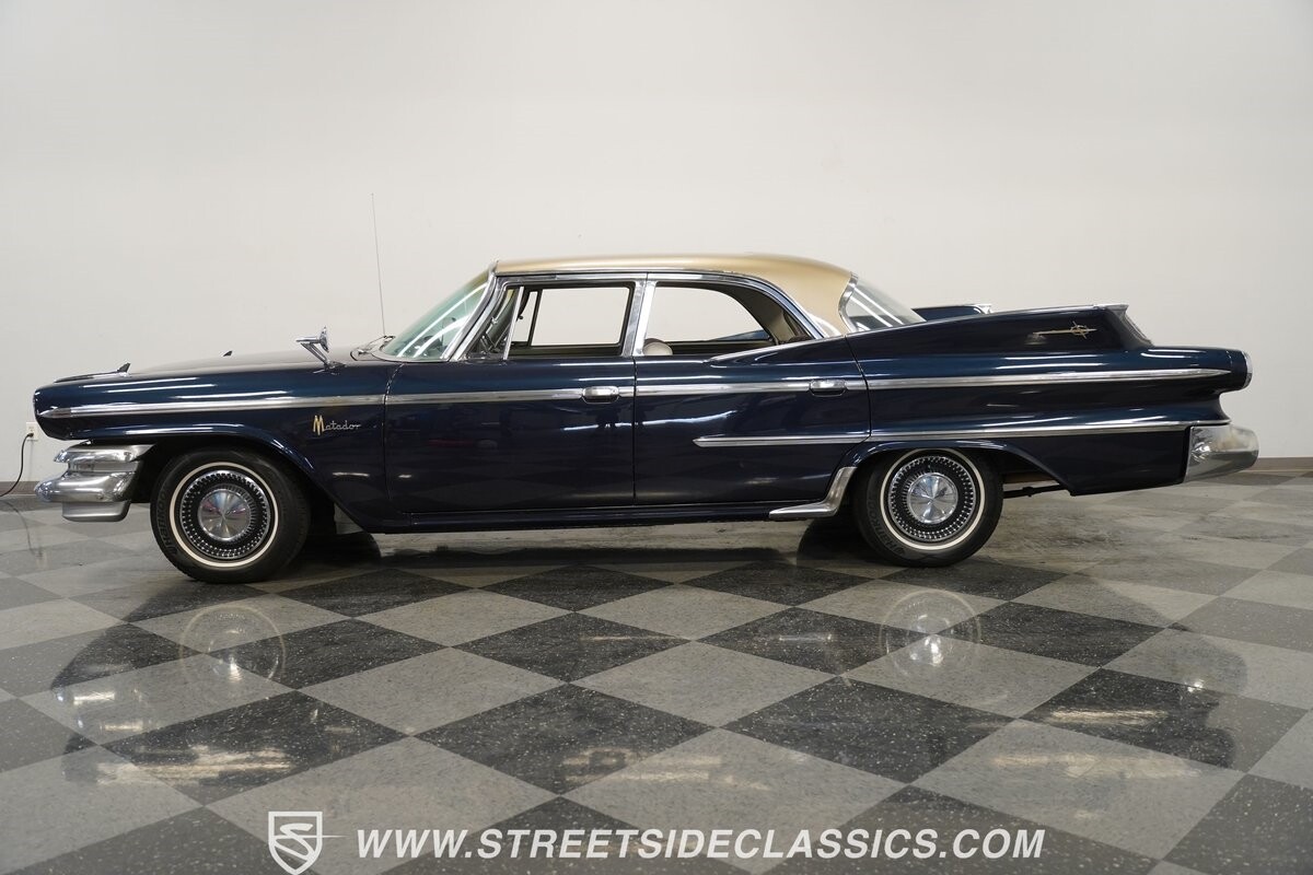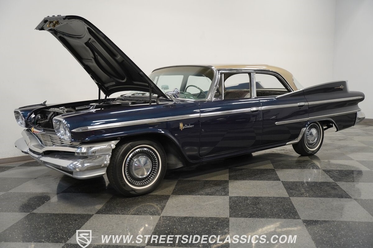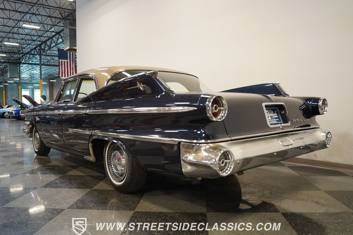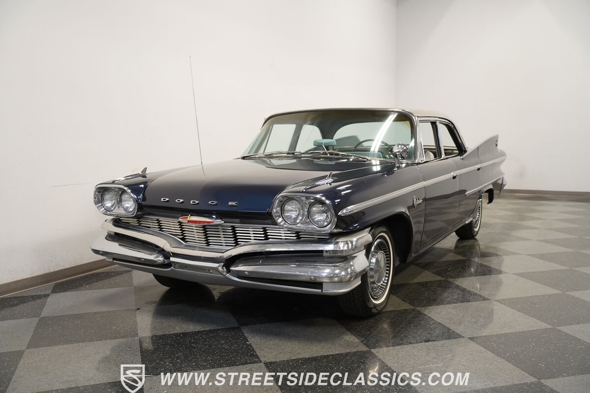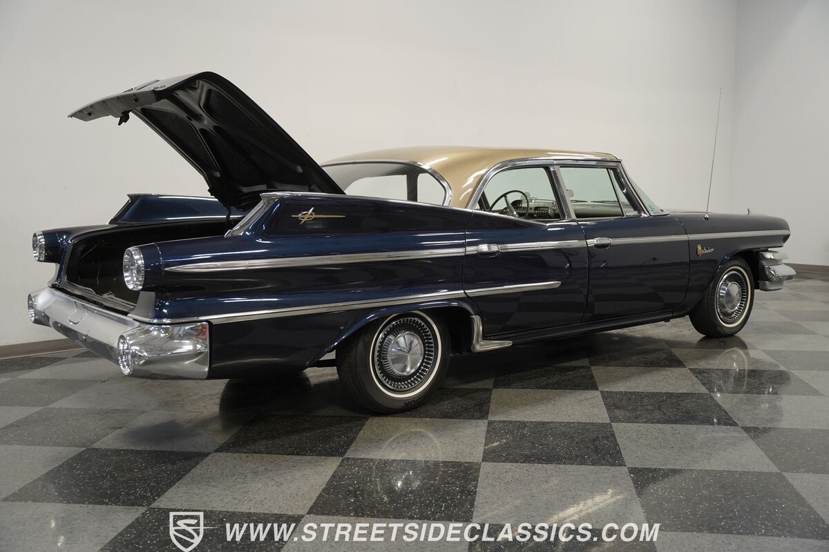 The 1960 Dodge Matador, a rare single-year model, is a classic boulevard cruiser that encapsulates the essence of vintage Americana. Draped in a captivating navy blue metallic paint, this particular Matador showcases a striking gold roof that adds a touch of elegance to its already impressive presence. Matador logos adorn the body, serving as a subtle reminder of this car's unique identity. Rolling on a set of 14" wheels wrapped in 215/75R14 tires, the Matador effortlessly glides down the road, its chrome bumpers and trim gleaming in the sun.