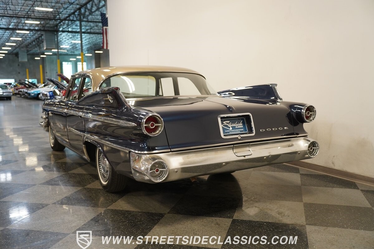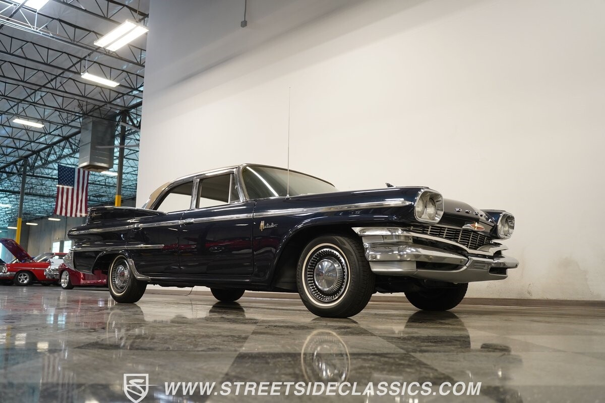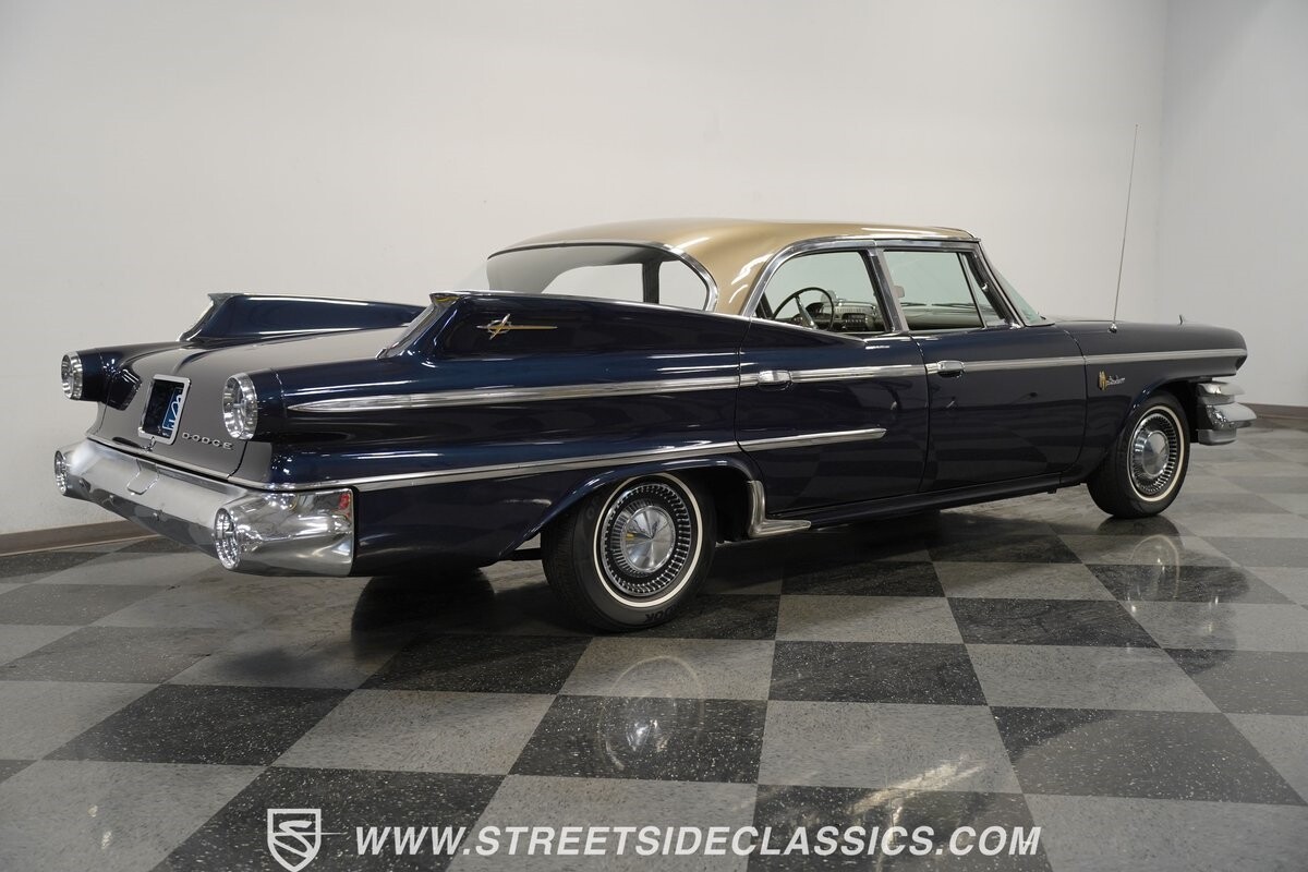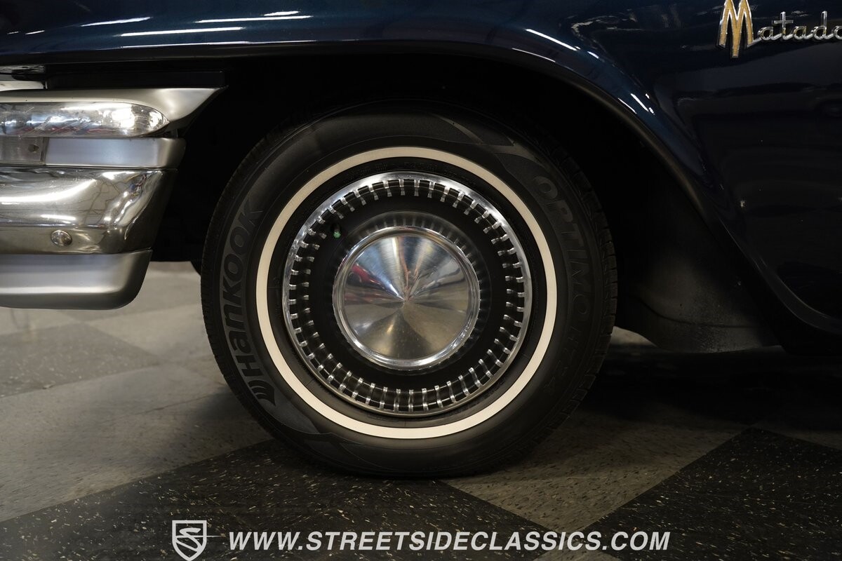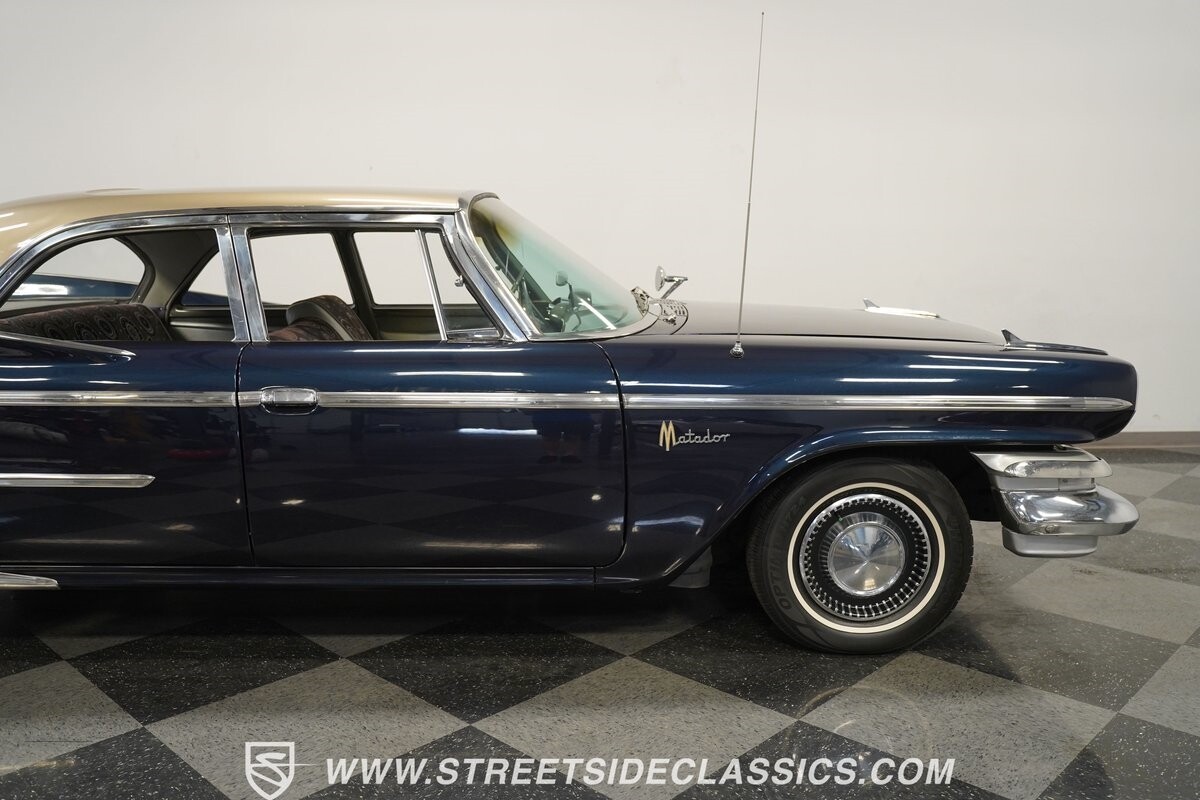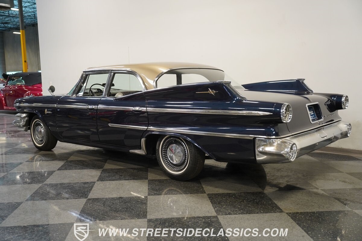 The 1960 Dodge Matador, a rare single-year model, is a classic boulevard cruiser that encapsulates the essence of vintage Americana. Draped in a captivating navy blue metallic paint, this particular Matador showcases a striking gold roof that adds a touch of elegance to its already impressive presence. Matador logos adorn the body, serving as a subtle reminder of this car's unique identity. Rolling on a set of 14" wheels wrapped in 215/75R14 tires, the Matador effortlessly glides down the road, its chrome bumpers and trim gleaming in the sun.