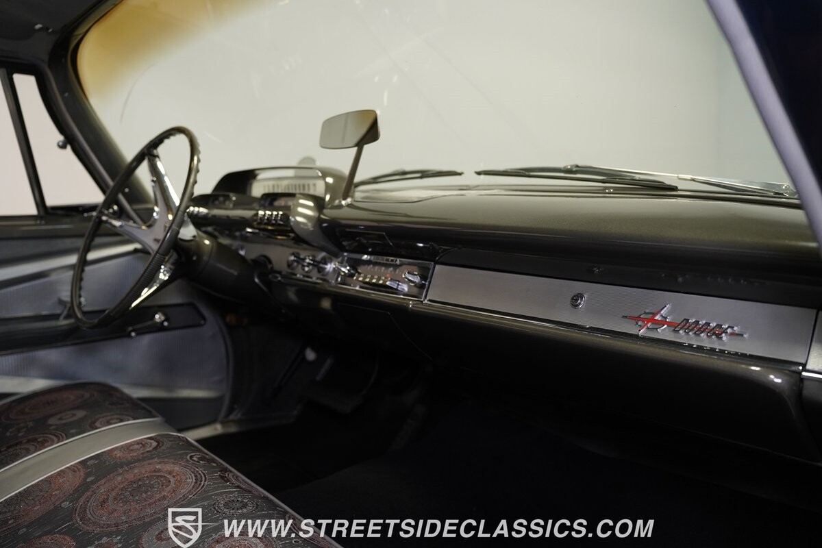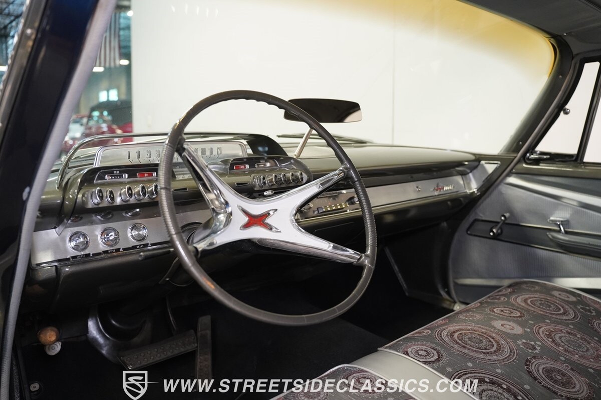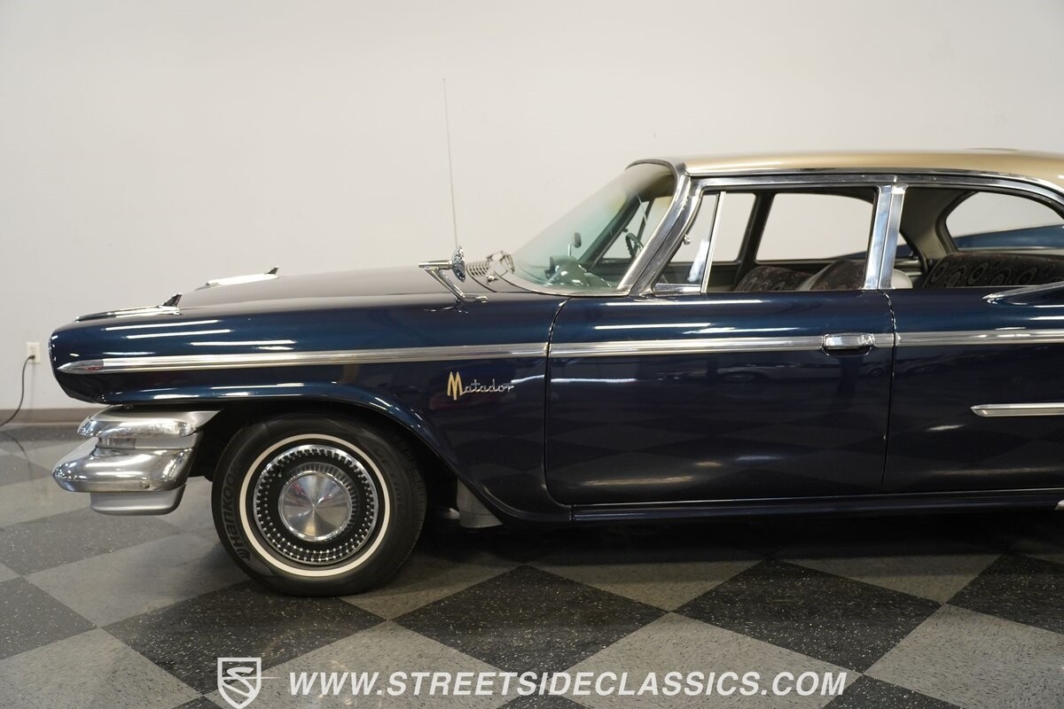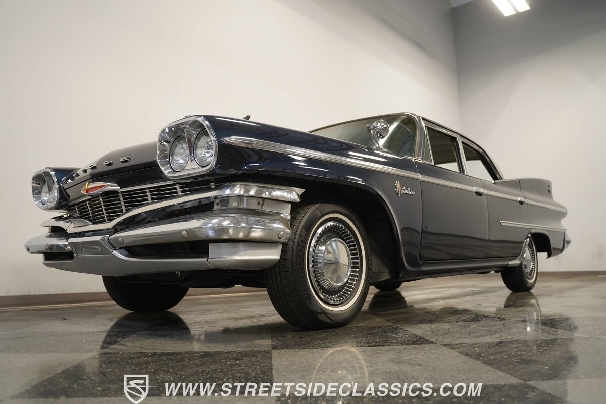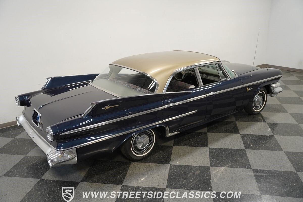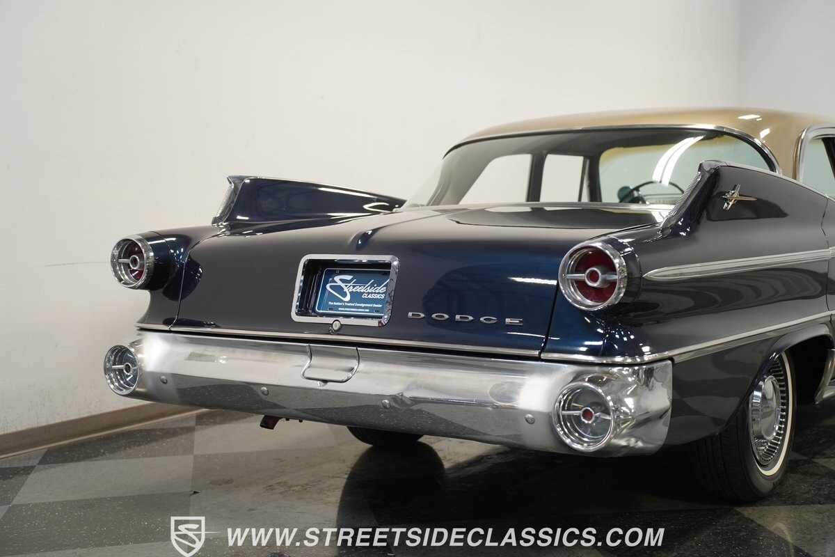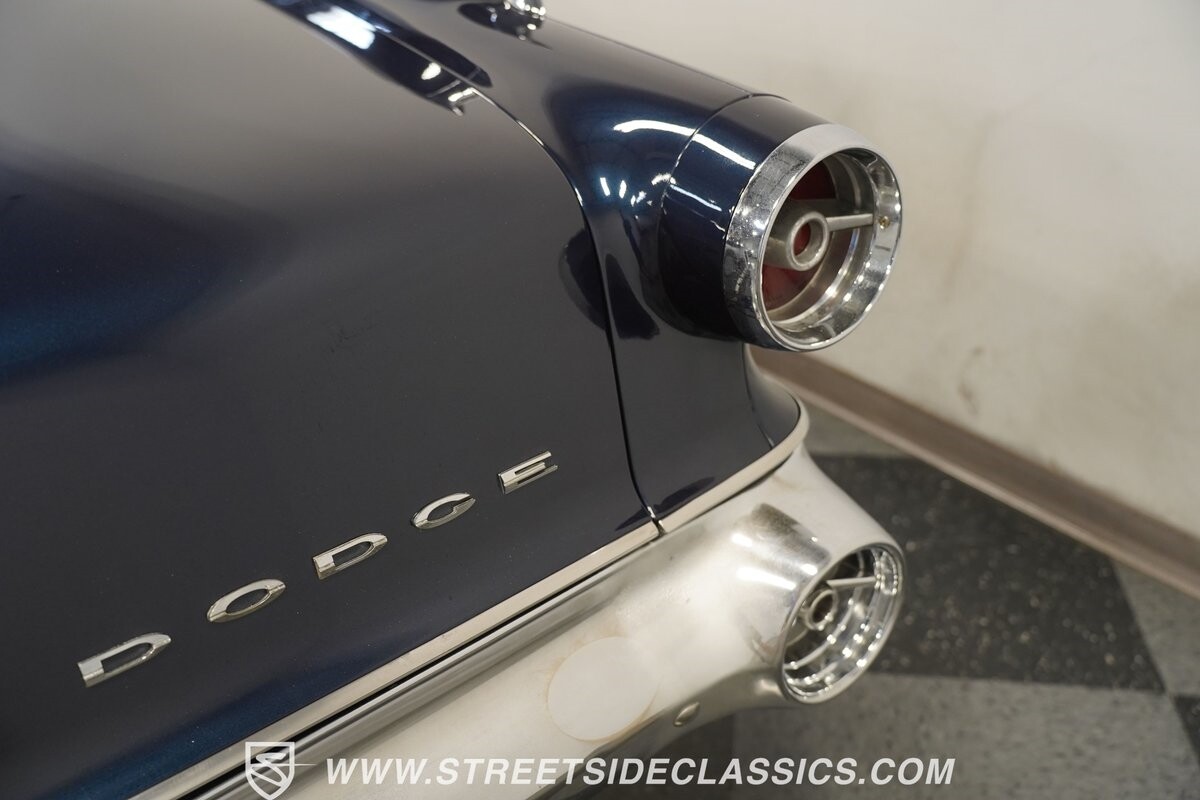 The 1960 Dodge Matador, a rare single-year model, is a classic boulevard cruiser that encapsulates the essence of vintage Americana. Draped in a captivating navy blue metallic paint, this particular Matador showcases a striking gold roof that adds a touch of elegance to its already impressive presence. Matador logos adorn the body, serving as a subtle reminder of this car's unique identity. Rolling on a set of 14" wheels wrapped in 215/75R14 tires, the Matador effortlessly glides down the road, its chrome bumpers and trim gleaming in the sun.