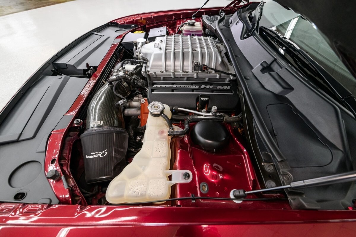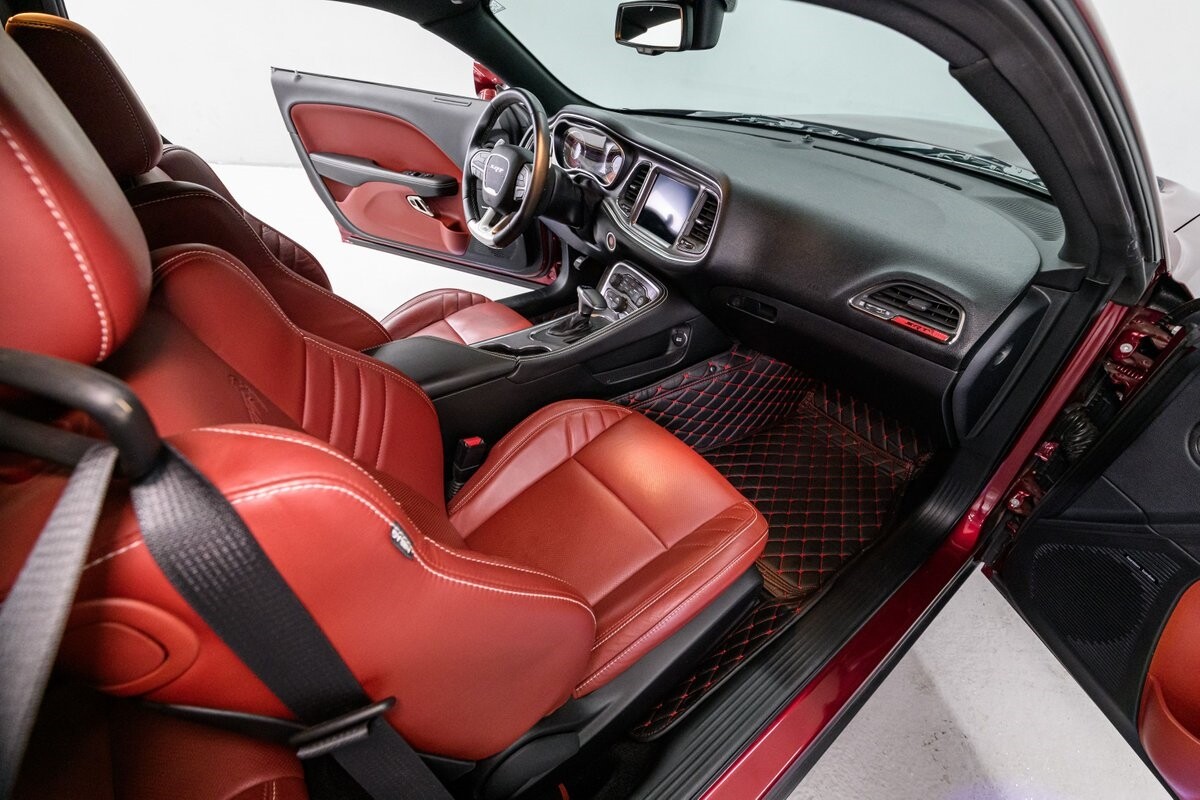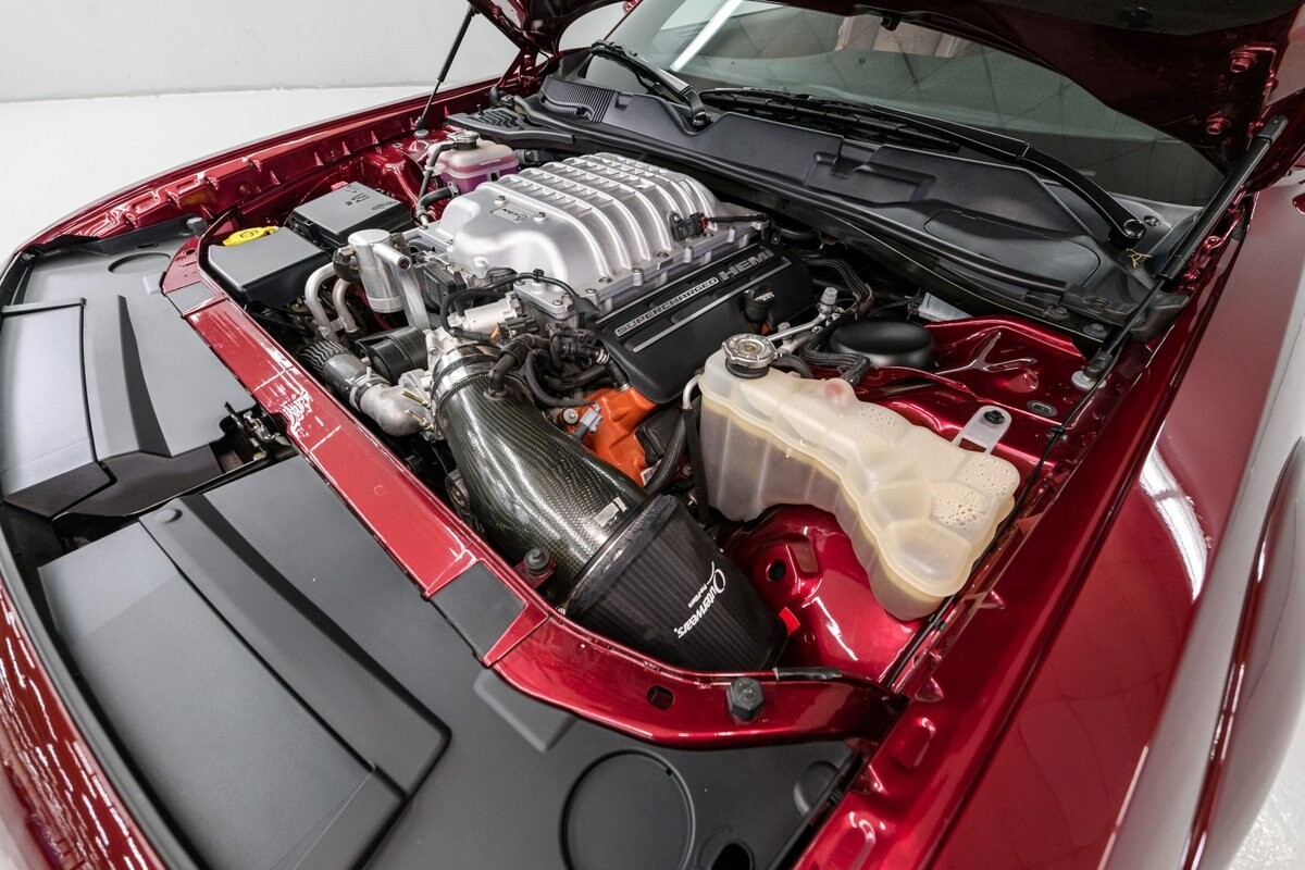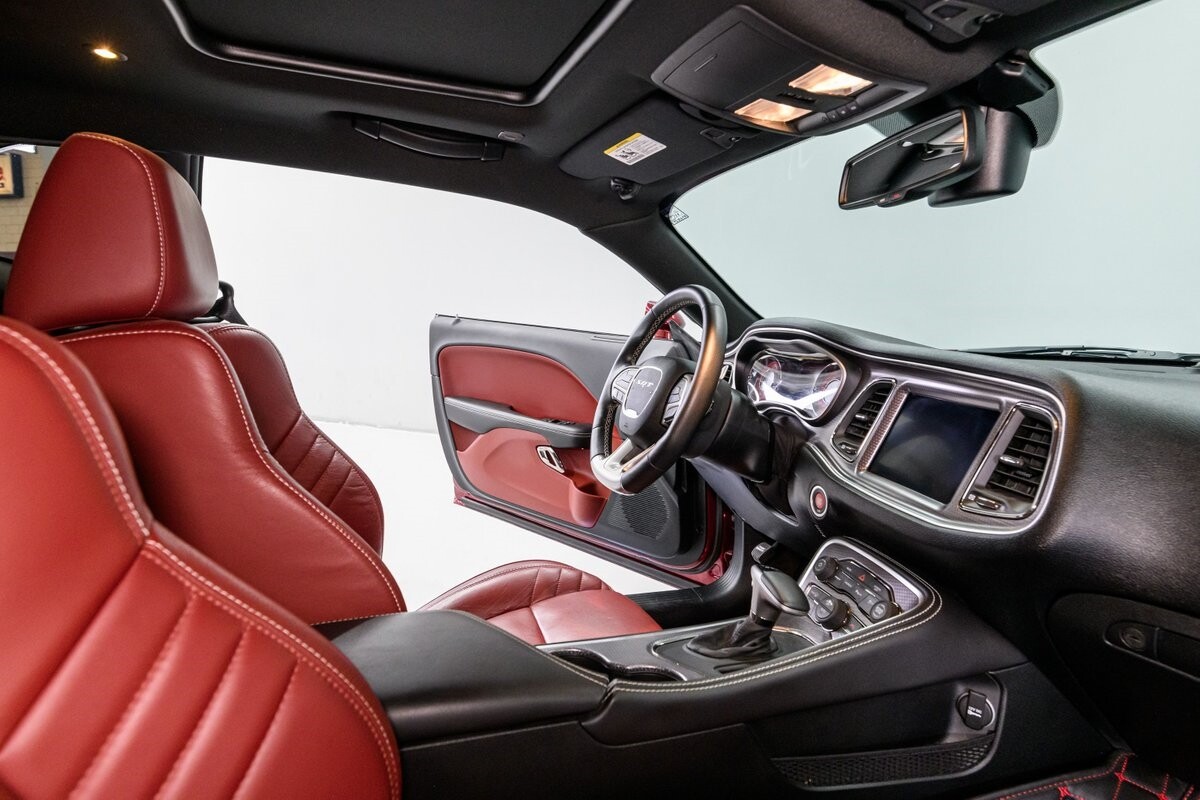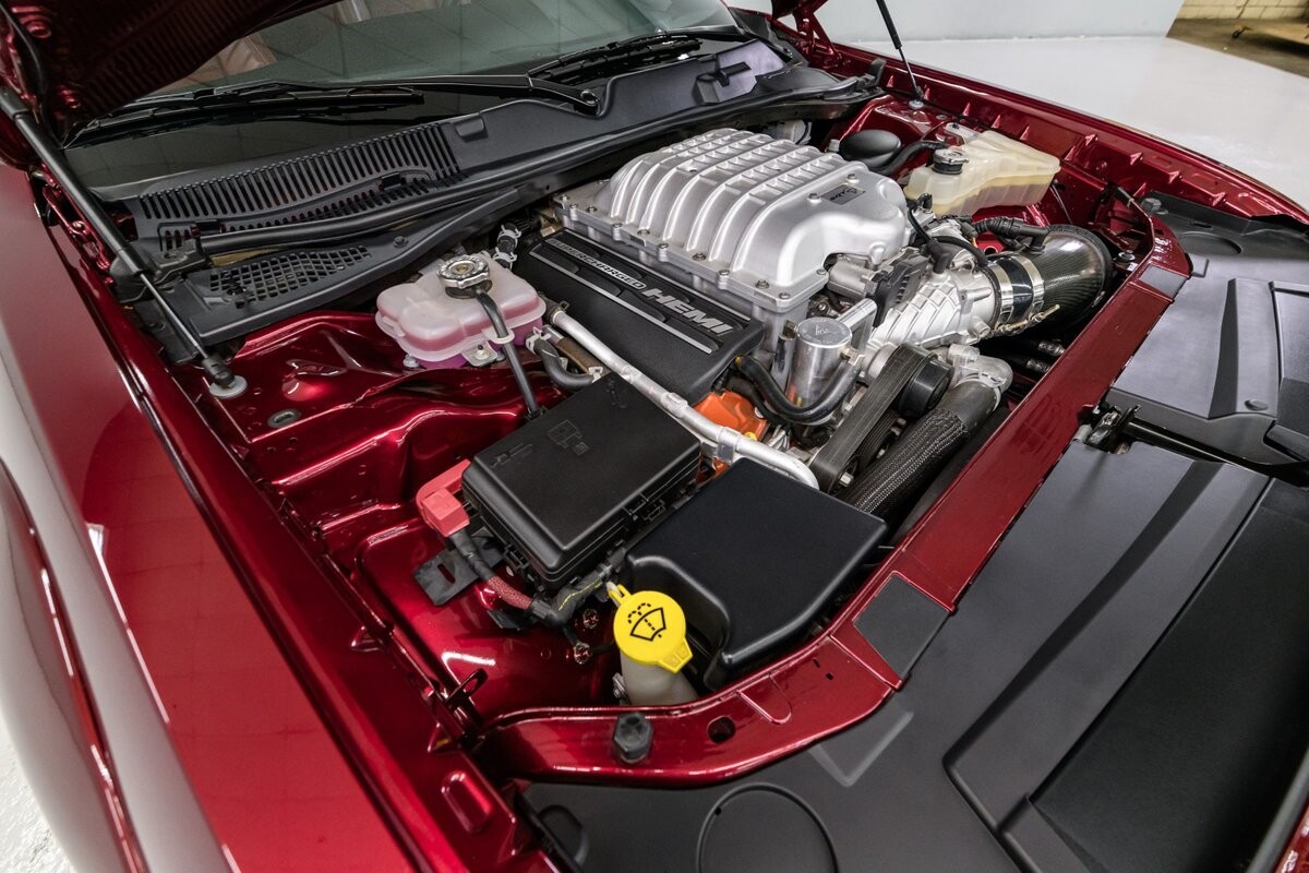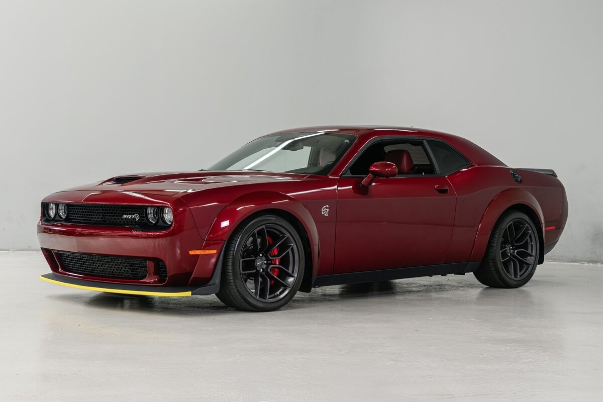 Following decades in retirement, the Challenger made a triumphant return to the Dodge lineup in 2008, followed in 2015 by the Challenger Hellcat SRT, a total performance package developed by Chrysler's Street and Racing Technology Group. This beautifully maintained, totally-original 1-owner 2018 Widebody Hellcat SRT is a rare, modern MOPAR classic with 13,100 miles on the odometer. (According to 'MOPAR Config Tree', this Challenger is said to be only 1 of 6 built with these options.) The Hellcat coupe is finished in Octane Red w/matte black accents - a very unique color combination that is factory-fresh and stunning. Dodge SRT Widebody 'Devil's' 20x11 forged wheels mount Pirelli P-Zero Z-rated radials. (Widebody option allowed for wider radials.) The beautiful exterior is paired with a Demonic Red Napa leather interior, also in virtually new condition. Comfort features include dual-zone climate control, handsome embossed heated/ventilated performance seats, power tinted windows, power sunroof, tilt wheel, power seats/locks, cruise and keyless entry. MOPAR's Uconnect infotainment system provides AM/FM/XM/HD sound along with Apple CarPlay, Android Auto and NAV. The system utilizes a Harman Kardon amp and an SRT instrument cluster includes a 8.4" driver information display.