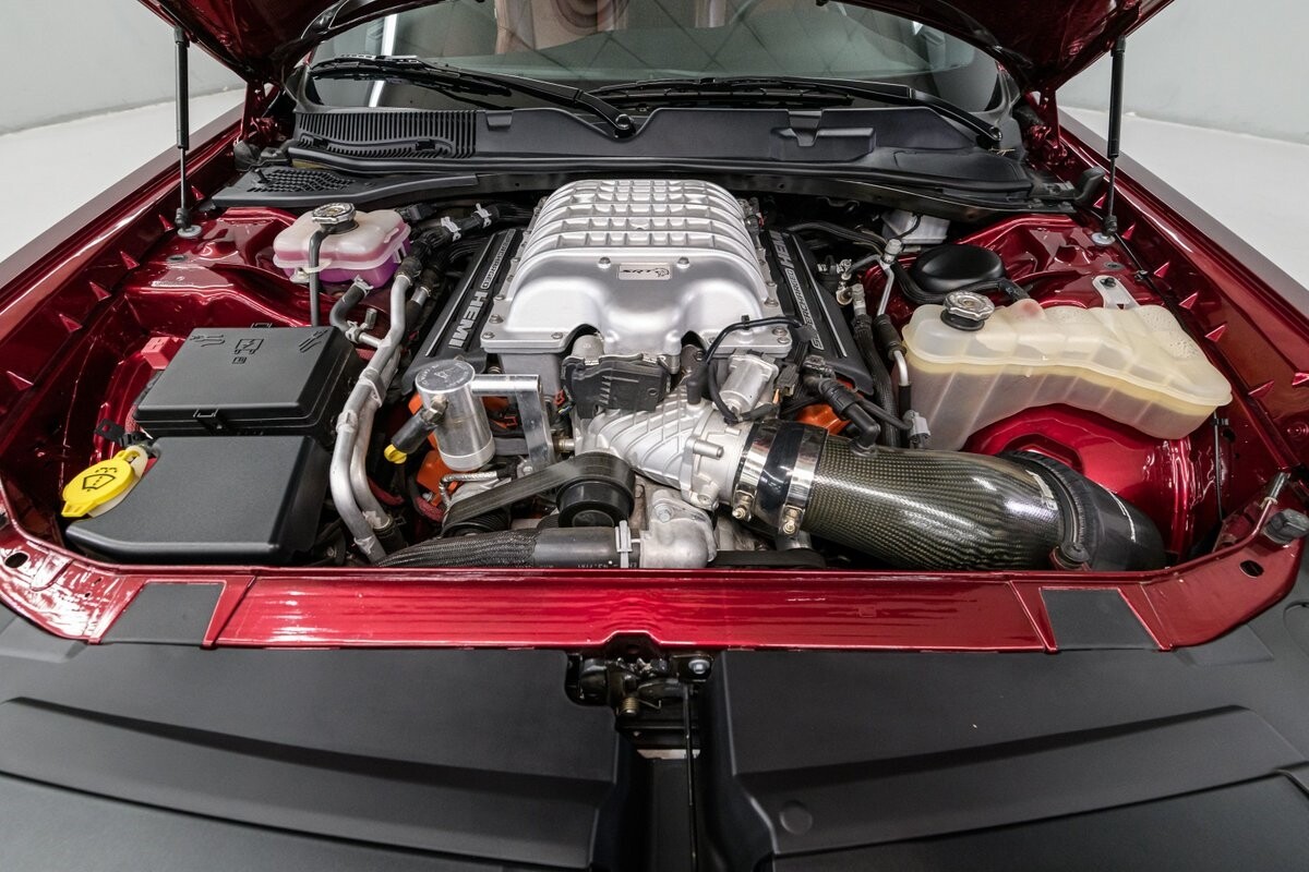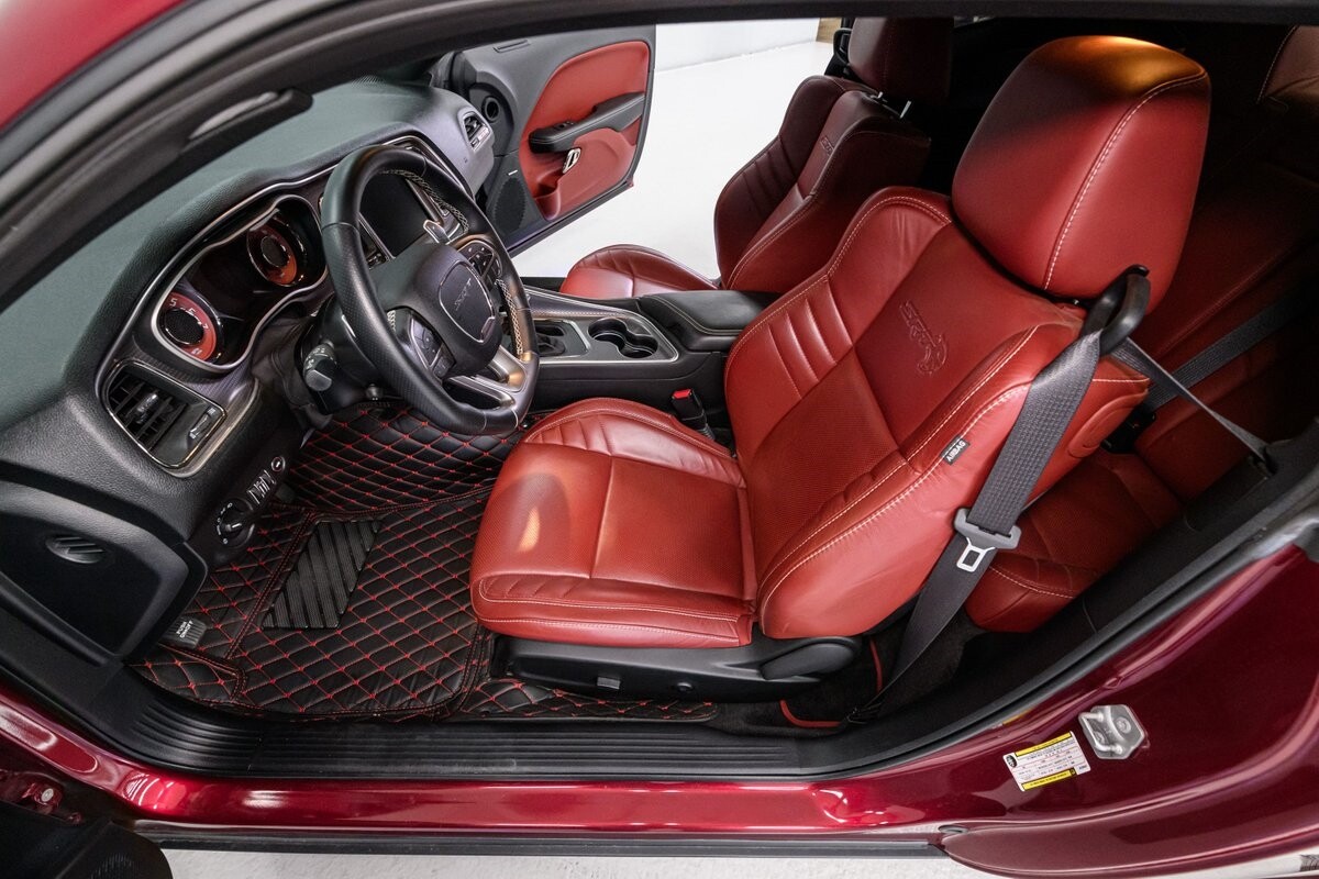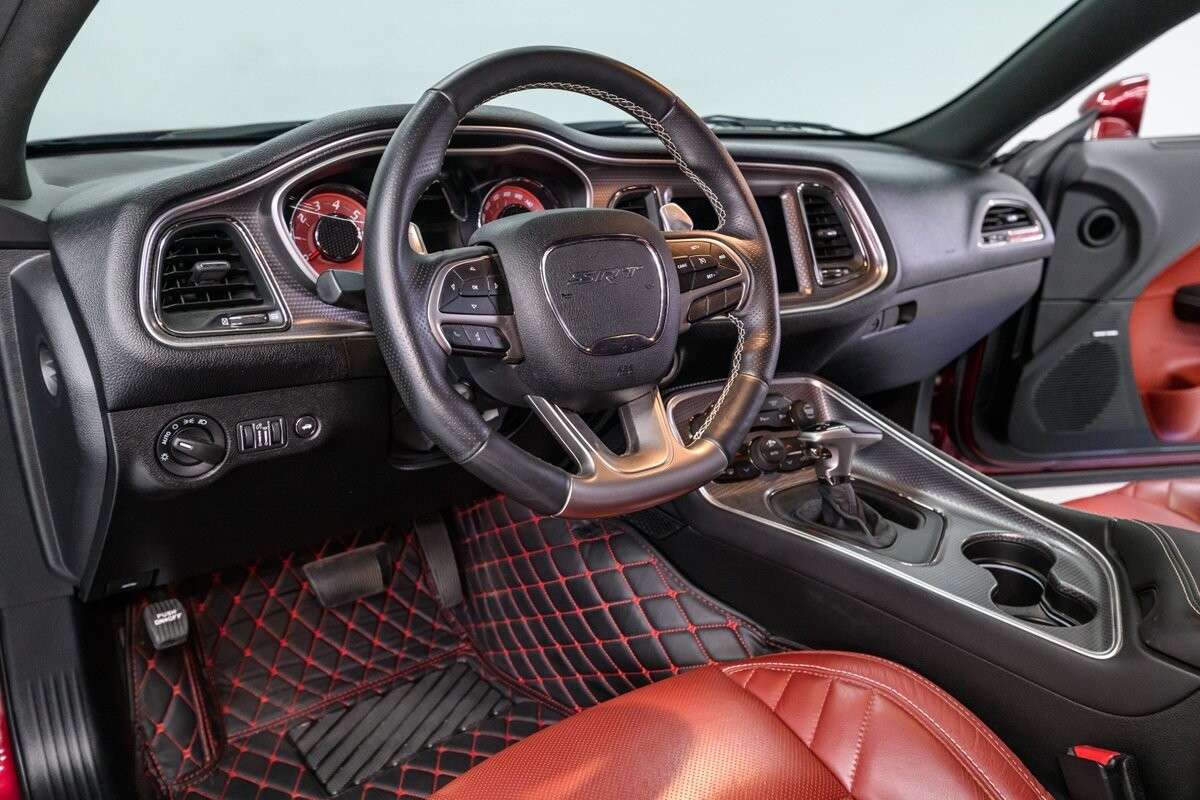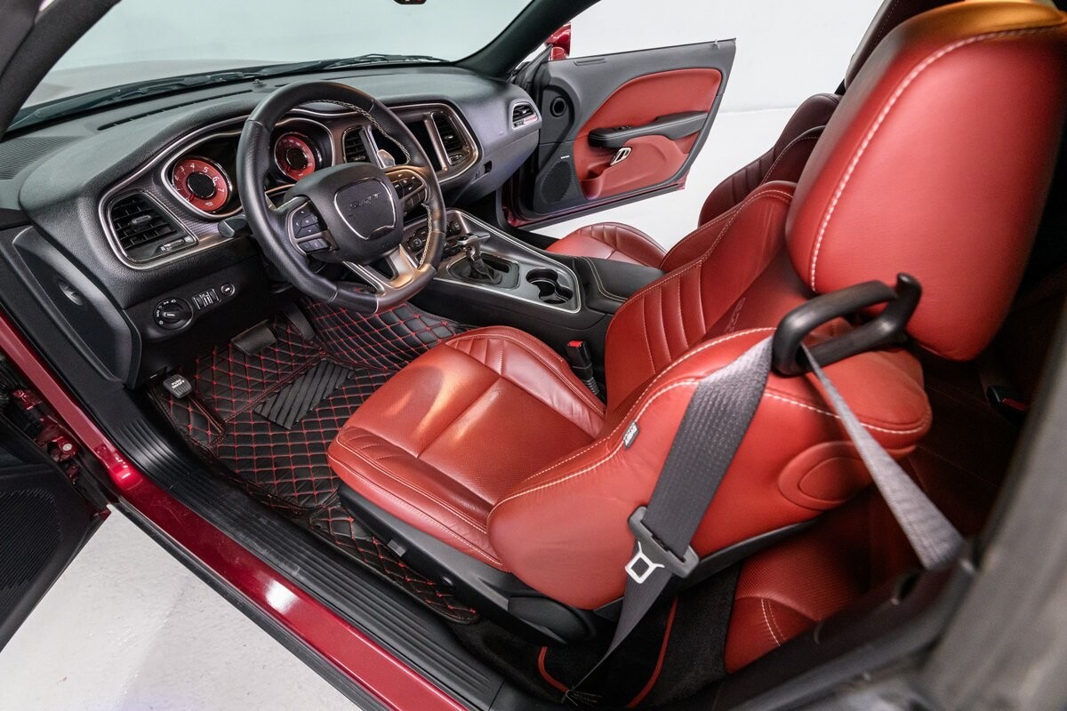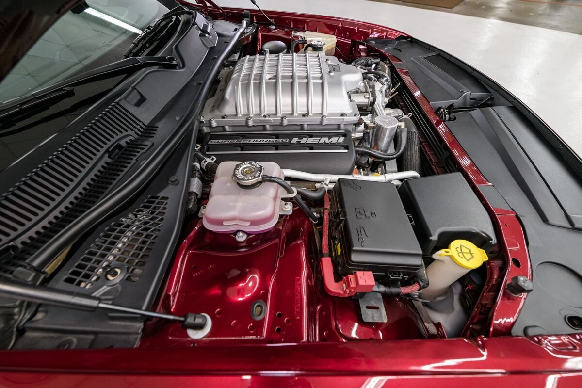 Following decades in retirement, the Challenger made a triumphant return to the Dodge lineup in 2008, followed in 2015 by the Challenger Hellcat SRT, a total performance package developed by Chrysler's Street and Racing Technology Group. This beautifully maintained, totally-original 1-owner 2018 Widebody Hellcat SRT is a rare, modern MOPAR classic with 13,100 miles on the odometer. (According to 'MOPAR Config Tree', this Challenger is said to be only 1 of 6 built with these options.) The Hellcat coupe is finished in Octane Red w/matte black accents - a very unique color combination that is factory-fresh and stunning. Dodge SRT Widebody 'Devil's' 20x11 forged wheels mount Pirelli P-Zero Z-rated radials. (Widebody option allowed for wider radials.) The beautiful exterior is paired with a Demonic Red Napa leather interior, also in virtually new condition. Comfort features include dual-zone climate control, handsome embossed heated/ventilated performance seats, power tinted windows, power sunroof, tilt wheel, power seats/locks, cruise and keyless entry. MOPAR's Uconnect infotainment system provides AM/FM/XM/HD sound along with Apple CarPlay, Android Auto and NAV. The system utilizes a Harman Kardon amp and an SRT instrument cluster includes a 8.4" driver information display.