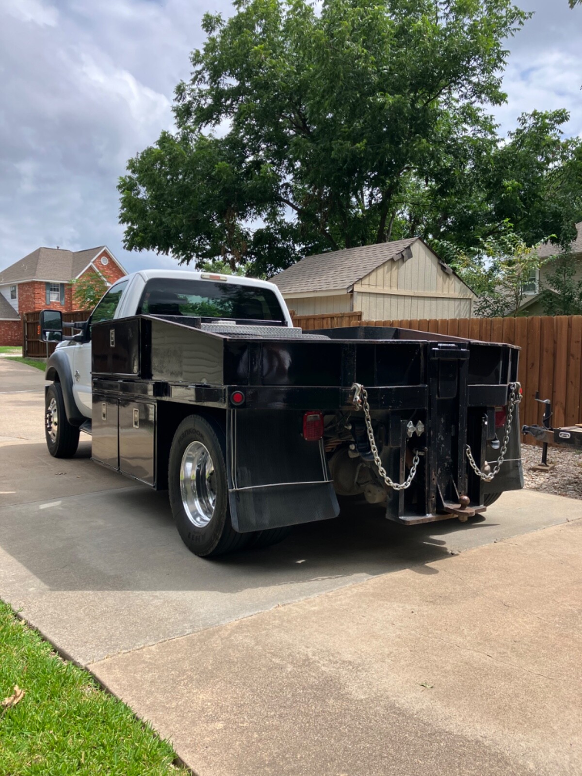 2014 Ford F-550 XLT 6.7 Diesel. Truck is E G R and D P F delete. Excellent Body. Very good interior. Bed is fair. White with black bed. Hydraulic lift. 50 gal. aux. fuel tank. 2000 watt invertor. Blue and white safety strobe lights in front. Recently polished aluminum wheels. New tires on front. Back tires good. ( Passed inspection last week ) Air, fuel, oil and filter recently changed and always performed at manufacturers recommended intervals at dealership. 214-679-1777..