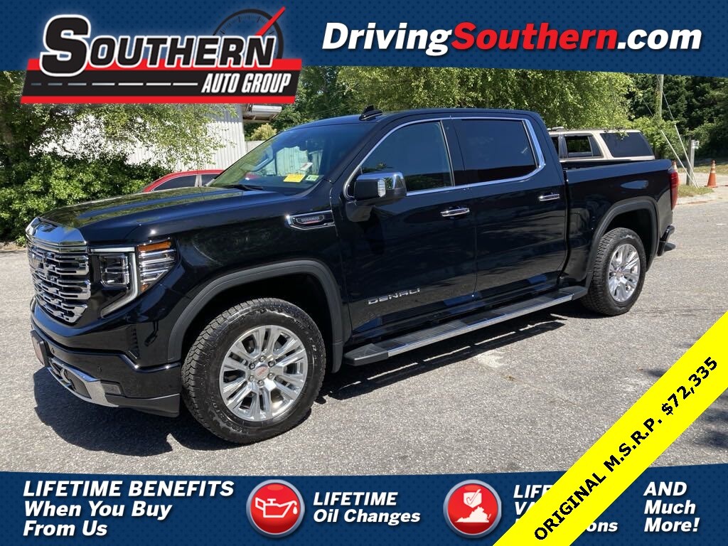CARFAX One-Owner. Clean CARFAX. Certified. Onyx Black 2023 GMC Sierra 1500 Denali 4WD 10-Speed Automatic 3.0L I6 CLEAN CARFAX 1 OWNER, GMC CERTIFIED, AWD/4WD, BACKUP CAMERA, BLUETOOTH, LEATHER SEATS, NAVIGATION SYSTEM, POWER PACKAGE, REMOTE START, REMOTE VEHICLE STARTER PREP PACKAGE, KEYLESS ENTRY, NAVIGATION, PUSH BUTTON START, 120-Volt Bed Mounted Power Outlet, 2 USB Ports, 4-Wheel Disc Brakes, 7 Speakers, Adaptive suspension, Air Conditioning, AM/FM radio, Automatic temperature control, Driver Memory, Electric Rear-Window Defogger, Front wheel independent suspension, Low tire pressure warning, Memory seat, Power driver seat, Power Front Passenger Windows w/Express Up/Down, Power Front Windows w/Driver Express Up/Down, Power Rear Windows w/Express Down, Power steering, Power windows, Push Button Start, Radio: Premium GMC Infotainment Audio System, Rear window defroster, SiriusXM w/360L, Steering Wheel Audio Controls, Telescoping steering wheel, Traction control, Trailer Side Blind Zone Alert, Trip computer, Voltmeter, Wi-Fi Hotspot Capable, Wireless Phone Projection.