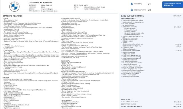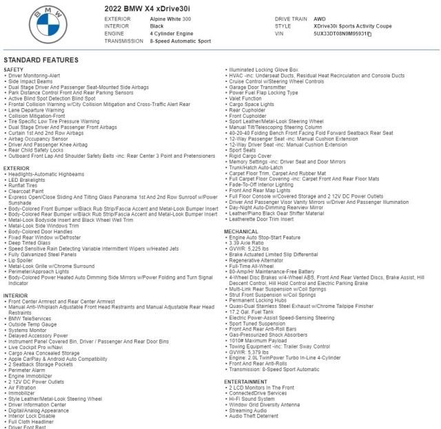 $53,840 ORIGINAL MSRP!! 2022 BMW X4 XDRIVE30I AWD, ALPINE WHITE, BLACK INTERIOR, PREMIUM PACKAGE 2, GESTURE CONTROL, HEATED FRONT SEATS W/ DRIVER LUMBAR, COMFORT ACCESS KEYLESS ENTRY, HEATED STEERING WHEEL, 19-INCH WHEELS, AMBIENT LIGHTING, SATELLITE RADIO, ACTIVE BLIND SPOT DETECTION, FRONT COLLISION WARNING W/ CITY MITIGATION, WIFI HOTSPOT, APPLE CARPLAY, ENHANCED BLUETOOTH & SMARTPHONE IN, CONNECTED PACKAGE PRO, NAVIGATION, HI-FI SOUND SYSTEM, ACTIVE DRIVING ASSISTANT, MOONROOF, CLEAN CARFAX!! This vehicle will be reviewed by an independent certified mechanic in accordance with PA state inspection regulations. If for any reason this vehicle does not pass inspection it will be noted. !!PLEASE CONTACT OUR SALES TEAM AT 877-864-0274 WITH ANY QUESTIONS!! We are pleased to show you another great opportunity! Sky Motor Cars is in the wholesale business and that represents the majority of what we do. When we have a vehicle this nice we present it to the public. Our turn time is quick and depending on auction schedules we may end listings early and take the vehicle to a dealer-only auction. Do not hesitate if you are interested! We have supplied many detailed photos to give you an accurate sense of just how nice this one is! !!A VARIETY OF EXTENDED WARRANTY OPTIONS ARE AVAILABLE!! !!NATIONWIDE SHIPPING & FINANCING ARE AVAILABLE!! This is a previously enjoyed vehicle so there MAY be a few light scratches and small chips around the vehicle. Please study the photos provided. Anything unusual or significant will be shown in the pictures. PLEASE NOTE THAT UNLESS SPECIFIED OUR VEHICLES ARE NOT MATTE-FINISHED. THE PICTURES OFTEN SHOW THE REFLECTION OF OUR PHOTO BOOTH CURTAINS IN SHINY PAINT AND THAT CAN MAKE THE FINISH APPEAR DULL. Also, note there are many shadows cast on the vehicle due to the conditions in which the photos were taken. If you are unclear of anything please contact us PRIOR to purchasing!