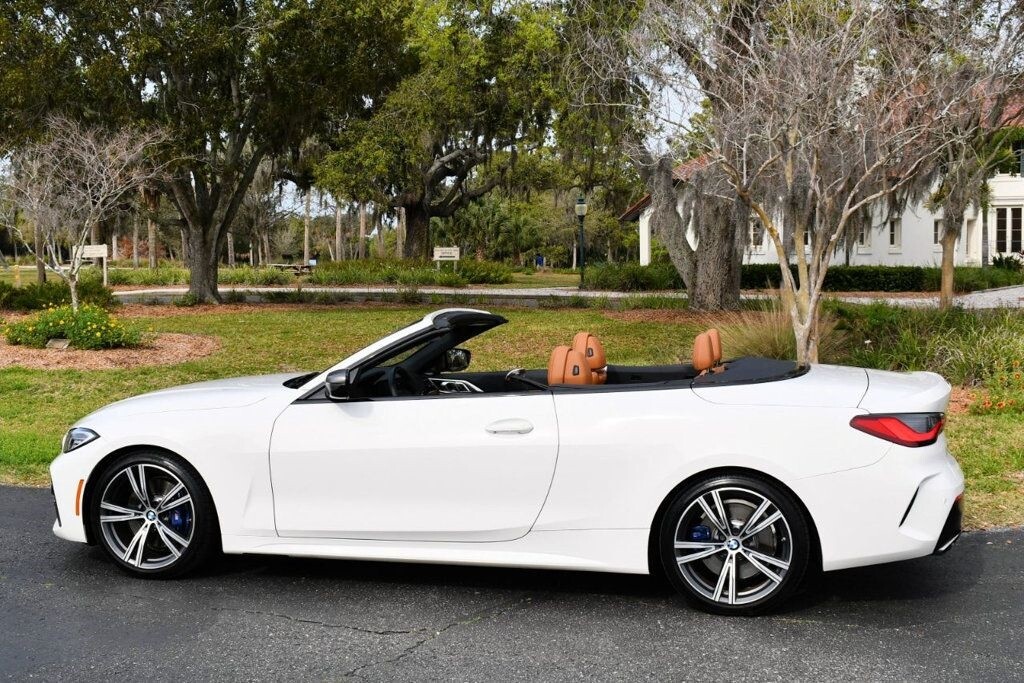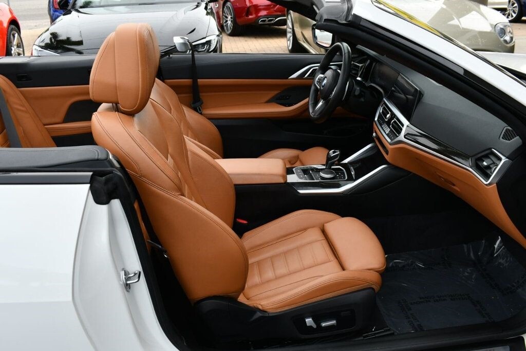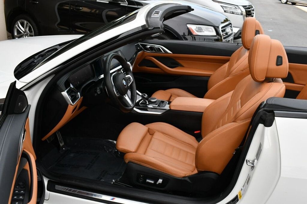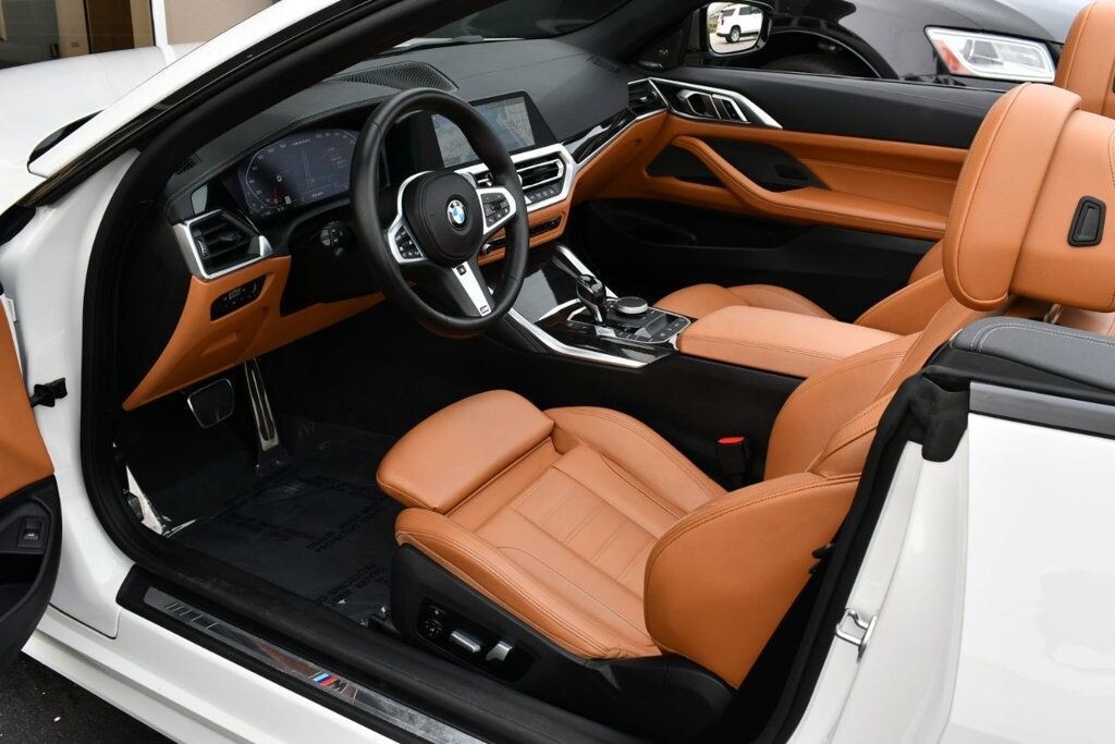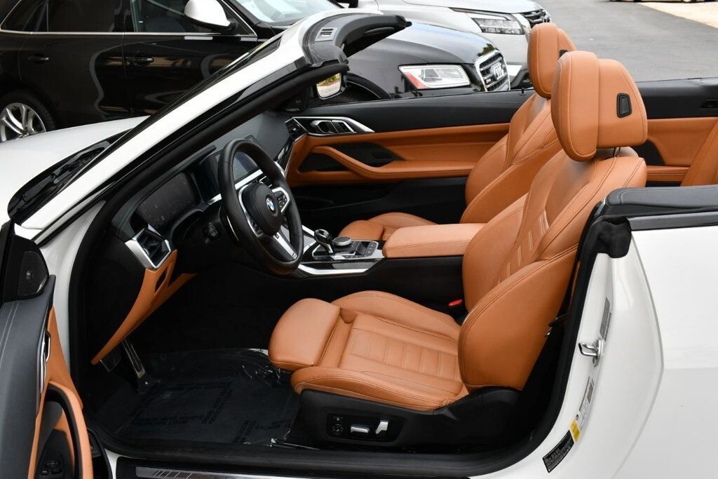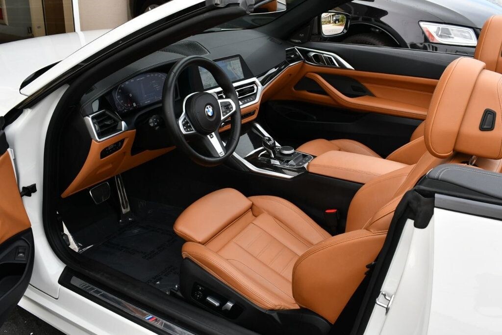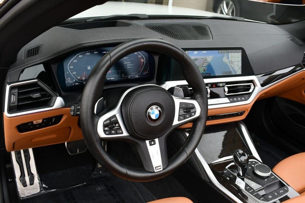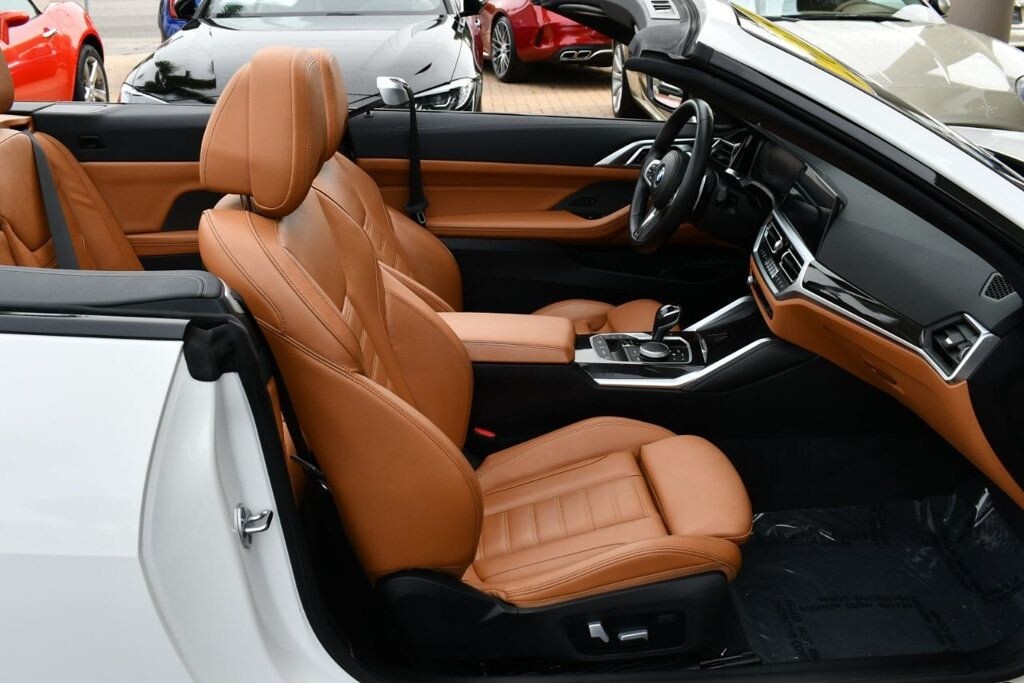 This 2021 BMW 4 Series 2dr M440i 2-Door Convertible with Premium Package and Navigation features a 3.0L STRAIGHT 6 CYLINDER 6cyl Gasoline engine. It is equipped with a 8 Speed Automatic transmission. The vehicle is Alpine White with a Cognac with Contrast Stitch Leather interior. It is offered with the remaining factory warranty. - Air Conditioning, Climate Control, Dual Zone Climate Control, Cruise Control, Power Steering, Power Windows, Power Door Locks, Power Mirrors, Leather Steering Wheel, Power Drivers Seat, Power Passenger Seat, Memory Seat Position, Rear Air Conditioning, Wood Trim, Clock, Tachometer, Digital Info Center, Homelink System, Tilt Steering Wheel, Telescoping Steering Wheel, Steering Wheel Radio Controls, Driver Airbag, Passenger Airbag, Side Airbags, Keyless Entry, Security System, Traction Control, Rear Defogger, Intermittent Wipers, AM/FM, Anti-Theft, Leather Interior Surface, Apple CarPlay, Blind Spot Monitor, Bluetooth, Carpeted Floor Mats, Center Arm Rest, Center Console, Collision Avoidance System, Cup Holders, Daytime Running Lights, Forward Collision Warning, Front Heated Seats, Heads Up Display, Heated Mirrors, Heated Steering Wheel, Lane Departure Warning, Lane Keep Assist, LED Headlights/Fog Lights, Navigation System, Overhead Console, Parking Sensors, Power Brakes, Premium Alloy Wheels, Premium Sound, Rain Sensing Wipers, Remote Start, Reverse Camera, Roll Stability Control, Sliding Rear Window, Sport Seats, Tire Pressure Monitor, Vanity Mirrors -