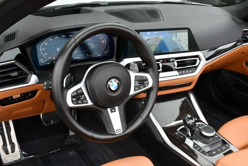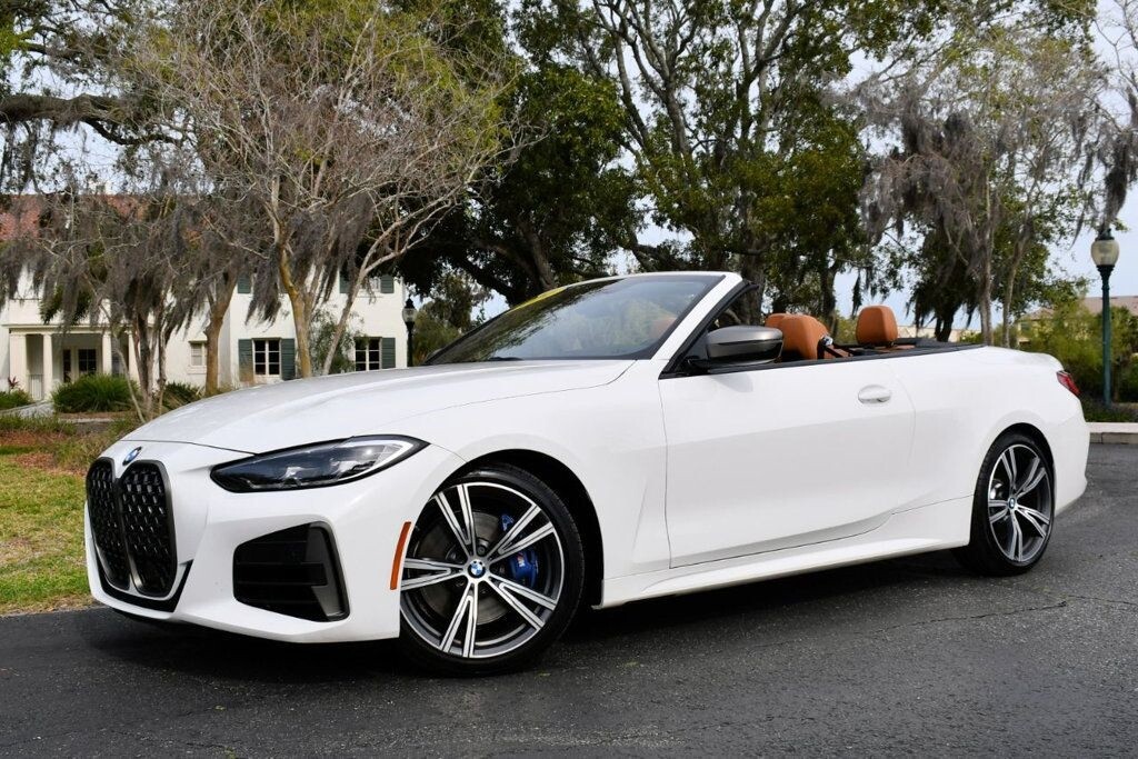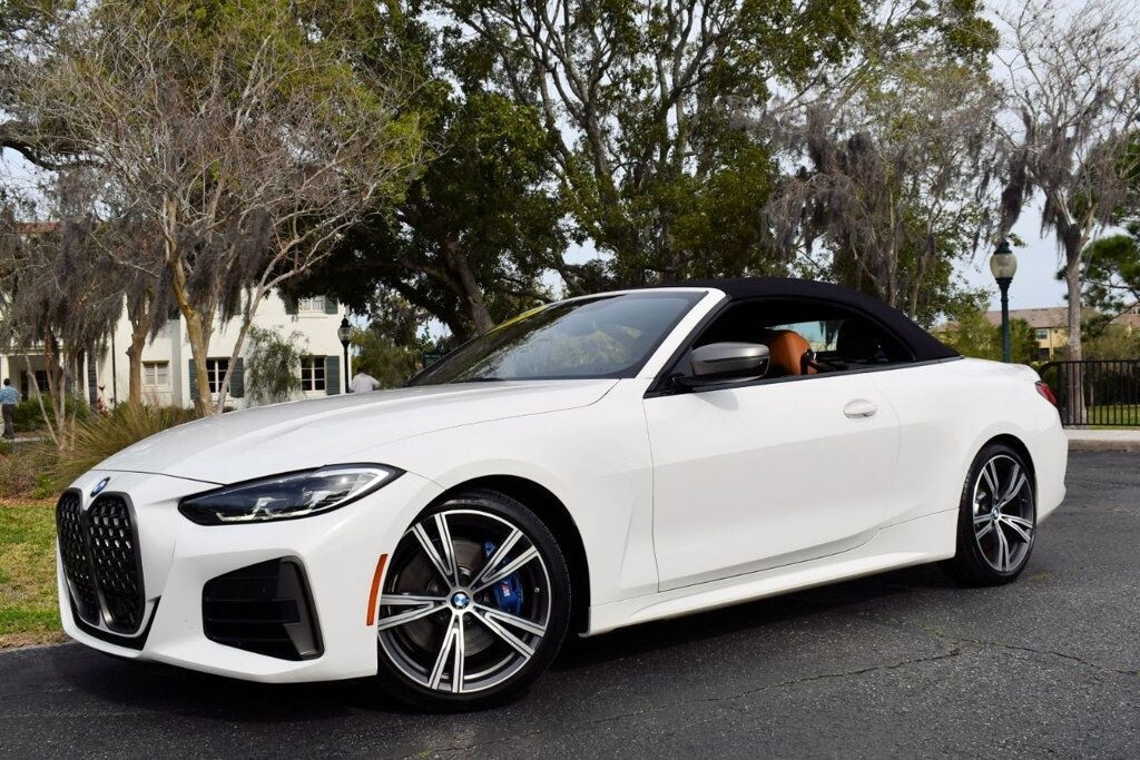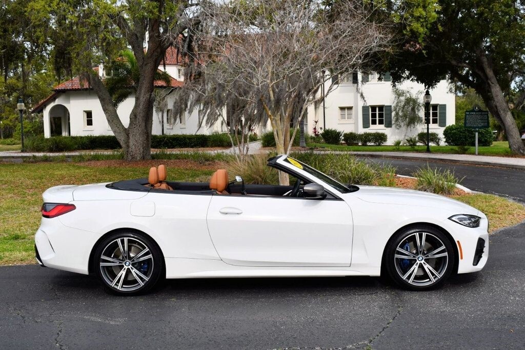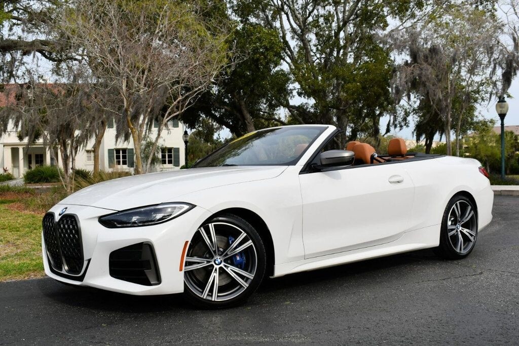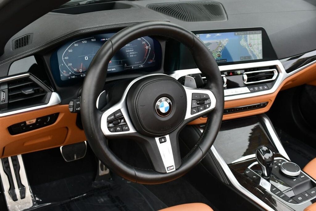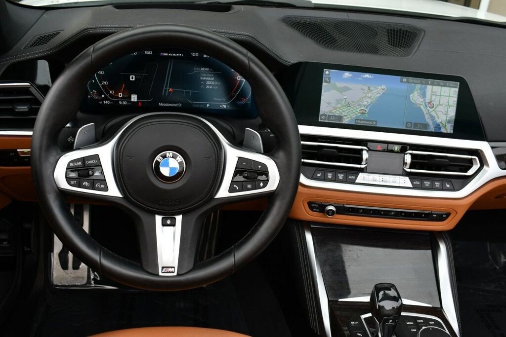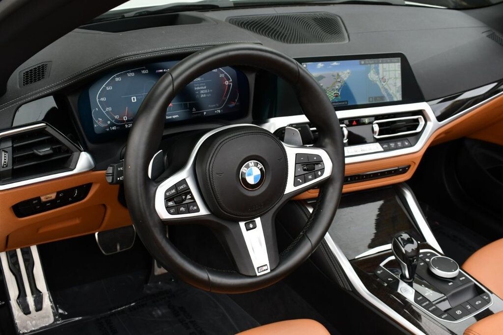 This 2021 BMW 4 Series 2dr M440i 2-Door Convertible with Premium Package and Navigation features a 3.0L STRAIGHT 6 CYLINDER 6cyl Gasoline engine. It is equipped with a 8 Speed Automatic transmission. The vehicle is Alpine White with a Cognac with Contrast Stitch Leather interior. It is offered with the remaining factory warranty. - Air Conditioning, Climate Control, Dual Zone Climate Control, Cruise Control, Power Steering, Power Windows, Power Door Locks, Power Mirrors, Leather Steering Wheel, Power Drivers Seat, Power Passenger Seat, Memory Seat Position, Rear Air Conditioning, Wood Trim, Clock, Tachometer, Digital Info Center, Homelink System, Tilt Steering Wheel, Telescoping Steering Wheel, Steering Wheel Radio Controls, Driver Airbag, Passenger Airbag, Side Airbags, Keyless Entry, Security System, Traction Control, Rear Defogger, Intermittent Wipers, AM/FM, Anti-Theft, Leather Interior Surface, Apple CarPlay, Blind Spot Monitor, Bluetooth, Carpeted Floor Mats, Center Arm Rest, Center Console, Collision Avoidance System, Cup Holders, Daytime Running Lights, Forward Collision Warning, Front Heated Seats, Heads Up Display, Heated Mirrors, Heated Steering Wheel, Lane Departure Warning, Lane Keep Assist, LED Headlights/Fog Lights, Navigation System, Overhead Console, Parking Sensors, Power Brakes, Premium Alloy Wheels, Premium Sound, Rain Sensing Wipers, Remote Start, Reverse Camera, Roll Stability Control, Sliding Rear Window, Sport Seats, Tire Pressure Monitor, Vanity Mirrors -