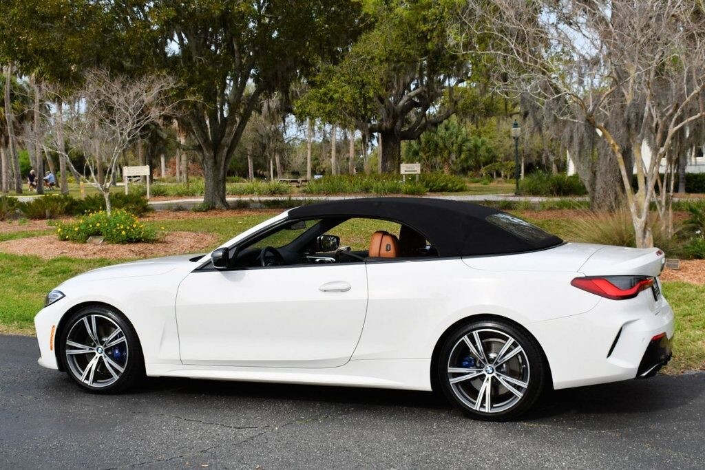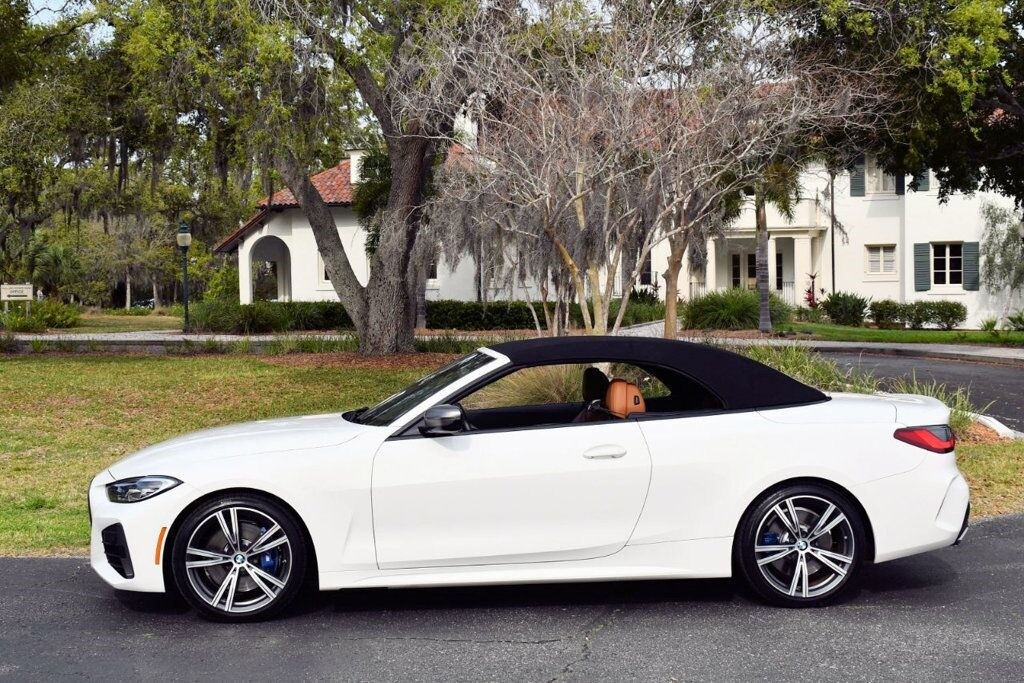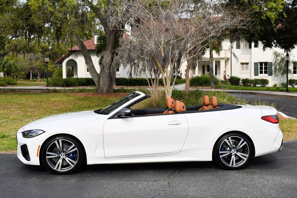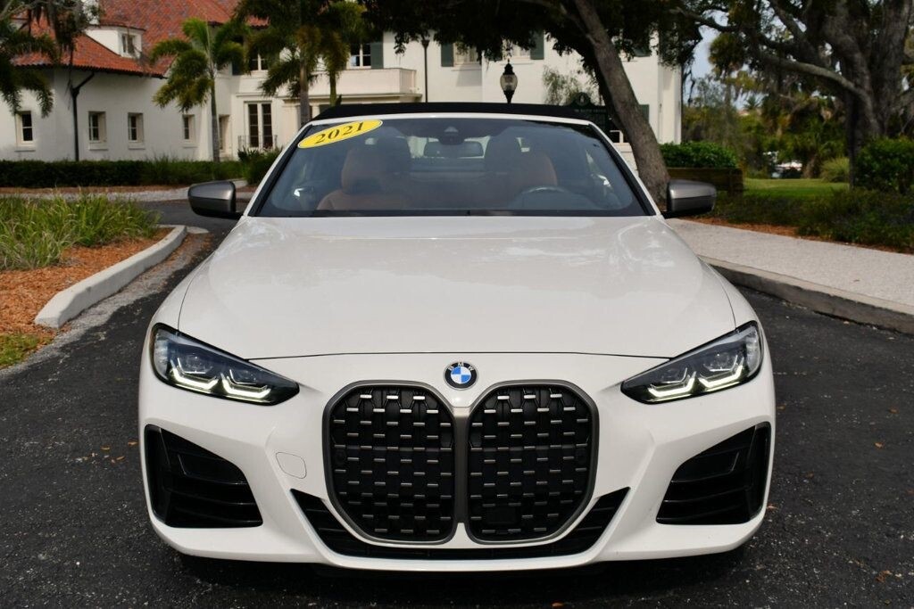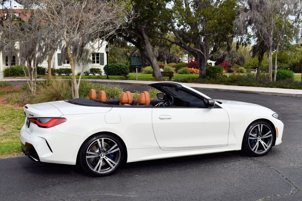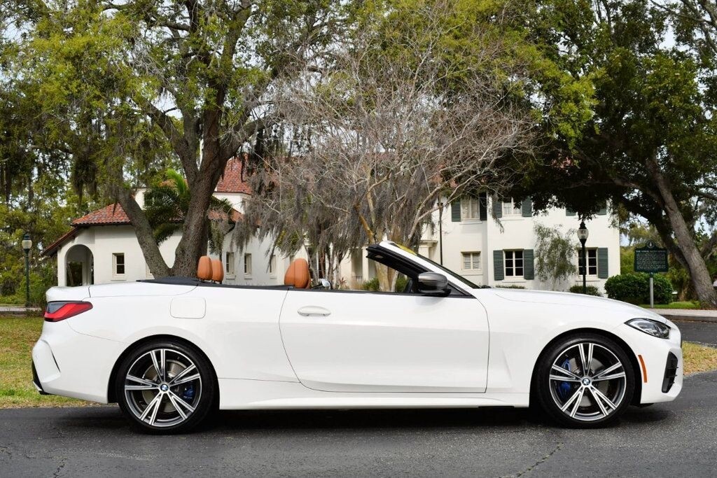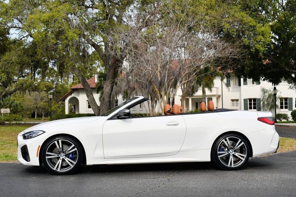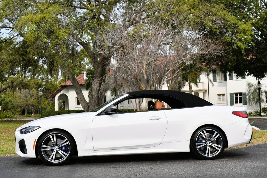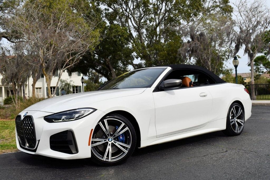 This 2021 BMW 4 Series 2dr M440i 2-Door Convertible with Premium Package and Navigation features a 3.0L STRAIGHT 6 CYLINDER 6cyl Gasoline engine. It is equipped with a 8 Speed Automatic transmission. The vehicle is Alpine White with a Cognac with Contrast Stitch Leather interior. It is offered with the remaining factory warranty. - Air Conditioning, Climate Control, Dual Zone Climate Control, Cruise Control, Power Steering, Power Windows, Power Door Locks, Power Mirrors, Leather Steering Wheel, Power Drivers Seat, Power Passenger Seat, Memory Seat Position, Rear Air Conditioning, Wood Trim, Clock, Tachometer, Digital Info Center, Homelink System, Tilt Steering Wheel, Telescoping Steering Wheel, Steering Wheel Radio Controls, Driver Airbag, Passenger Airbag, Side Airbags, Keyless Entry, Security System, Traction Control, Rear Defogger, Intermittent Wipers, AM/FM, Anti-Theft, Leather Interior Surface, Apple CarPlay, Blind Spot Monitor, Bluetooth, Carpeted Floor Mats, Center Arm Rest, Center Console, Collision Avoidance System, Cup Holders, Daytime Running Lights, Forward Collision Warning, Front Heated Seats, Heads Up Display, Heated Mirrors, Heated Steering Wheel, Lane Departure Warning, Lane Keep Assist, LED Headlights/Fog Lights, Navigation System, Overhead Console, Parking Sensors, Power Brakes, Premium Alloy Wheels, Premium Sound, Rain Sensing Wipers, Remote Start, Reverse Camera, Roll Stability Control, Sliding Rear Window, Sport Seats, Tire Pressure Monitor, Vanity Mirrors -