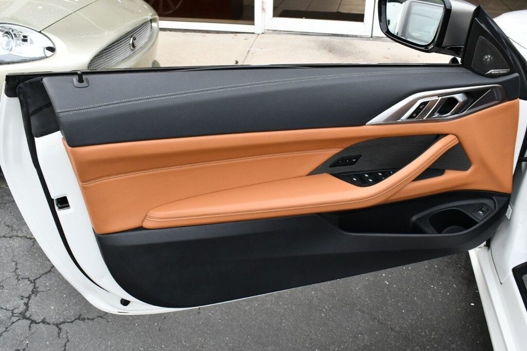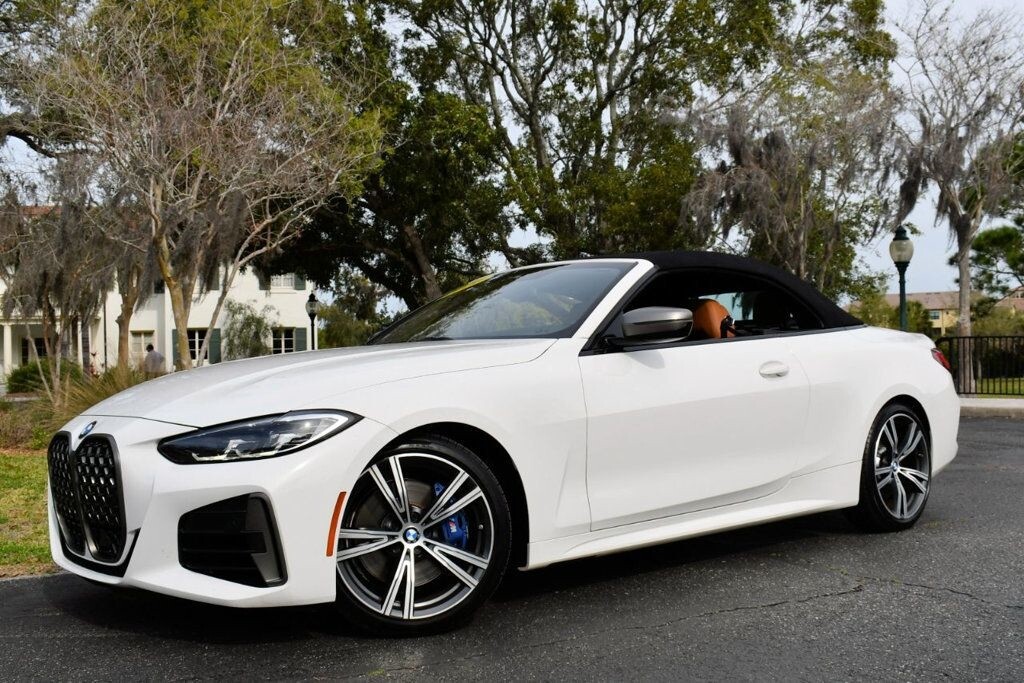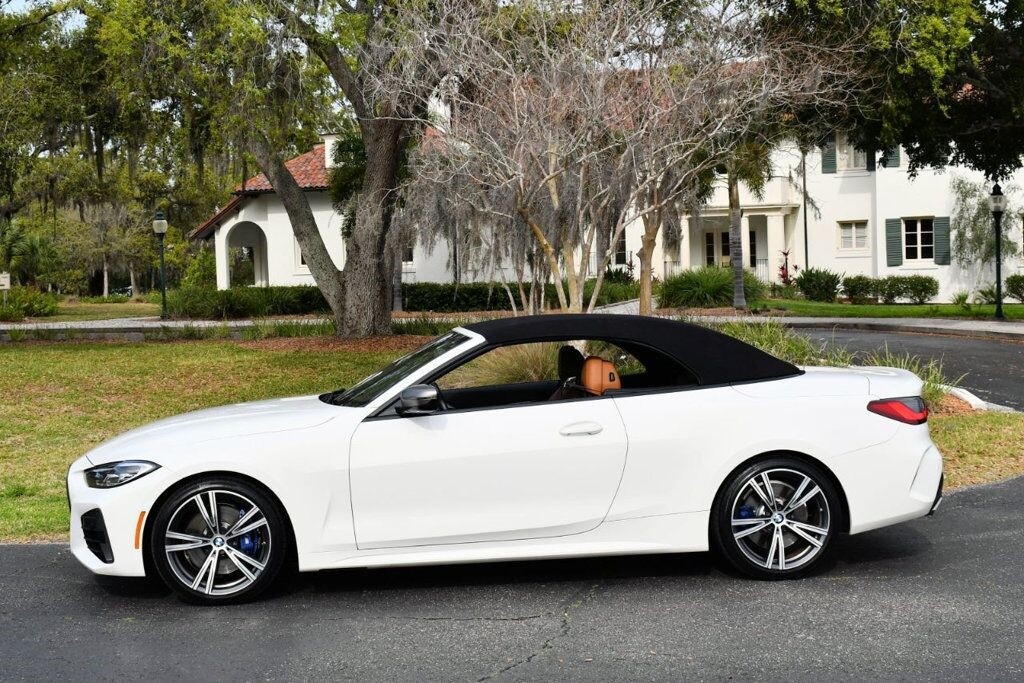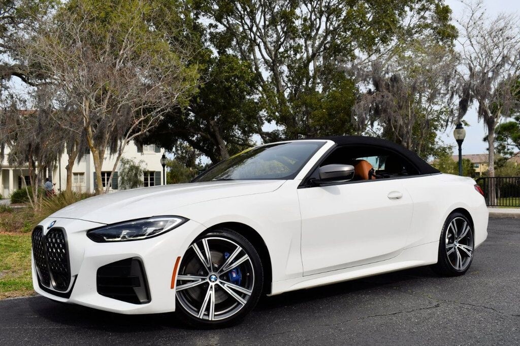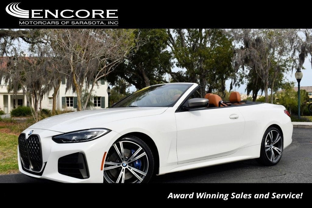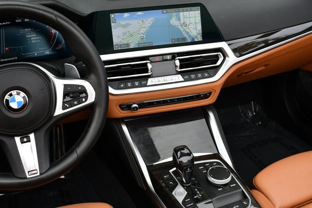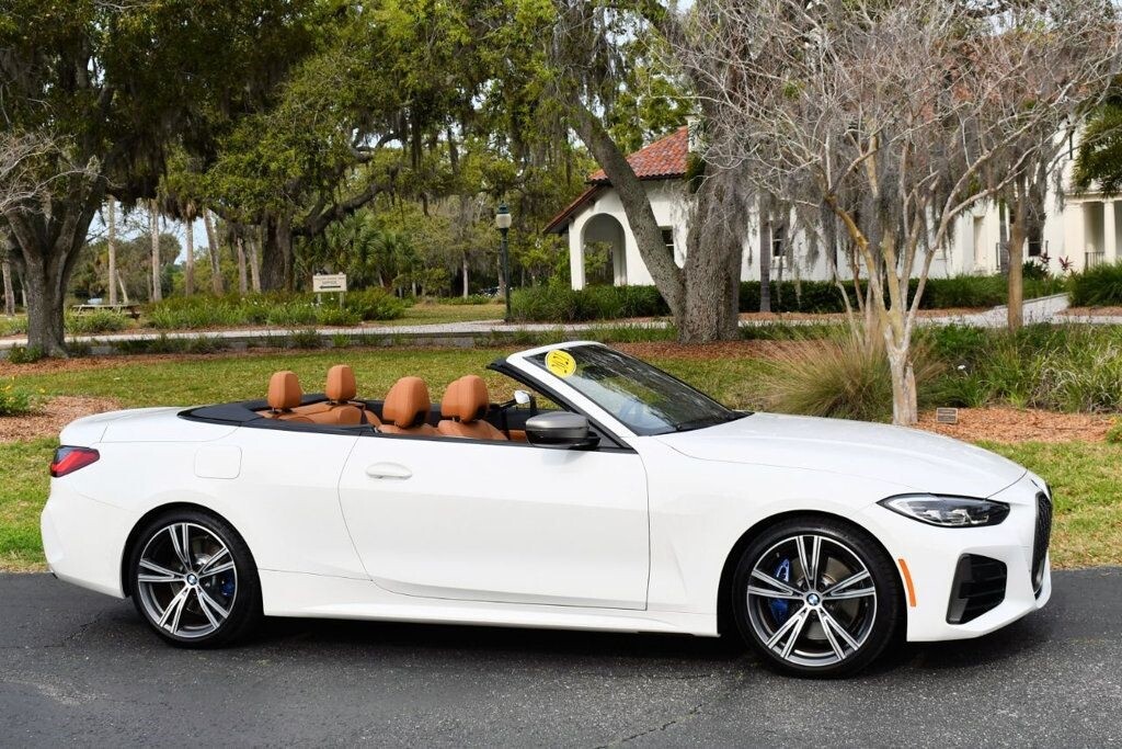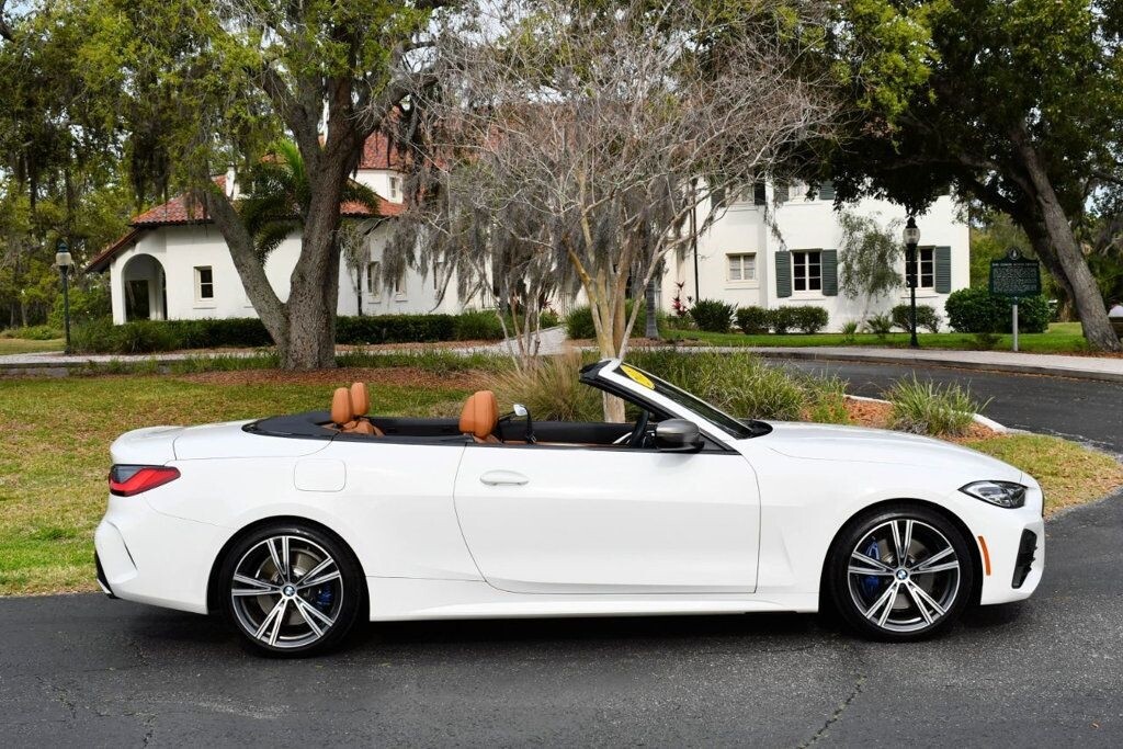 This 2021 BMW 4 Series 2dr M440i 2-Door Convertible with Premium Package and Navigation features a 3.0L STRAIGHT 6 CYLINDER 6cyl Gasoline engine. It is equipped with a 8 Speed Automatic transmission. The vehicle is Alpine White with a Cognac with Contrast Stitch Leather interior. It is offered with the remaining factory warranty. - Air Conditioning, Climate Control, Dual Zone Climate Control, Cruise Control, Power Steering, Power Windows, Power Door Locks, Power Mirrors, Leather Steering Wheel, Power Drivers Seat, Power Passenger Seat, Memory Seat Position, Rear Air Conditioning, Wood Trim, Clock, Tachometer, Digital Info Center, Homelink System, Tilt Steering Wheel, Telescoping Steering Wheel, Steering Wheel Radio Controls, Driver Airbag, Passenger Airbag, Side Airbags, Keyless Entry, Security System, Traction Control, Rear Defogger, Intermittent Wipers, AM/FM, Anti-Theft, Leather Interior Surface, Apple CarPlay, Blind Spot Monitor, Bluetooth, Carpeted Floor Mats, Center Arm Rest, Center Console, Collision Avoidance System, Cup Holders, Daytime Running Lights, Forward Collision Warning, Front Heated Seats, Heads Up Display, Heated Mirrors, Heated Steering Wheel, Lane Departure Warning, Lane Keep Assist, LED Headlights/Fog Lights, Navigation System, Overhead Console, Parking Sensors, Power Brakes, Premium Alloy Wheels, Premium Sound, Rain Sensing Wipers, Remote Start, Reverse Camera, Roll Stability Control, Sliding Rear Window, Sport Seats, Tire Pressure Monitor, Vanity Mirrors -