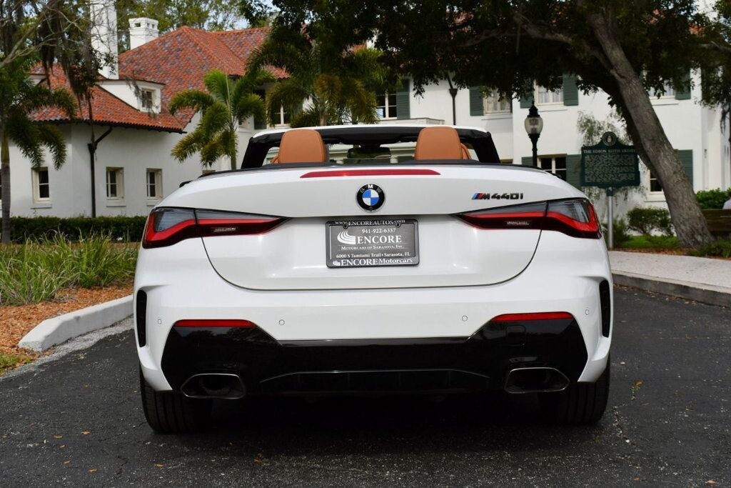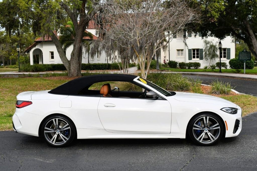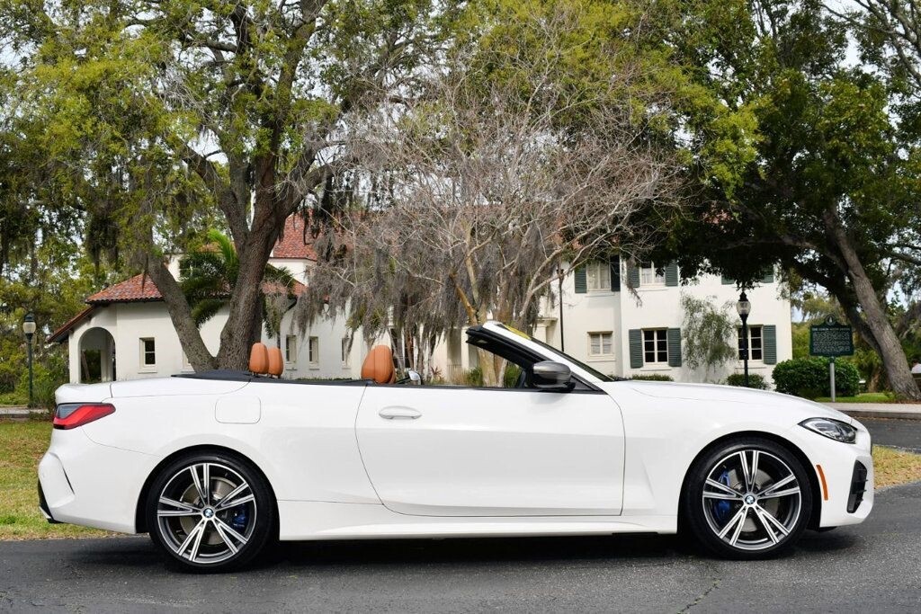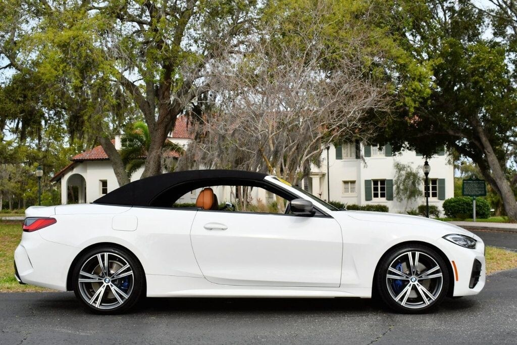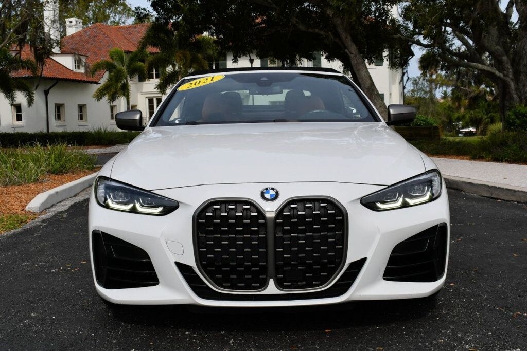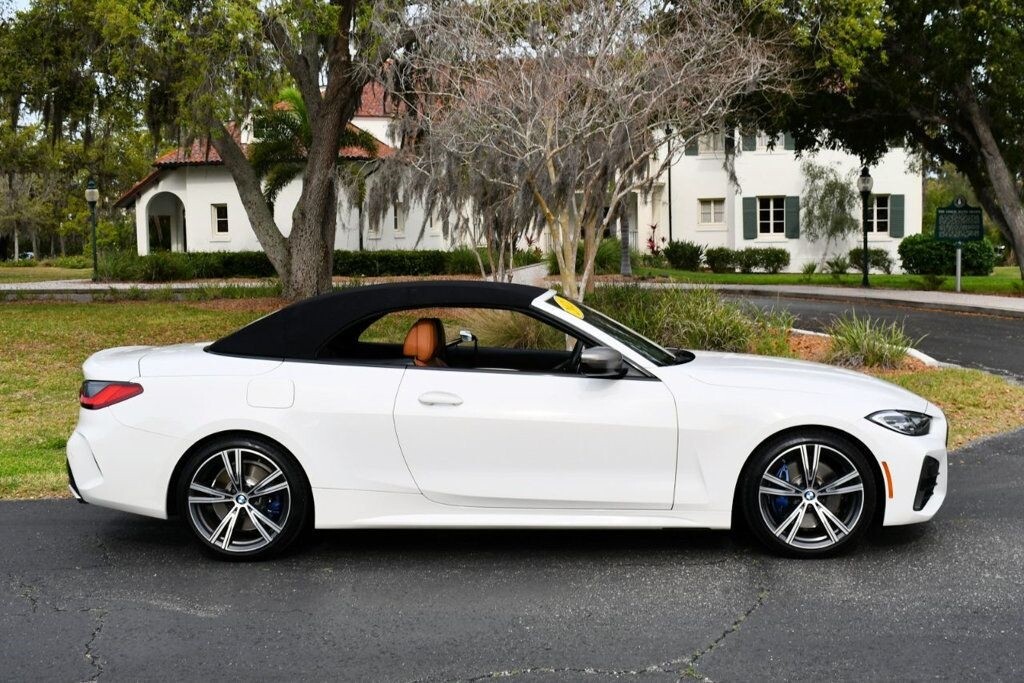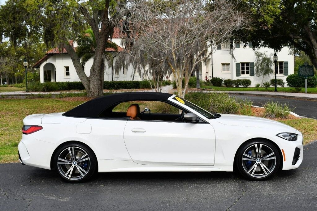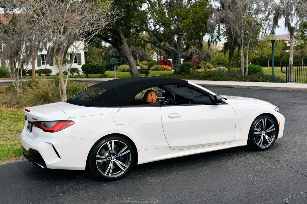This 2021 BMW 4 Series 2dr M440i 2-Door Convertible with Premium Package and Navigation features a 3.0L STRAIGHT 6 CYLINDER 6cyl Gasoline engine. It is equipped with a 8 Speed Automatic transmission. The vehicle is Alpine White with a Cognac with Contrast Stitch Leather interior. It is offered with the remaining factory warranty. - Air Conditioning, Climate Control, Dual Zone Climate Control, Cruise Control, Power Steering, Power Windows, Power Door Locks, Power Mirrors, Leather Steering Wheel, Power Drivers Seat, Power Passenger Seat, Memory Seat Position, Rear Air Conditioning, Wood Trim, Clock, Tachometer, Digital Info Center, Homelink System, Tilt Steering Wheel, Telescoping Steering Wheel, Steering Wheel Radio Controls, Driver Airbag, Passenger Airbag, Side Airbags, Keyless Entry, Security System, Traction Control, Rear Defogger, Intermittent Wipers, AM/FM, Anti-Theft, Leather Interior Surface, Apple CarPlay, Blind Spot Monitor, Bluetooth, Carpeted Floor Mats, Center Arm Rest, Center Console, Collision Avoidance System, Cup Holders, Daytime Running Lights, Forward Collision Warning, Front Heated Seats, Heads Up Display, Heated Mirrors, Heated Steering Wheel, Lane Departure Warning, Lane Keep Assist, LED Headlights/Fog Lights, Navigation System, Overhead Console, Parking Sensors, Power Brakes, Premium Alloy Wheels, Premium Sound, Rain Sensing Wipers, Remote Start, Reverse Camera, Roll Stability Control, Sliding Rear Window, Sport Seats, Tire Pressure Monitor, Vanity Mirrors -