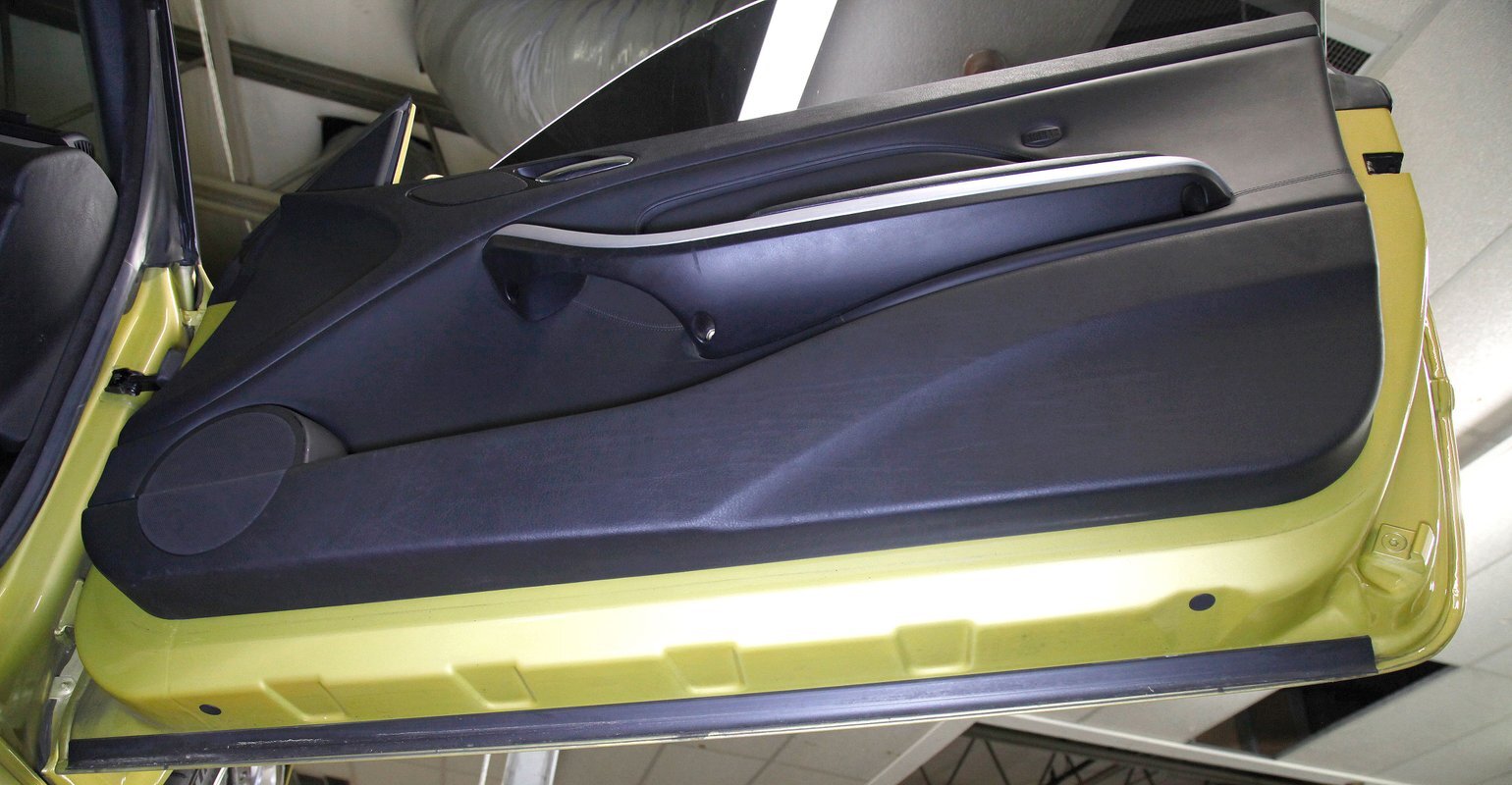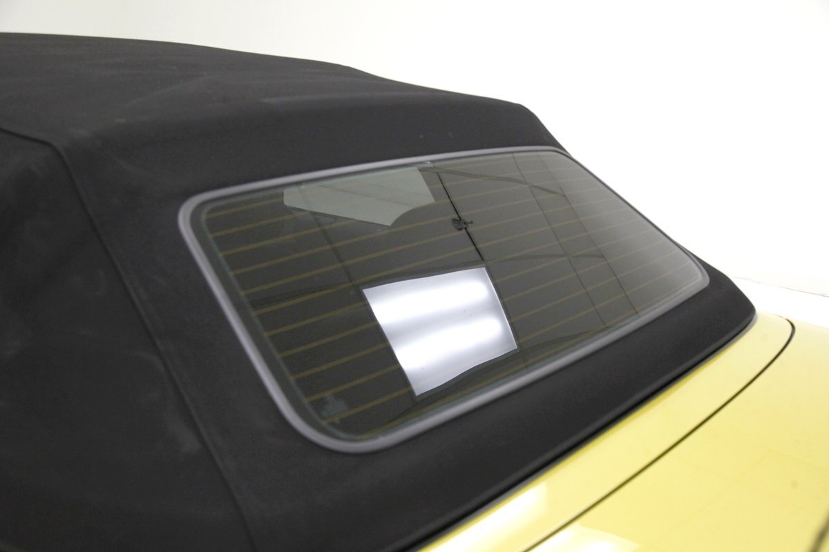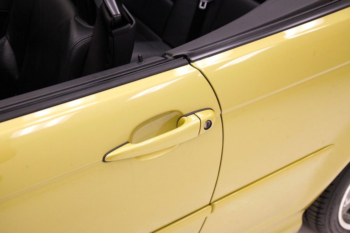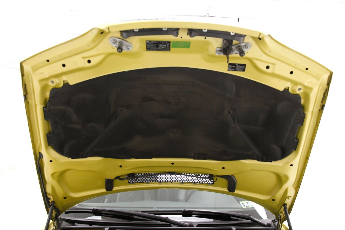 Phoenix Yellow bathes the all steel panels and neoprene bumpers which are body matching on this car. Gaps are well minded, and trimmings and badging are all in excellent condition. The car sports the aluminum trim package, xenon headlights, and a backup sensor system. The black canvas convertible top is electrically lowered and raised and works nearly perfectly. This top has a glass rear window, and when down, a black plastic tonneau covering. On the back just below the bumper we see dual dual exhaust on either side peeking out from the bottom of the rear roll pan. 19-inch G Craft Superstar wheels are wrapped by low profile Continental Extreme Contact tires. The driver's rim edge shows slight curbing, and a very small crease is seen on the passenger's side fender lip. A casualty of a parking lot incident.