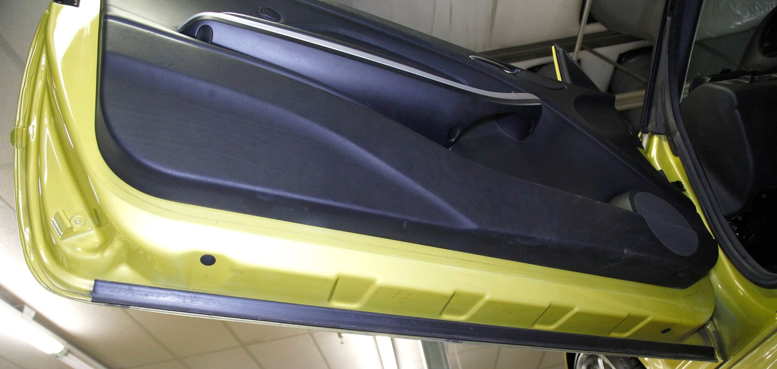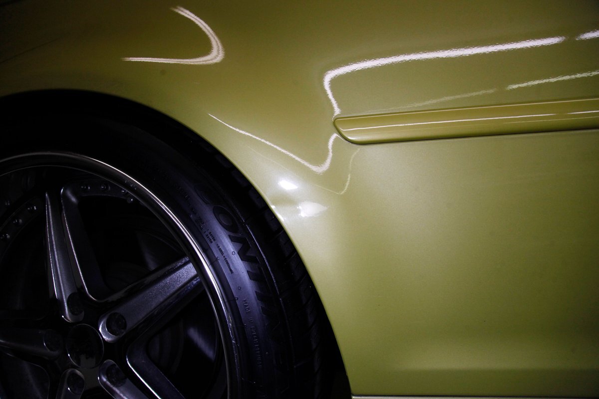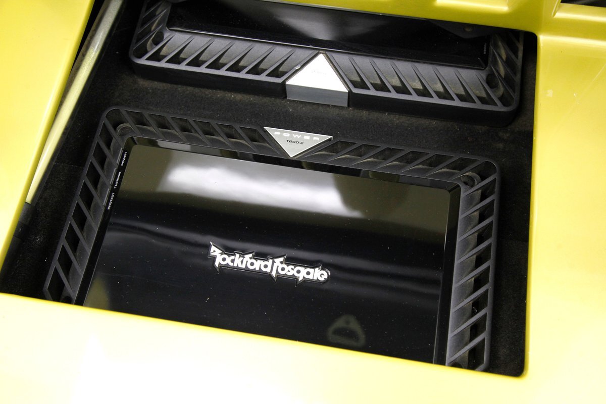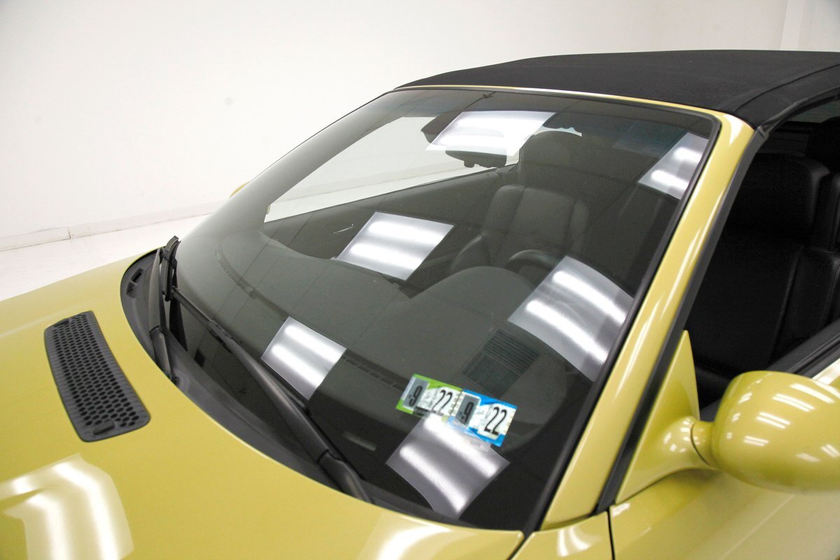 Phoenix Yellow bathes the all steel panels and neoprene bumpers which are body matching on this car. Gaps are well minded, and trimmings and badging are all in excellent condition. The car sports the aluminum trim package, xenon headlights, and a backup sensor system. The black canvas convertible top is electrically lowered and raised and works nearly perfectly. This top has a glass rear window, and when down, a black plastic tonneau covering. On the back just below the bumper we see dual dual exhaust on either side peeking out from the bottom of the rear roll pan. 19-inch G Craft Superstar wheels are wrapped by low profile Continental Extreme Contact tires. The driver's rim edge shows slight curbing, and a very small crease is seen on the passenger's side fender lip. A casualty of a parking lot incident.
