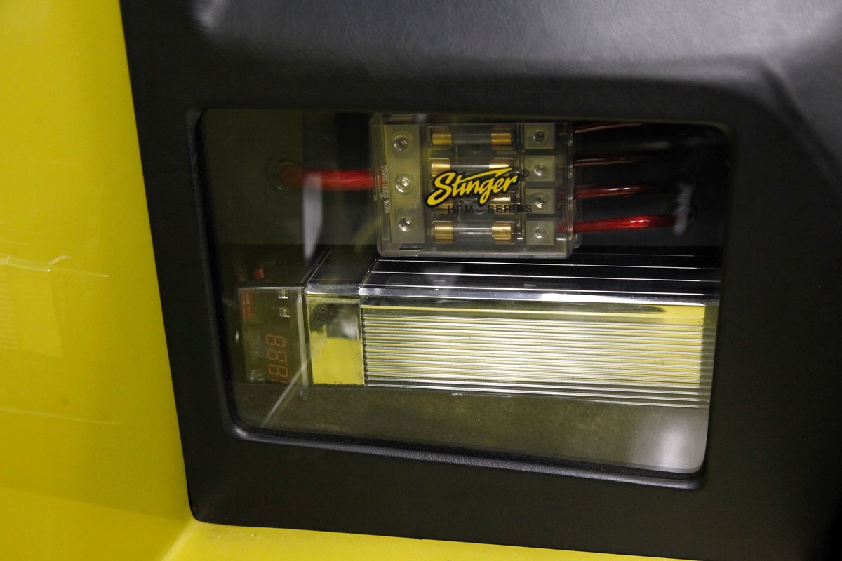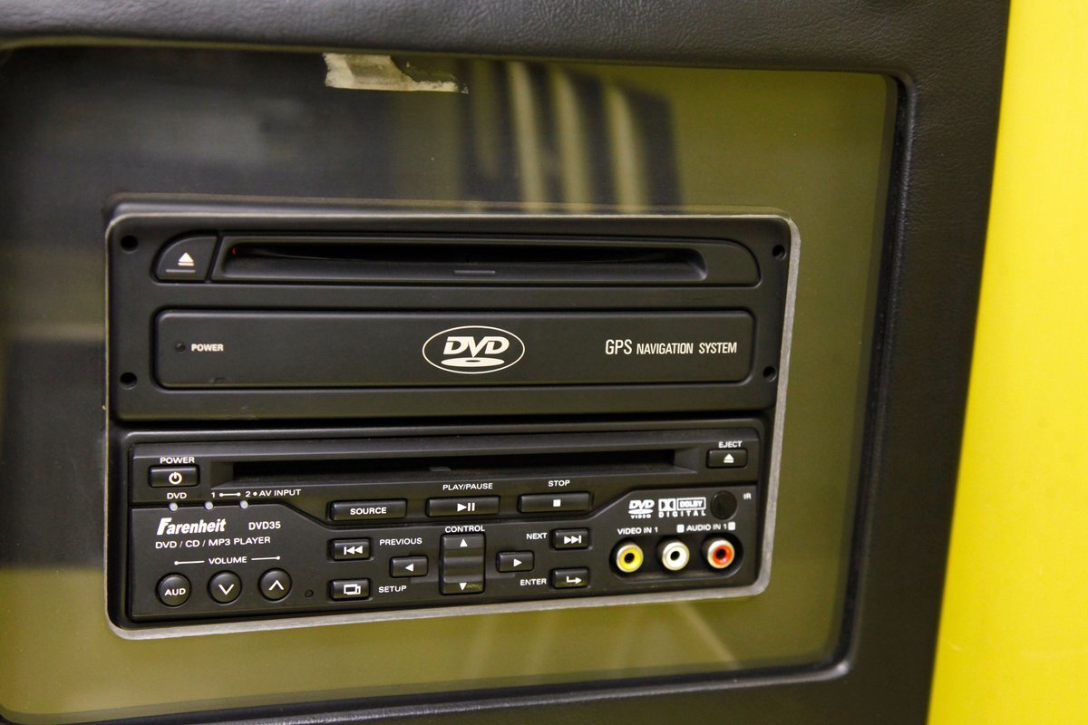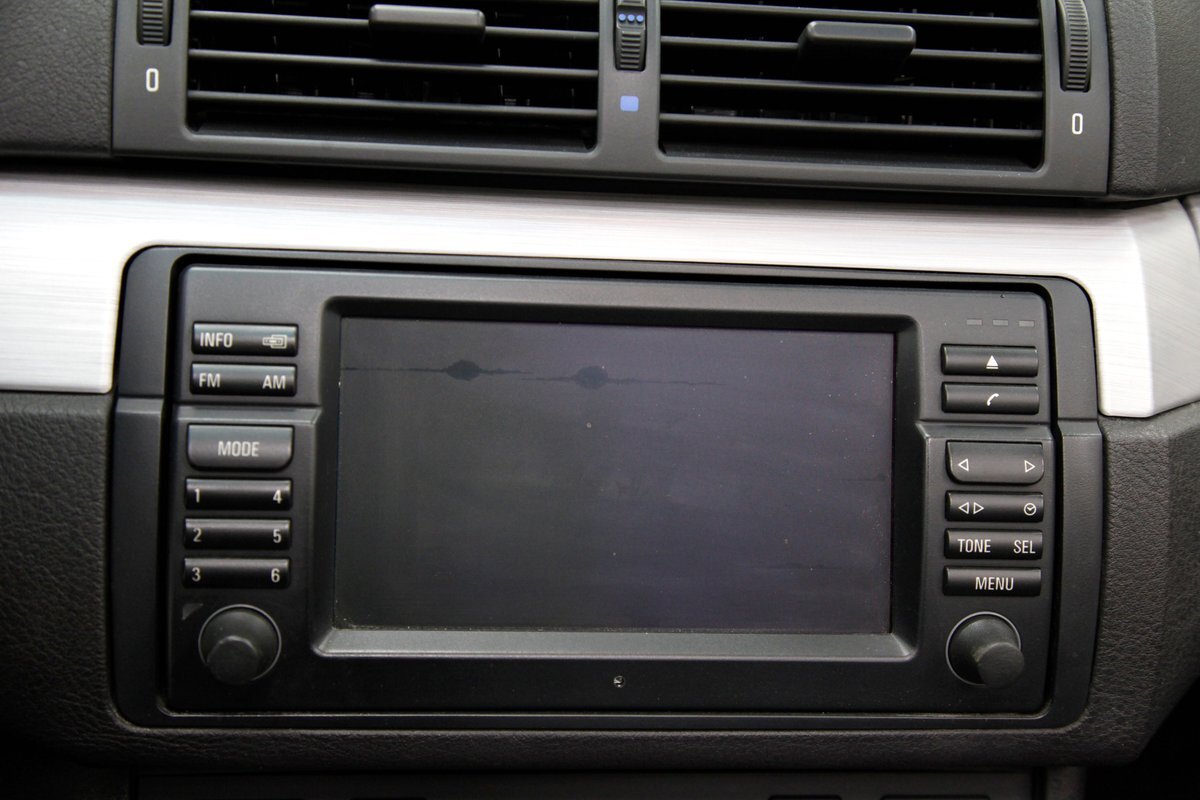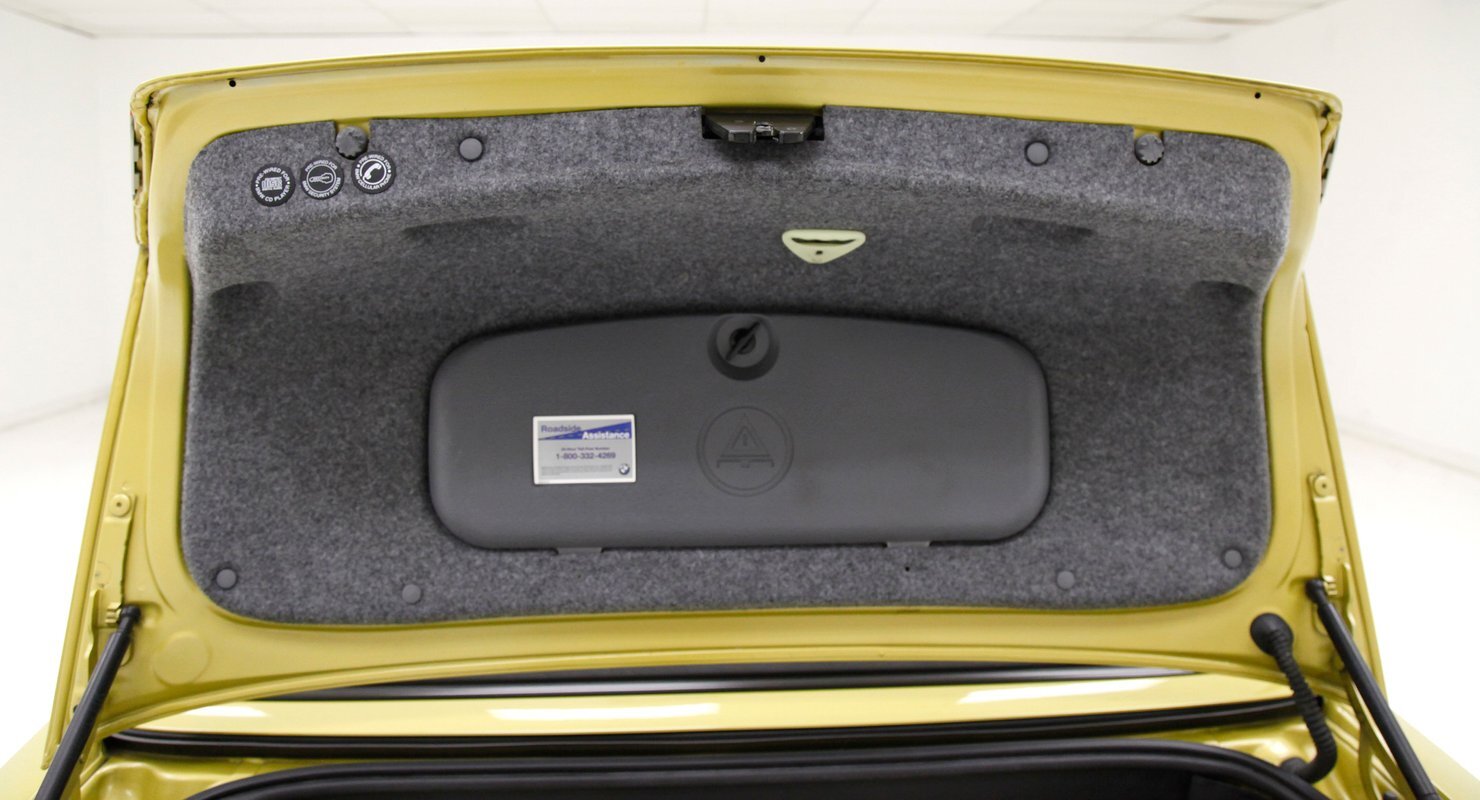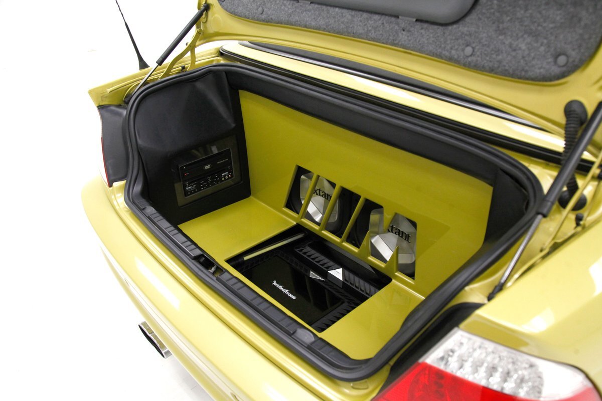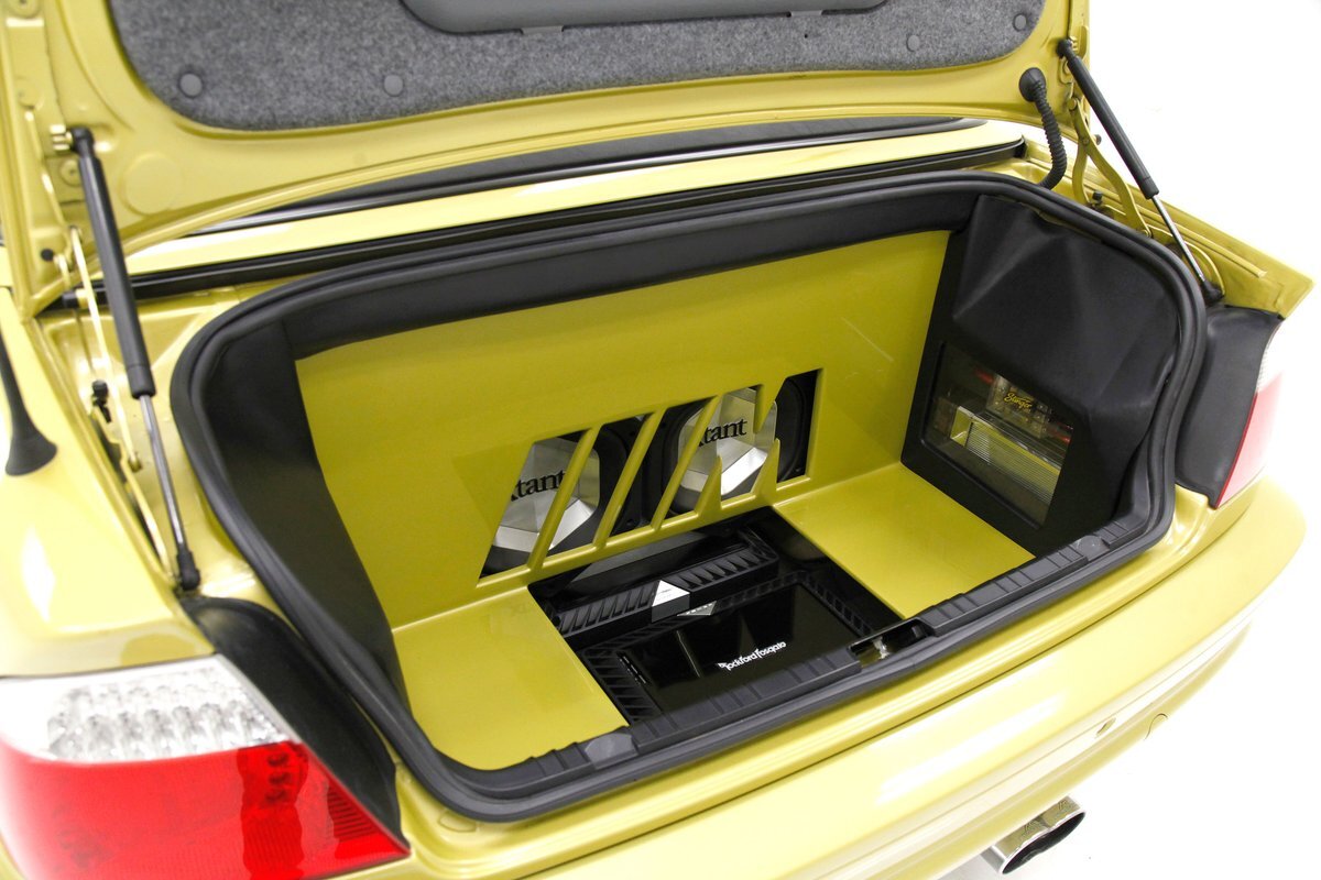 Black leather covers the inside of the passenger compartment which includes front racy smooth black leather buckets and a rear 2 plus 2 seat stretching across the back. The leather is in excellent condition and the buckets are power operated. A center console races through the buckets and up to the dash. Here we see a storage compartment, this lid doubles as an armrest for the front passengers. 2 cupholders and a small shifter is noted just prior to the rise to the dash. Also here are various toggles for different driving modes. As we move up to the dash front push button climate controls with a digital readout and a larger head unit screen is just above. This has the DVD stereo controls and a navi, but currently does not function. Fronting the simple curved dash with black faces and white numbers and red pointers is the sporty steering wheel which has various controls within the spokes of this wheel. In back of the wheel we note paddle shifters for the SMG, (sequential manual gearbox), transmission. This can also be done with the shift lever, or just put into full automatic for a worry and hands free cruise. Black carpeting is on the floors. A shout out to the trunk where a custom M cutout in the panel houses Xtant 10 inch subwoofers, 2 Rockford Fosgate amps, a 1.5 frat capacitor, crystal components, coaxial and Farenheit DVD 35. A system when installed costs $9,500.00!
