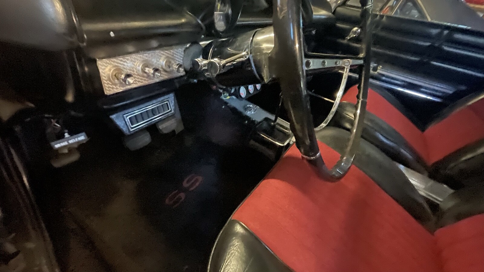 Interior has been restored. The seats have been recovered with red inserts, original carpet and new headliner which sags in one spot where one of the bows came loose from its clip. Aftermarket radio and speakers installed. Flaming River chrome tilt column, Vintage Air AC equipped but needs charged still.