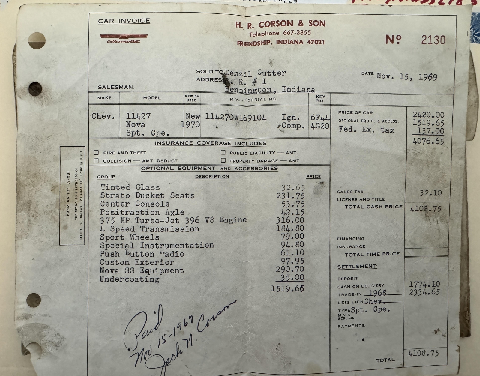 THIS IS A NICE QUALITY WELL KEPT 2 OWNER VERY DESIRABLE RARE FACTORY L78 NOVA SS DOCUMENTED WITH ORIGINAL SALES INVOICE. DATED CODED CORRECT FRESHLY REBUILT CORRECT 1970 L78 396/375HP ENGINE. MUNCIE M21 4SPD, 12 BOLT POSI REAR…..LIGHTS, TURN SIGNALS, WIPERS, HEATER, HORN, GAS GAUGE AND LOW FUEL LIGHT, TEMP GAUGE, OIL GAUGE ALL WORK AS SHOULD