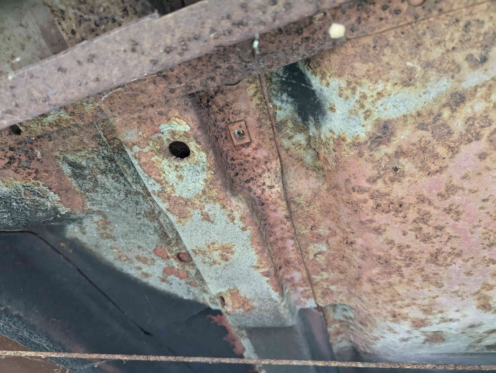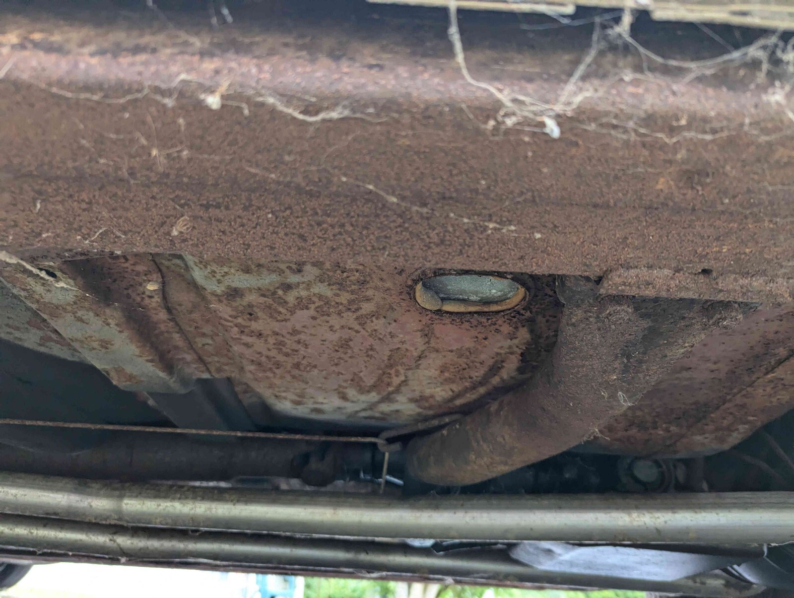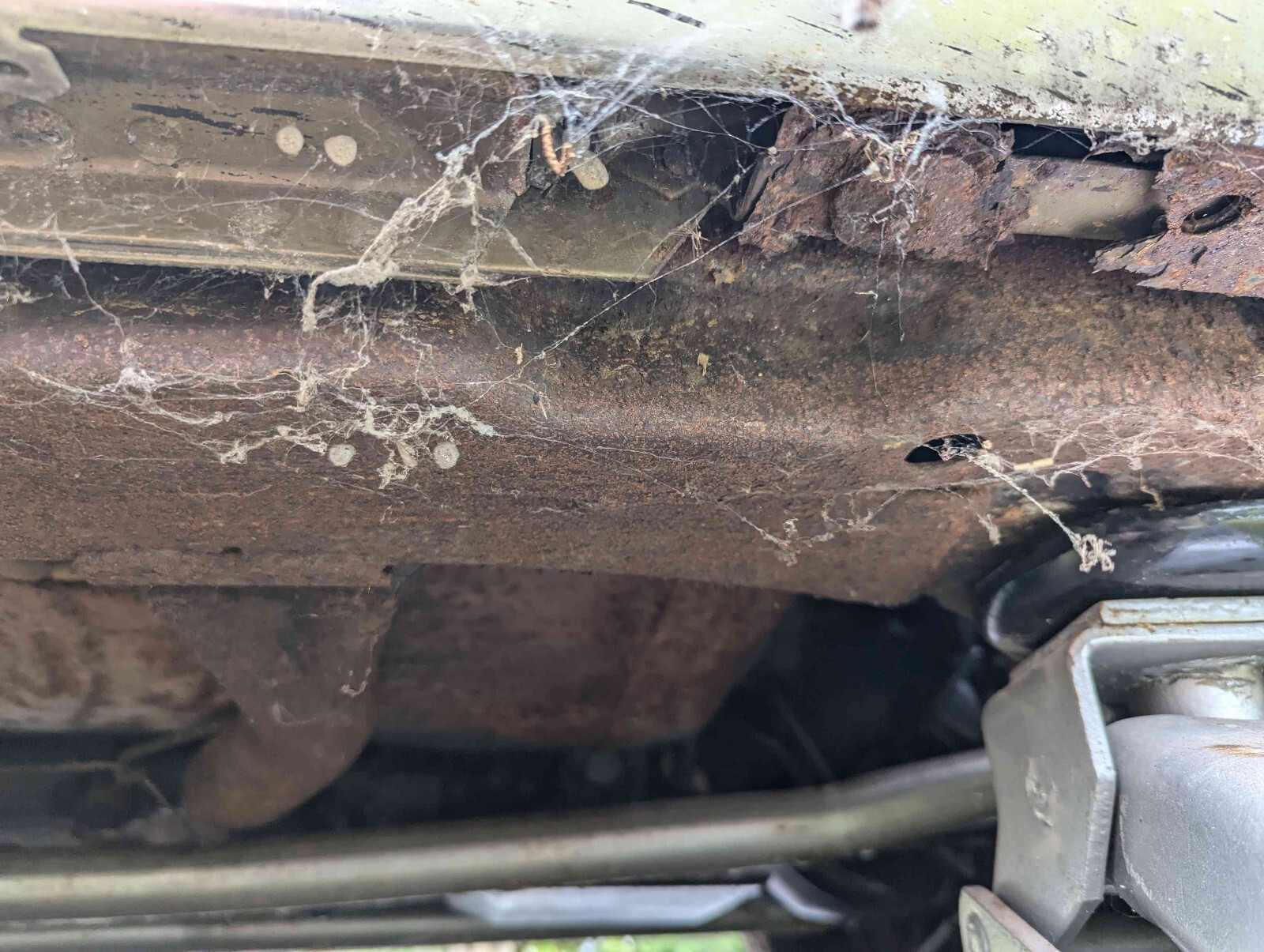 Rust caused by car cover trapping salt air. Frame and floors appear solid. Vehicle never driven in snow or salt.