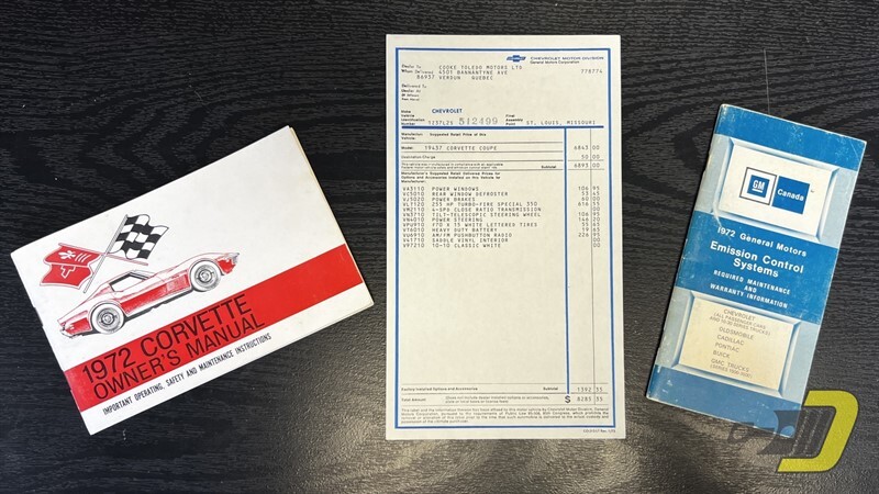 This example was built for the Canadian market and comes with its GM Canada documentation along with the original tank sticker. These documents show an LT1 model produced on 1-28-72 in Classic White with a Saddle Vinyl interior. Options of note include power steering, power brakes, power windows, tilt / telescoping column, and a rear defroster. In 2015 this Corvette was purchased from Canada by its last owner and imported into the United States. Note it has a clear Wisconsin title.