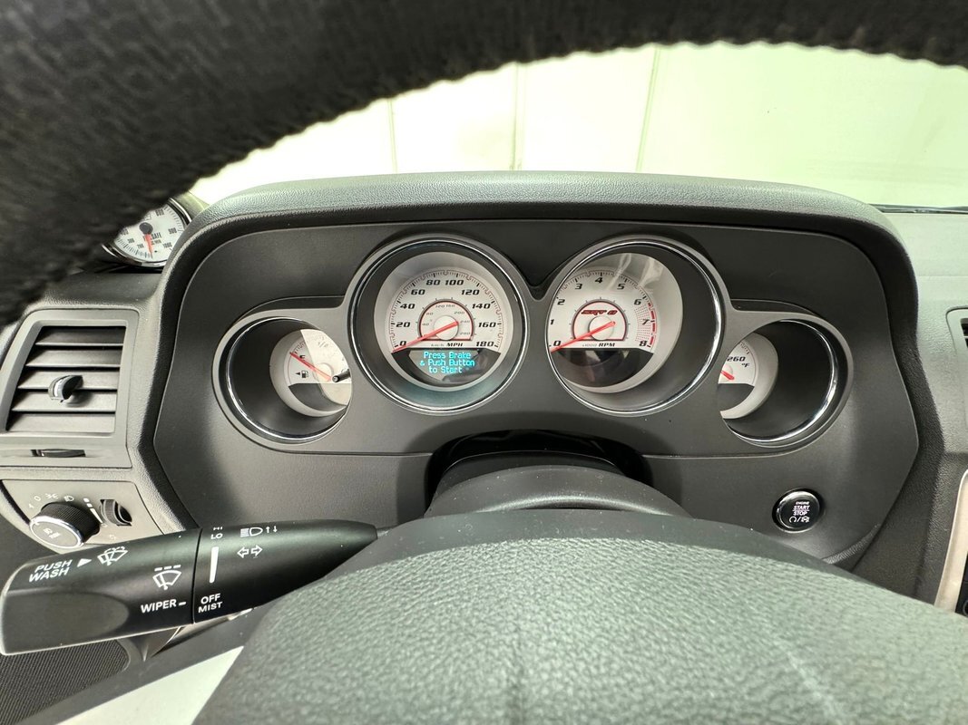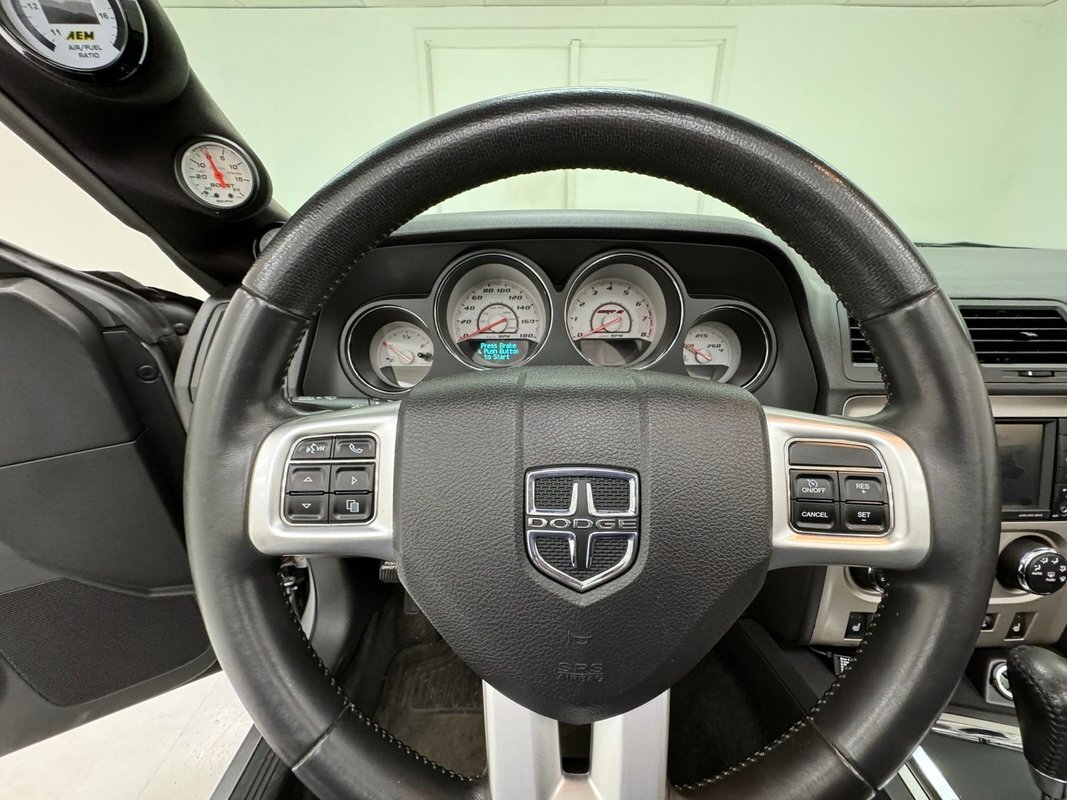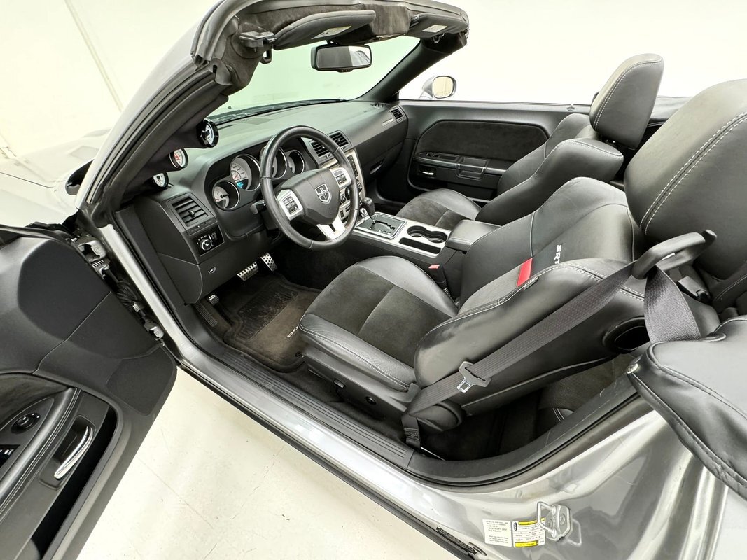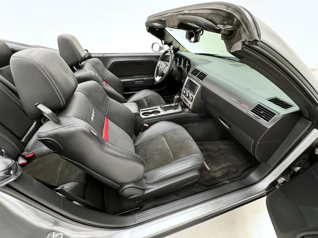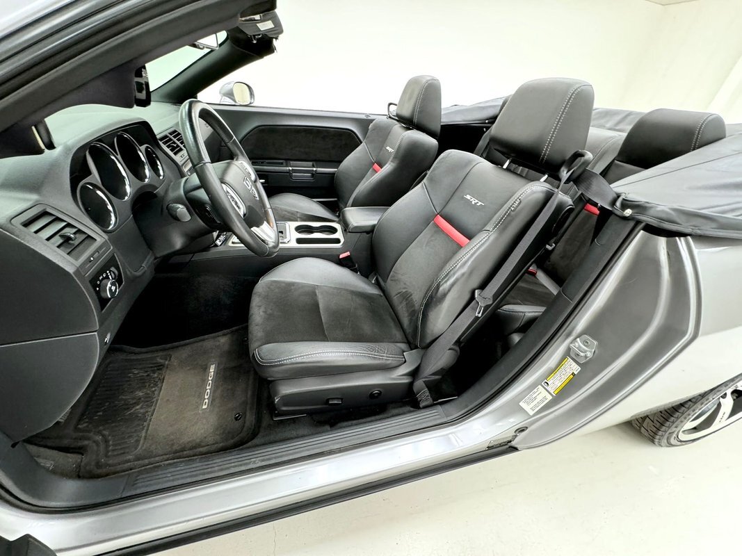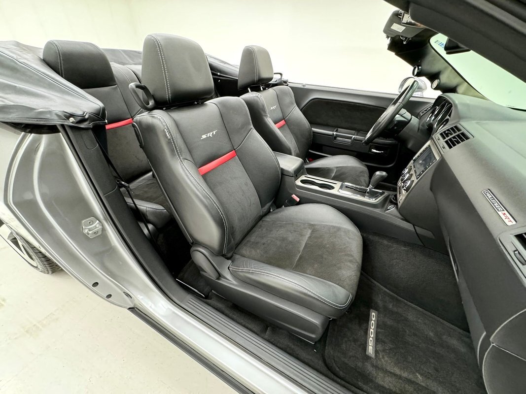 Race inspired leather covered high back buckets have charcoal black suede inserts and smooth charcoal black shiny exaggerated leather bolsters. A sporty red highlight strip runs through the back along with white SRT embroidery below the headrests. Nice white stitching also highlights these seats, with the driver's being power actuated. In back a 2 plus 2 bench in the same motif and in excellent condition is seen. A center console races forward between the buckets and has a glovebox, LED lit cup holders and the factory shift lever housing. Rising from this center is a mid-dash which has climate control knobs and an interactive U-Connect screen for the Bluetooth, radio, navigation, and voice activation as well as a backup cam. In front of the driver is a cascade of white-faced analog gauges under a squared off design eyebrow visor. To the driver's left on the A pillar we see some gauges mounted in for easy monitoring. A charcoal black tonneau covers the top when in the down position.