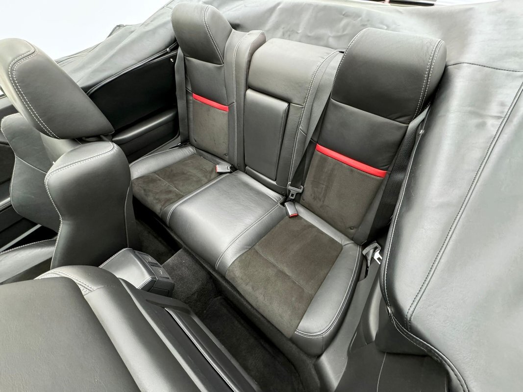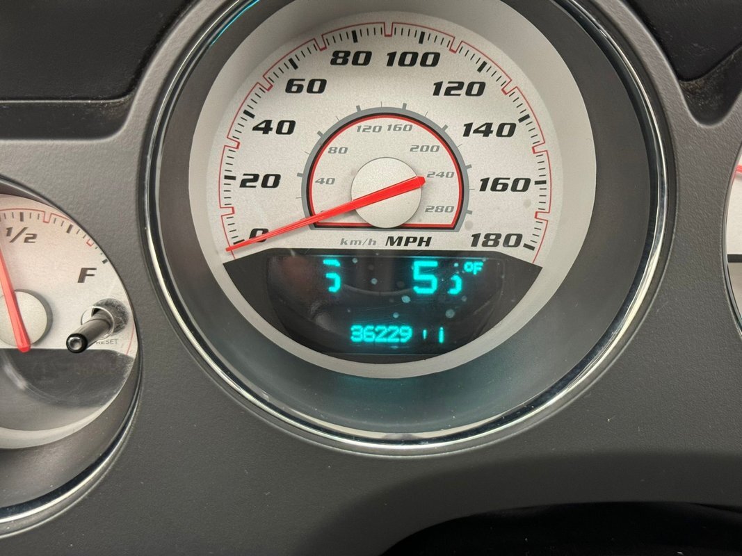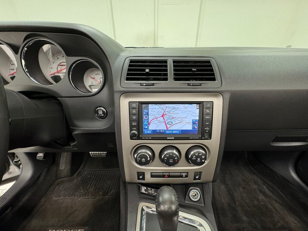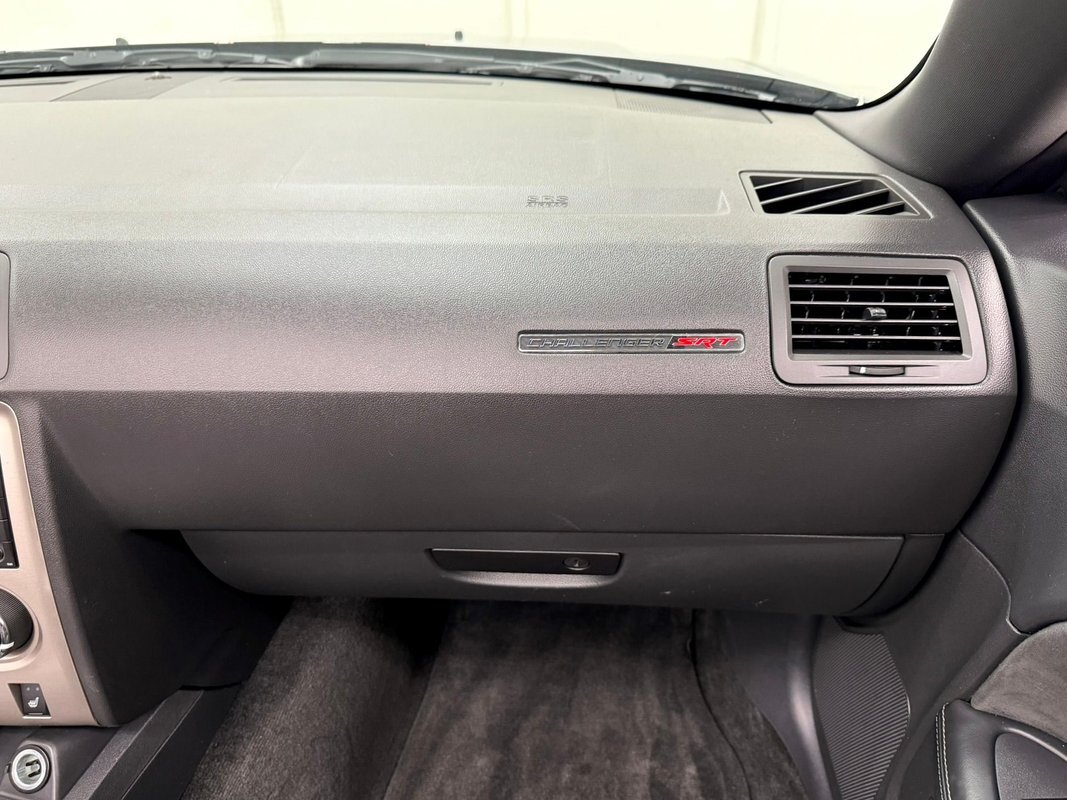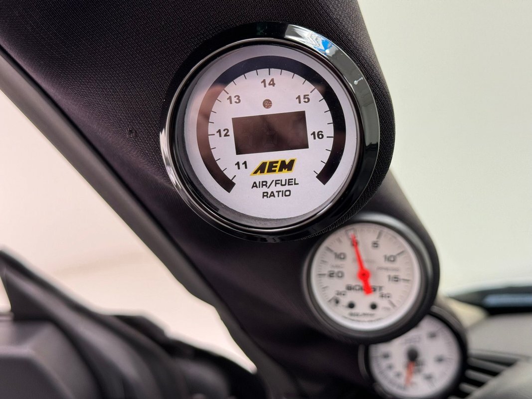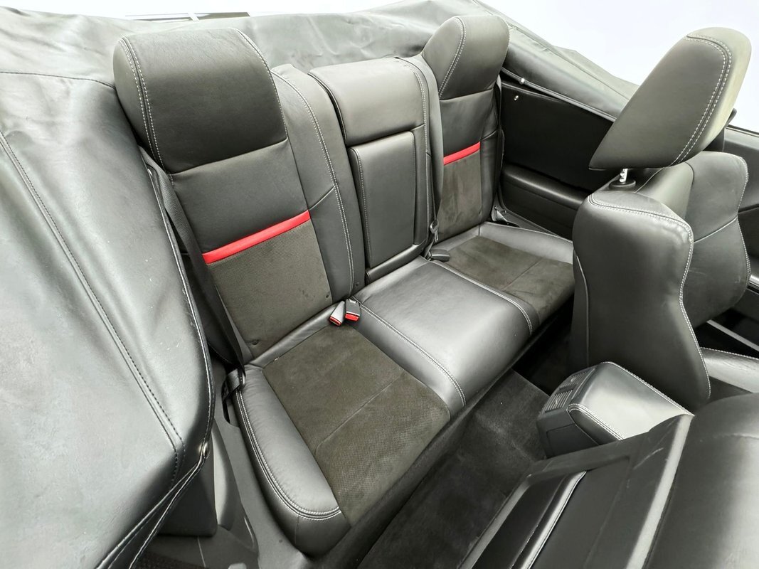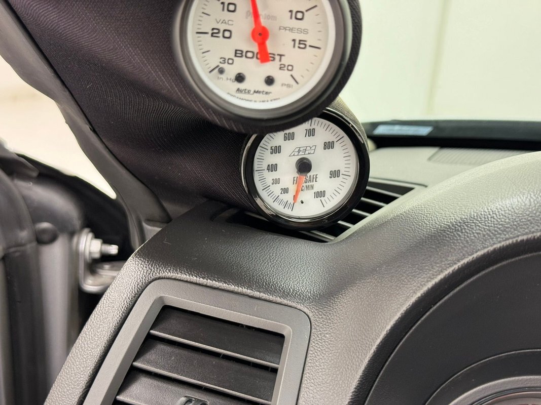 Race inspired leather covered high back buckets have charcoal black suede inserts and smooth charcoal black shiny exaggerated leather bolsters. A sporty red highlight strip runs through the back along with white SRT embroidery below the headrests. Nice white stitching also highlights these seats, with the driver's being power actuated. In back a 2 plus 2 bench in the same motif and in excellent condition is seen. A center console races forward between the buckets and has a glovebox, LED lit cup holders and the factory shift lever housing. Rising from this center is a mid-dash which has climate control knobs and an interactive U-Connect screen for the Bluetooth, radio, navigation, and voice activation as well as a backup cam. In front of the driver is a cascade of white-faced analog gauges under a squared off design eyebrow visor. To the driver's left on the A pillar we see some gauges mounted in for easy monitoring. A charcoal black tonneau covers the top when in the down position.