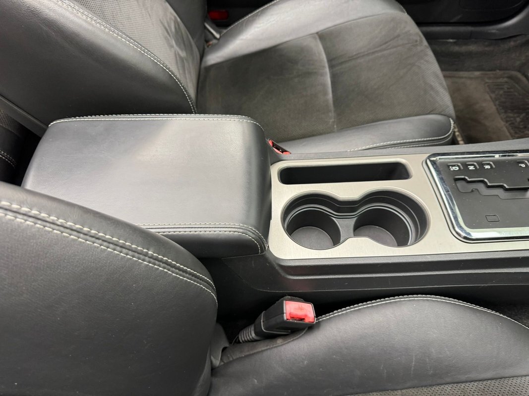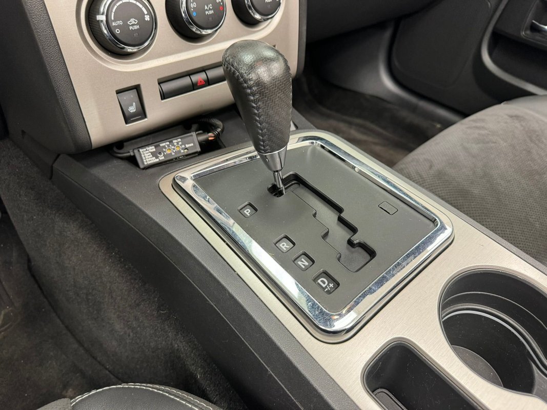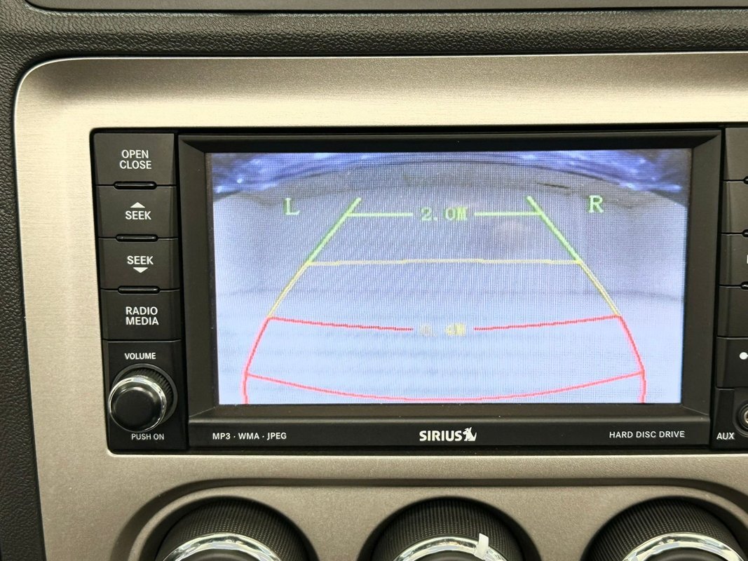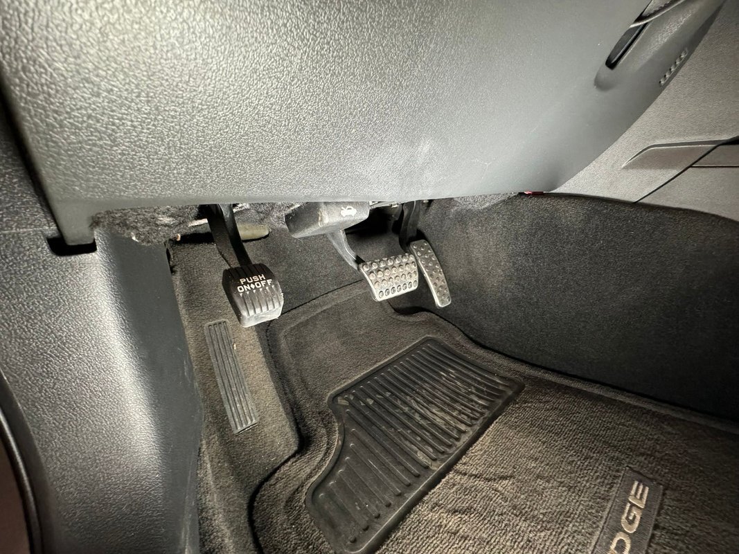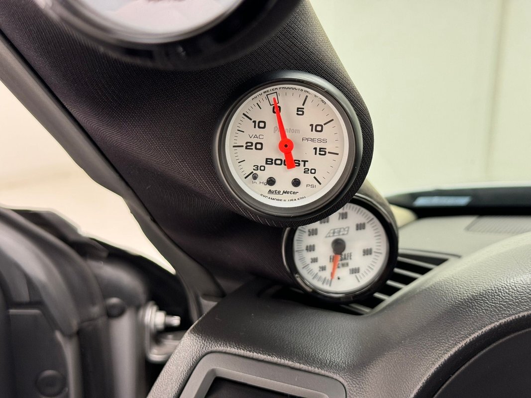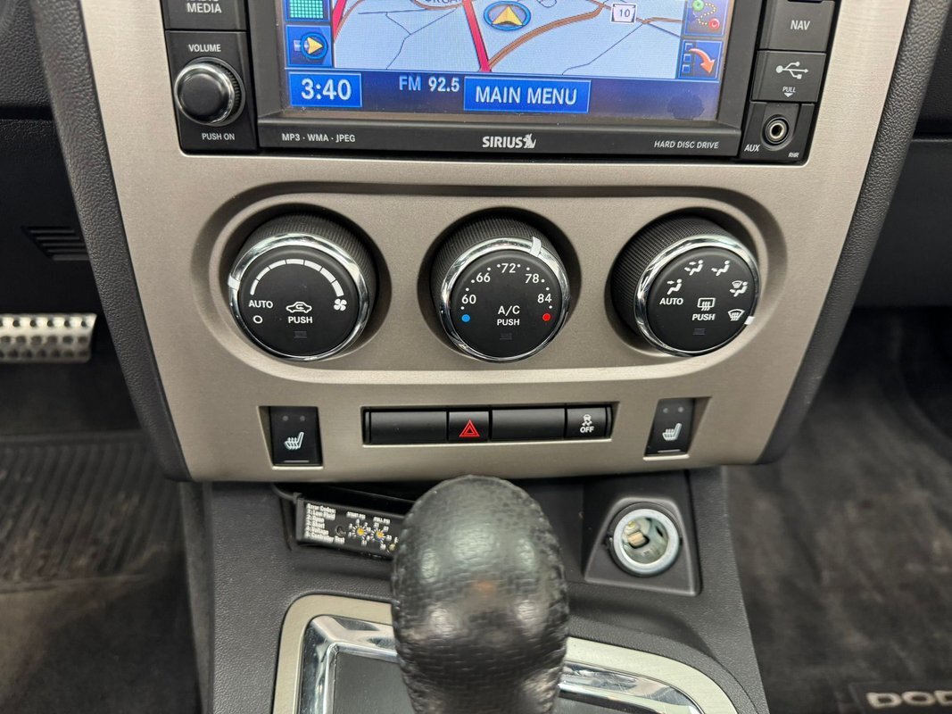 Race inspired leather covered high back buckets have charcoal black suede inserts and smooth charcoal black shiny exaggerated leather bolsters. A sporty red highlight strip runs through the back along with white SRT embroidery below the headrests. Nice white stitching also highlights these seats, with the driver's being power actuated. In back a 2 plus 2 bench in the same motif and in excellent condition is seen. A center console races forward between the buckets and has a glovebox, LED lit cup holders and the factory shift lever housing. Rising from this center is a mid-dash which has climate control knobs and an interactive U-Connect screen for the Bluetooth, radio, navigation, and voice activation as well as a backup cam. In front of the driver is a cascade of white-faced analog gauges under a squared off design eyebrow visor. To the driver's left on the A pillar we see some gauges mounted in for easy monitoring. A charcoal black tonneau covers the top when in the down position.
