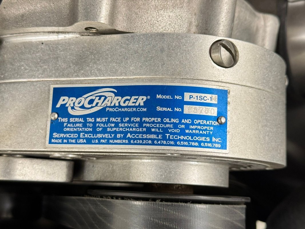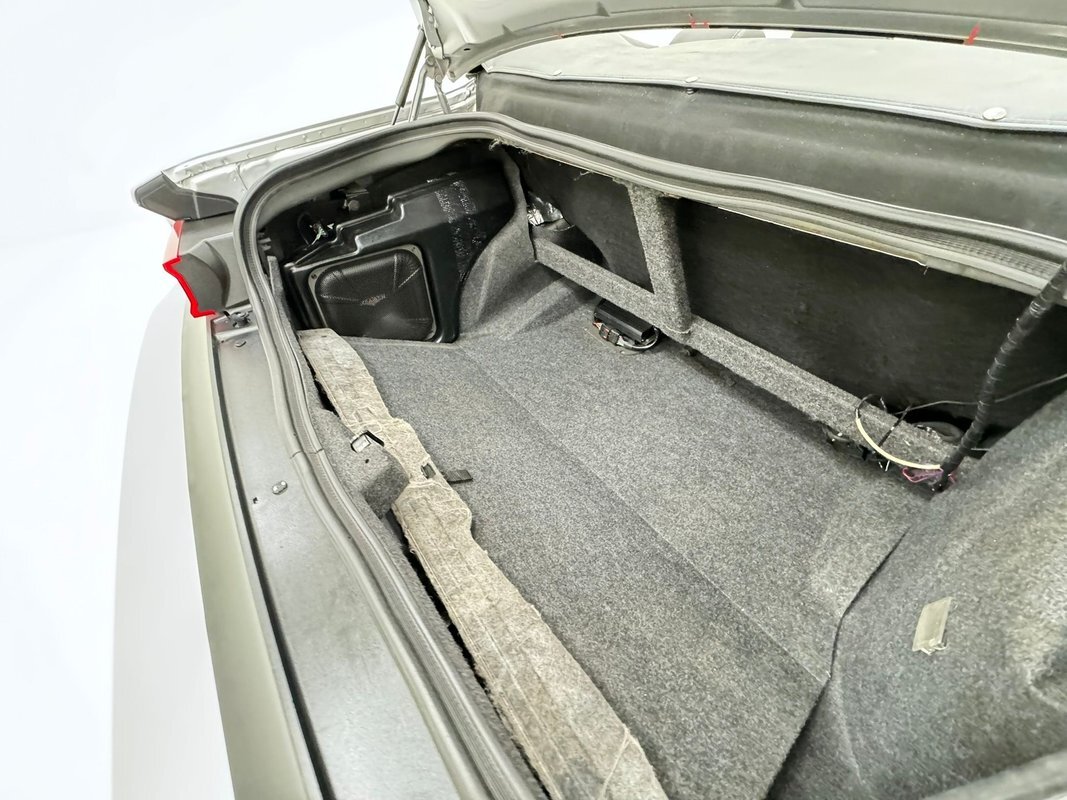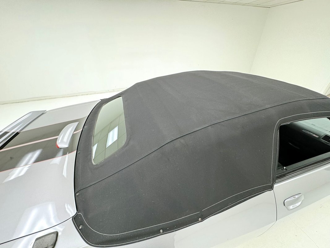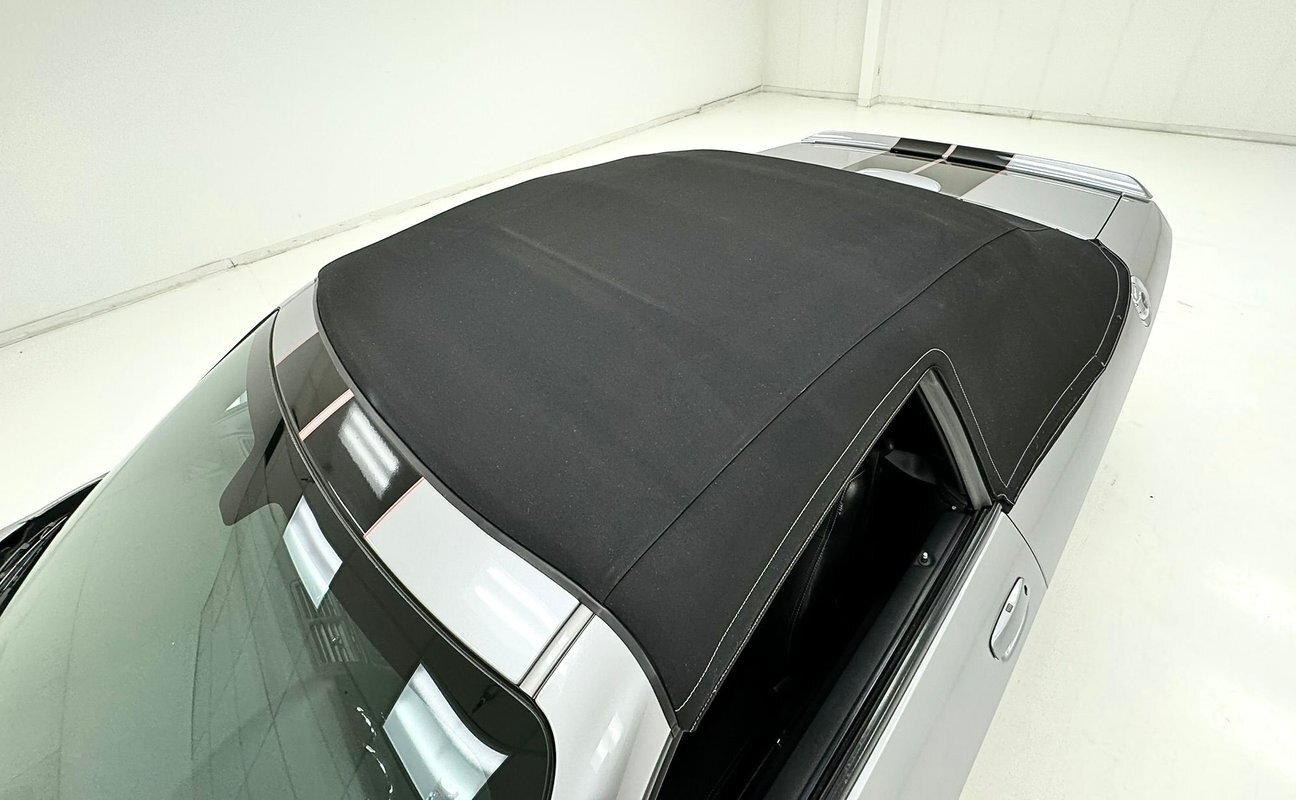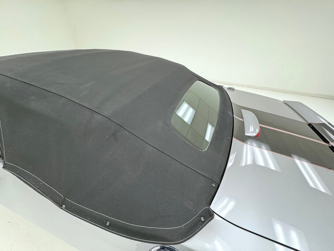 In our midst a Billet Silver Metallic streak throwback. This silver color bathes the body and shows as new with a few very minor areas of concern that should easily buff out, or a light spray will cover them. Looking much like the throwback to the 70's version we see dual HID headlights, the inboards being marker lights, within an elongated oval grille all in menacing black surrounds, neoprene bumper and chin spoiler hovering just above the tarmac. This giant lower air dam increases downforce and helps cool the brakes. As we move our eyes to the passenger compartment we glide over the raised center hood, complete with black stripes and functional scoops. The roofline is rakish and looks like it's moving forward as the car just sits there. Black frameless glass with drip shields and tinted windows along with sporty body matching side view mirrors allow you to see where your competition is and most likely will stay! On top is now a black canvas convertible put on in California by American Coach Customs. It is power actuated and has a glass rear window. Moving along a chromed racing style gas cap and a small lip spoiler is on top of the flat rear deck. More crash test dummy neoprene makes up the aero bumper and rear roll pan that shows dual chromed rectangular exhaust tips peeking out from the bottom. Large 20-inch polished wheels are wrapped by black wall radials and shine nicely on all 4 corners.