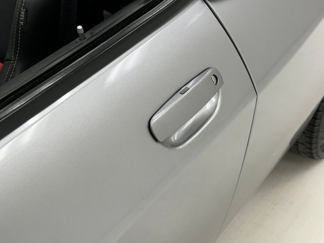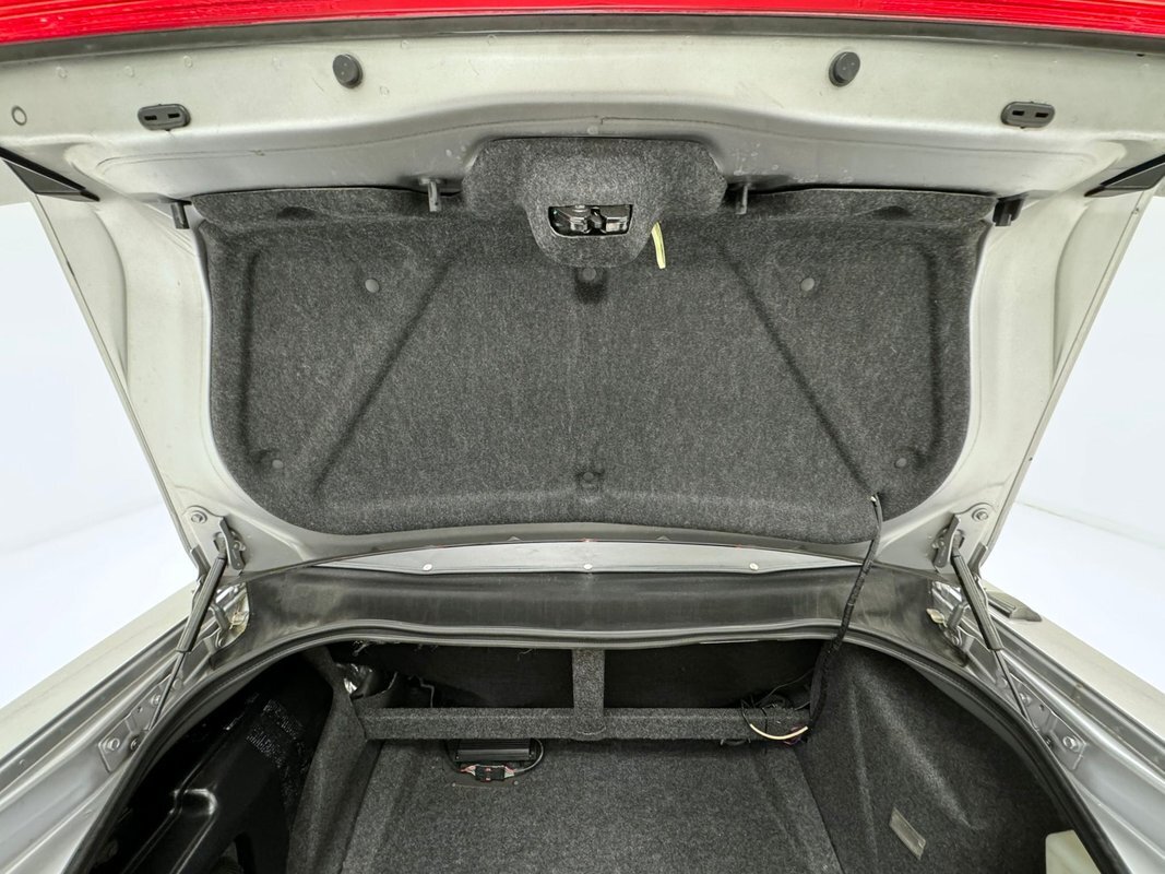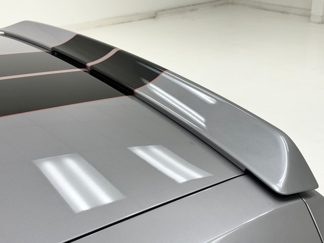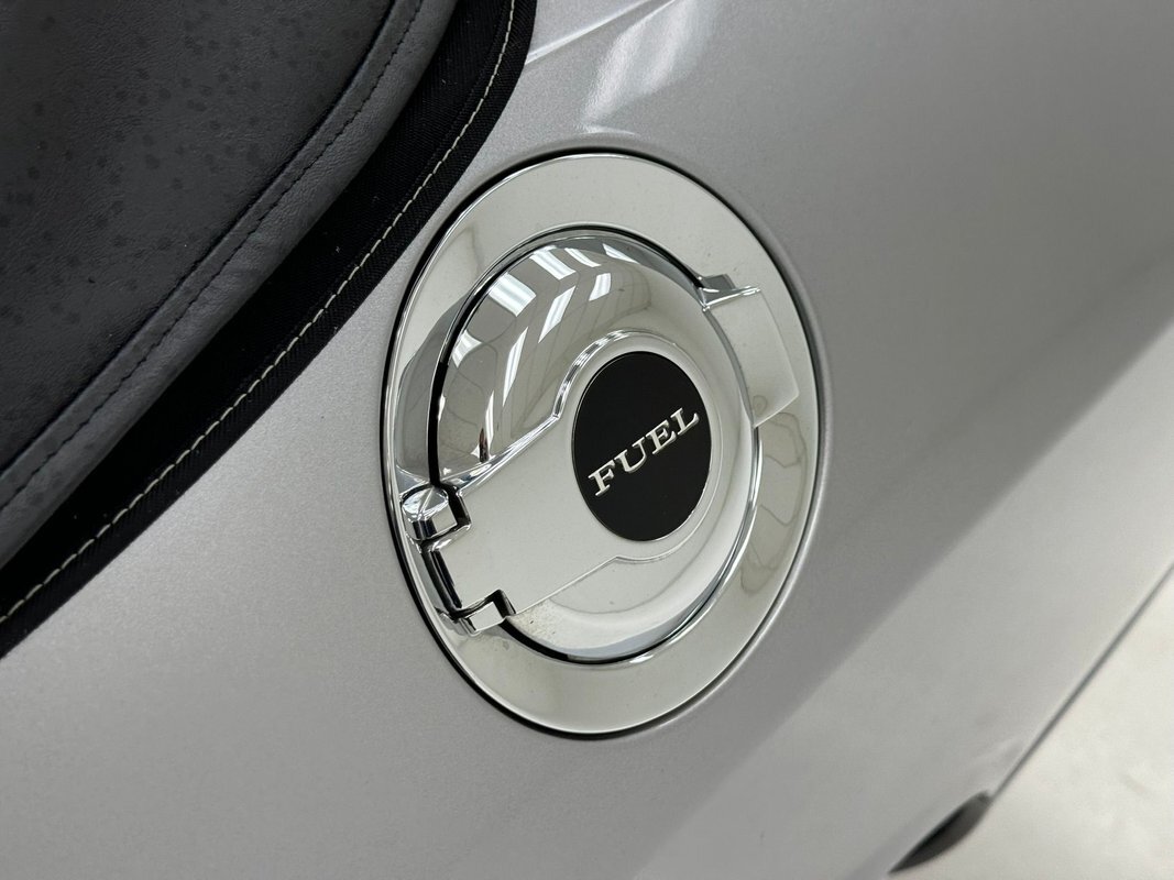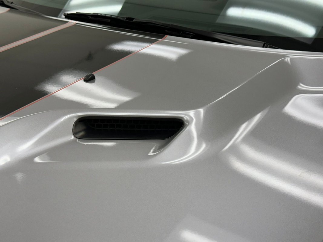 In our midst a Billet Silver Metallic streak throwback. This silver color bathes the body and shows as new with a few very minor areas of concern that should easily buff out, or a light spray will cover them. Looking much like the throwback to the 70's version we see dual HID headlights, the inboards being marker lights, within an elongated oval grille all in menacing black surrounds, neoprene bumper and chin spoiler hovering just above the tarmac. This giant lower air dam increases downforce and helps cool the brakes. As we move our eyes to the passenger compartment we glide over the raised center hood, complete with black stripes and functional scoops. The roofline is rakish and looks like it's moving forward as the car just sits there. Black frameless glass with drip shields and tinted windows along with sporty body matching side view mirrors allow you to see where your competition is and most likely will stay! On top is now a black canvas convertible put on in California by American Coach Customs. It is power actuated and has a glass rear window. Moving along a chromed racing style gas cap and a small lip spoiler is on top of the flat rear deck. More crash test dummy neoprene makes up the aero bumper and rear roll pan that shows dual chromed rectangular exhaust tips peeking out from the bottom. Large 20-inch polished wheels are wrapped by black wall radials and shine nicely on all 4 corners.