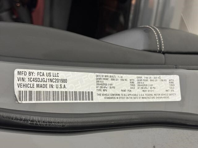 This Loaded Durango has all the Standard Equipments & more: Destroyer Gray Exterior Paint ($395), High Performance Laguna Leather Seats ($1,595), Customer Preferred Package 29L, Black Package ($1,845), 20' Lights-Out Aluminum Wheels, Premium Interior Group ($2,495), Suede Headliner, Forged Carbon Fiber Interior Accents, Red Seat Belts ($95), Power Sunroof ($1,295), Harman/Kardon Speakers with Subwoofer ($1,085), & much more...