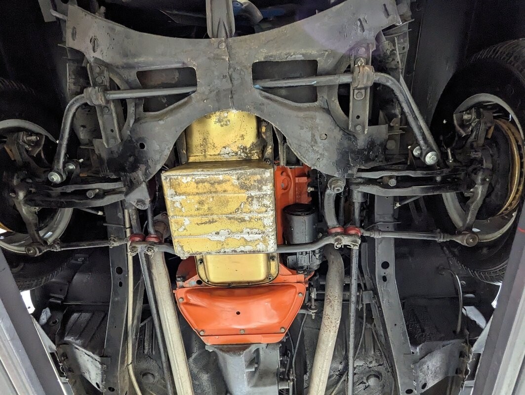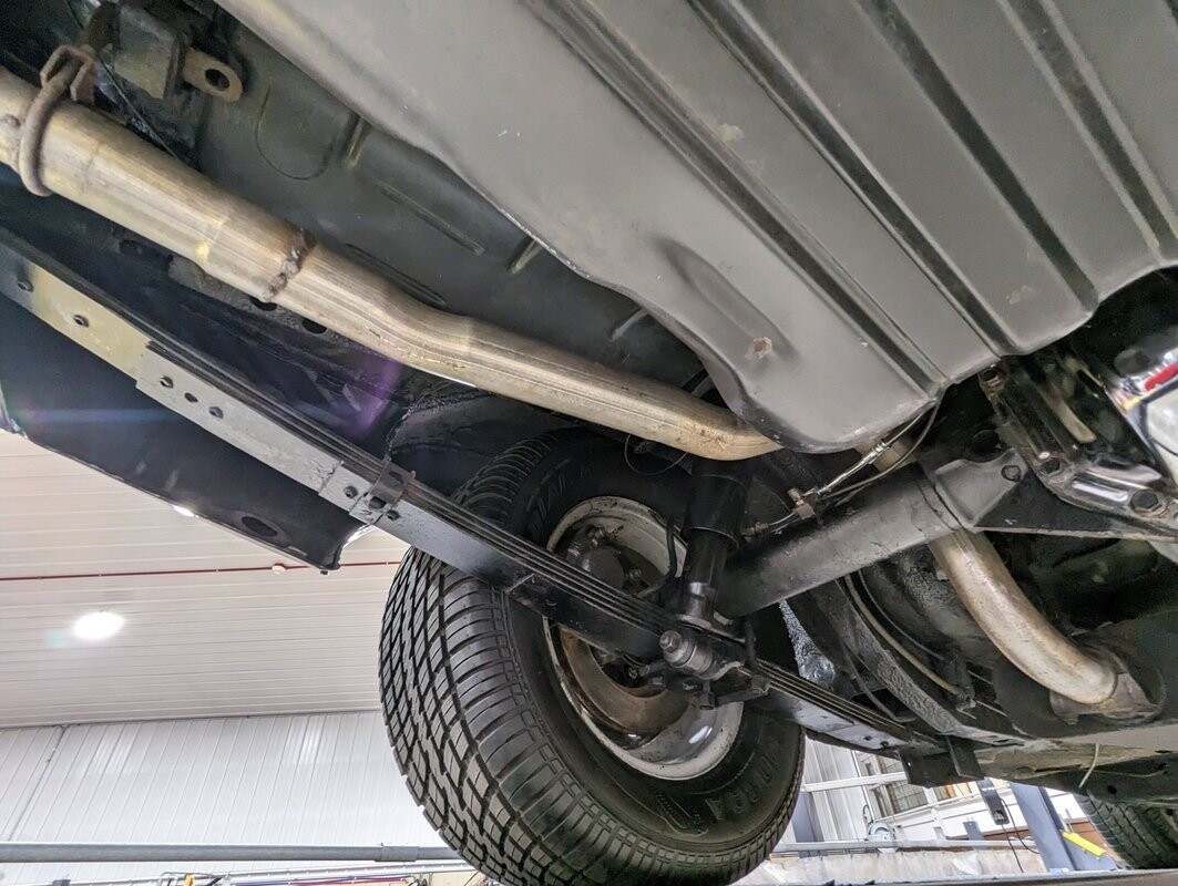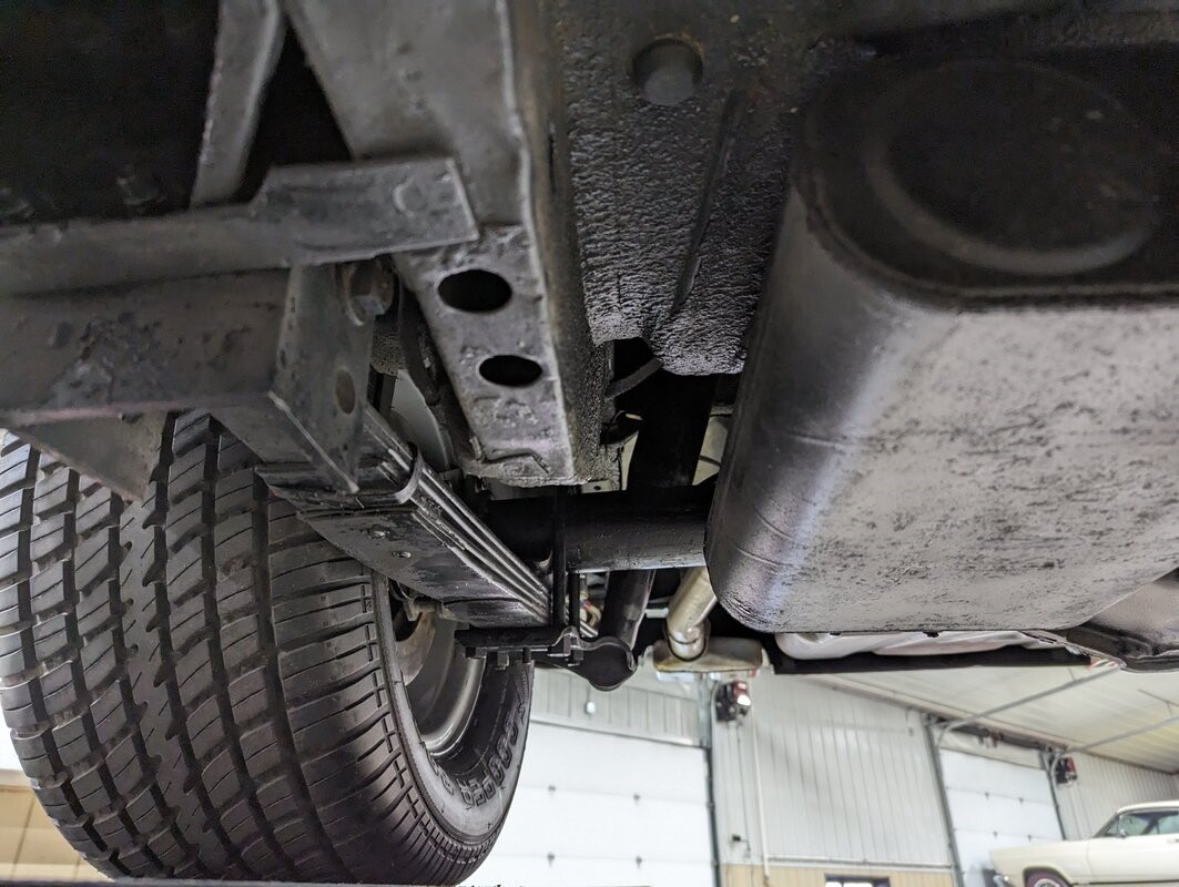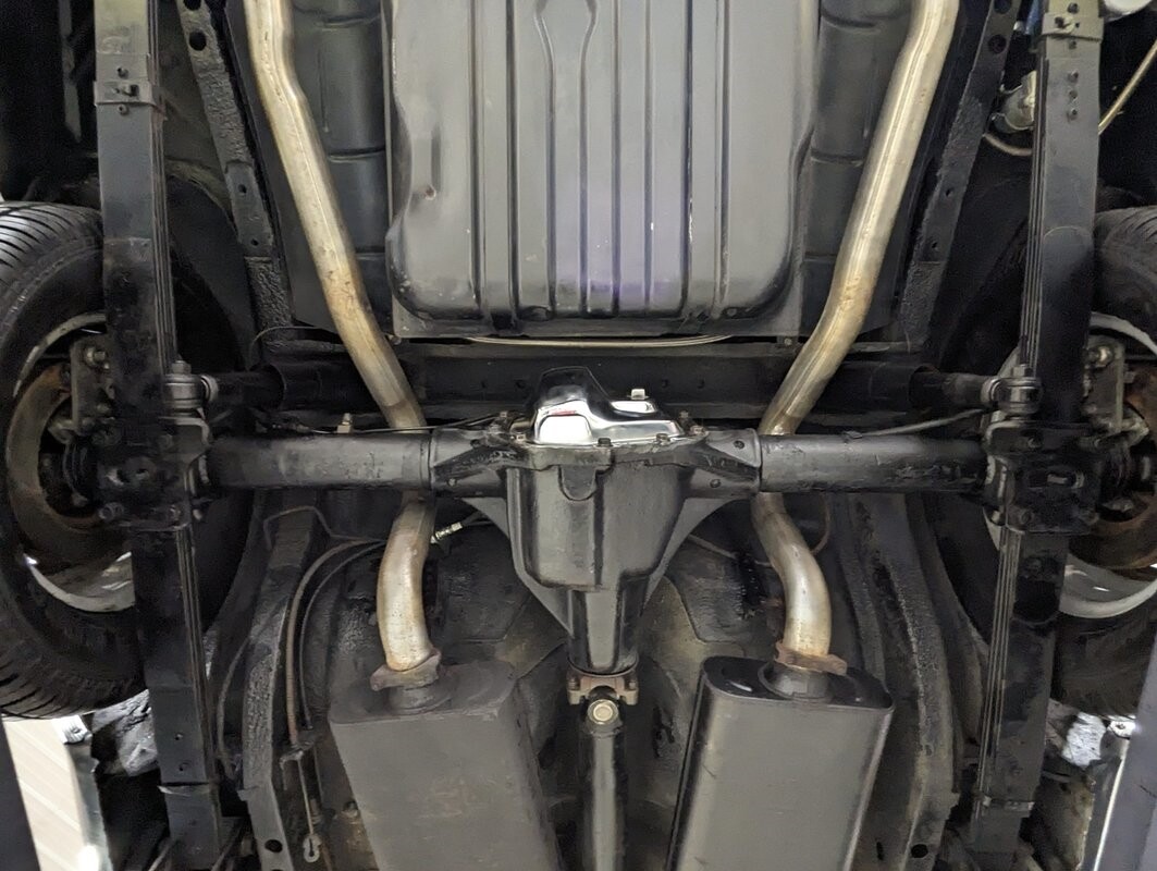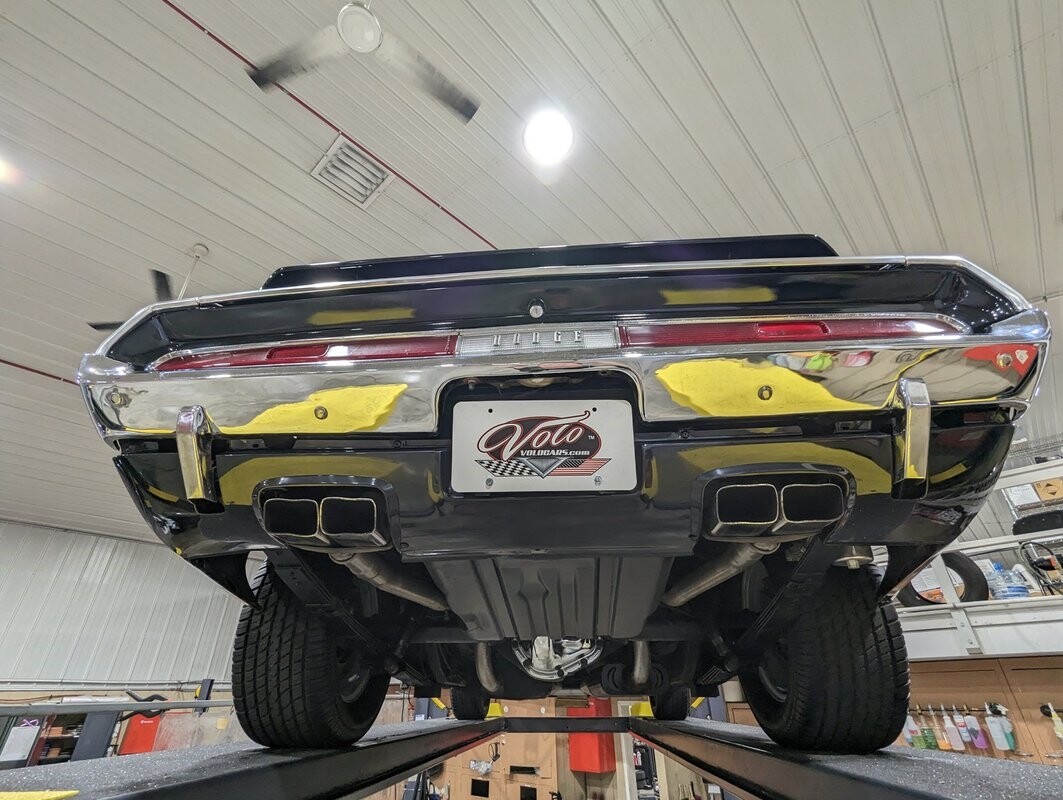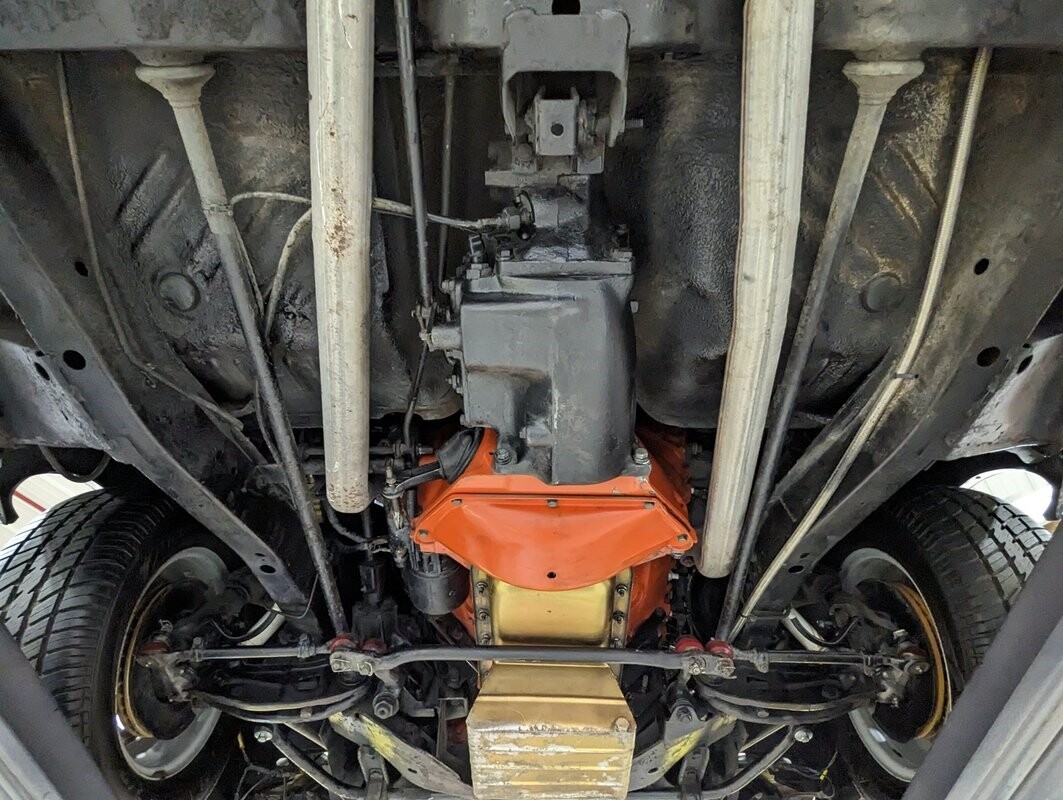 UNDERSIDE: Ground up restoration, rust free. The front suspension components look to be replaced, upgraded poly bushings in the steering, and front sway bar. The rear leaf springs, and air shocks were replaced and look very clean. This Challenger is upgraded with 4 wheel disc brakes. The gas tank looks new, as well as the lines and high flow inline fuel pump. The dual exhaust is clean with H pipe, FlowMaster mufflers, and completed with quad square tips. Looking up at the motor it has a larger capacity pan, and everything looks dry. It's mated to its original numbers matching 4 speed manual transmission. The rear end is HD Dana 60 4.10 sure-grip correct to the car, with a chrome cover. The floors, and frame rails are very nice clean metal that were prepped, and refinished nicely.
