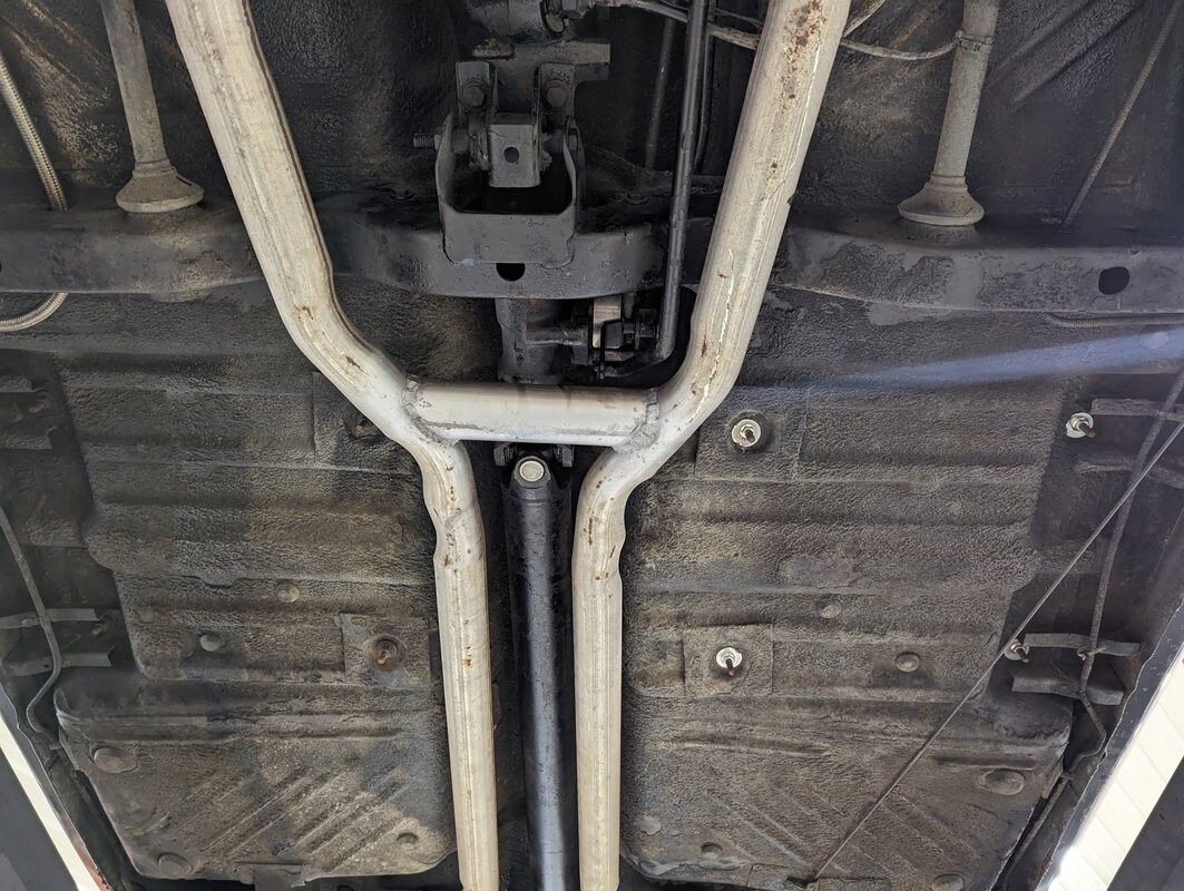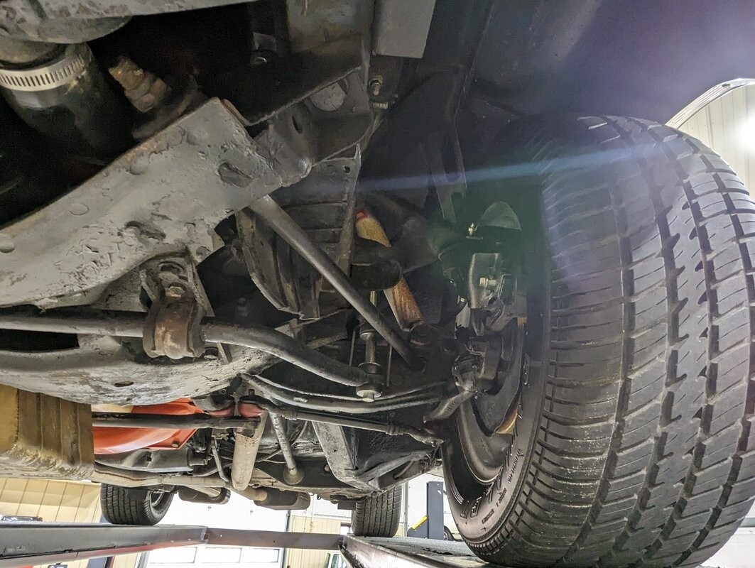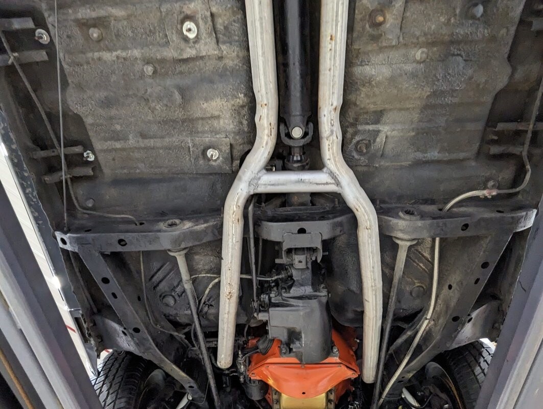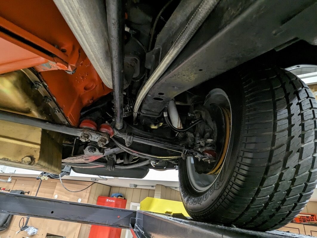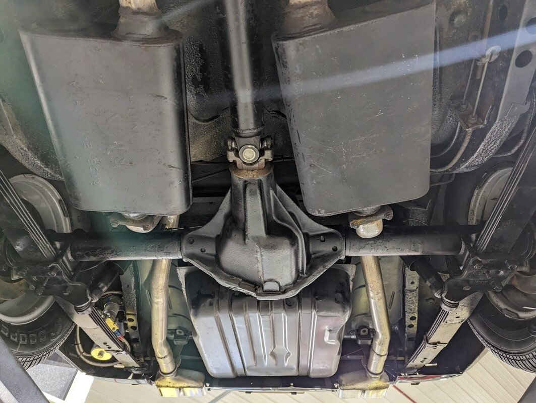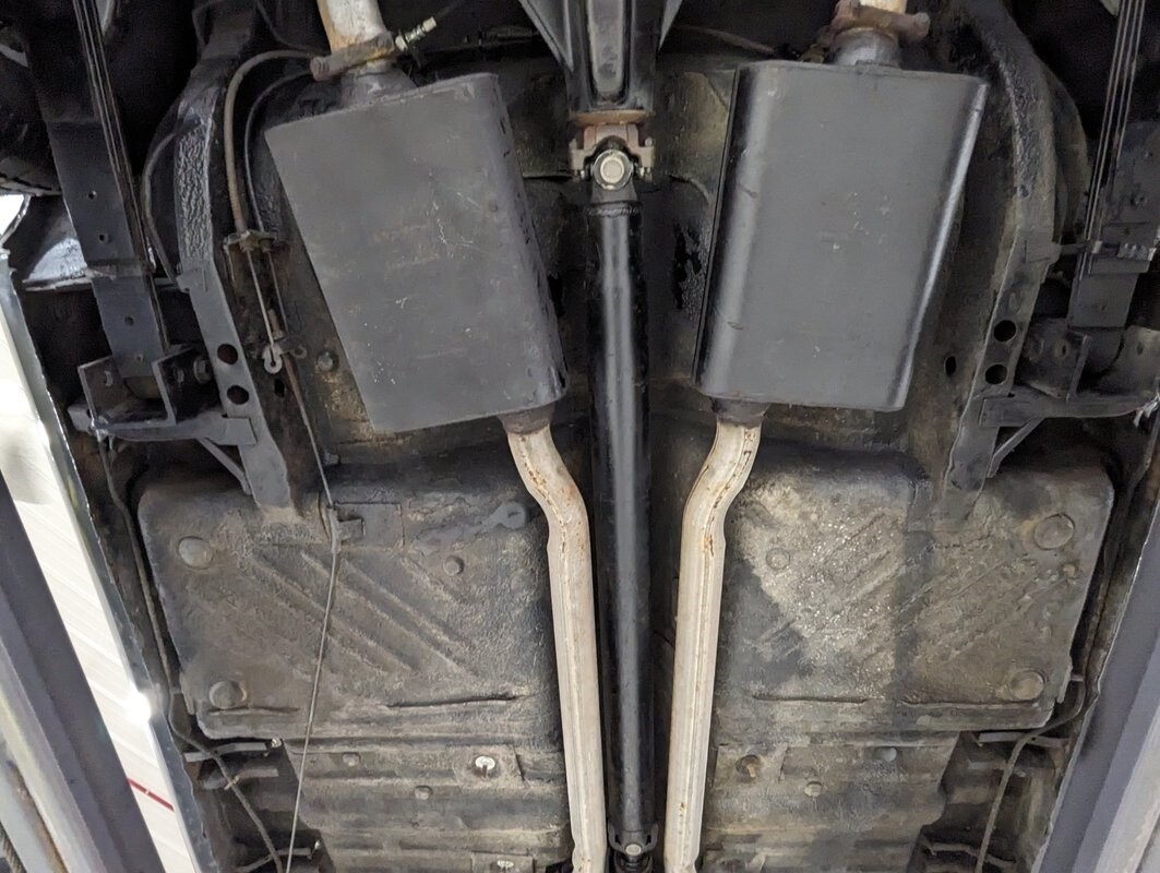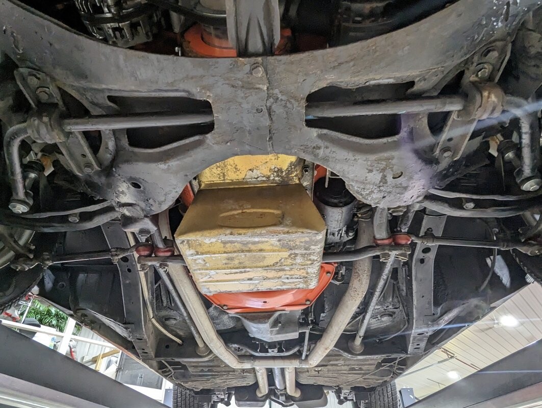 UNDERSIDE: Ground up restoration, rust free. The front suspension components look to be replaced, upgraded poly bushings in the steering, and front sway bar. The rear leaf springs, and air shocks were replaced and look very clean. This Challenger is upgraded with 4 wheel disc brakes. The gas tank looks new, as well as the lines and high flow inline fuel pump. The dual exhaust is clean with H pipe, FlowMaster mufflers, and completed with quad square tips. Looking up at the motor it has a larger capacity pan, and everything looks dry. It's mated to its original numbers matching 4 speed manual transmission. The rear end is HD Dana 60 4.10 sure-grip correct to the car, with a chrome cover. The floors, and frame rails are very nice clean metal that were prepped, and refinished nicely.