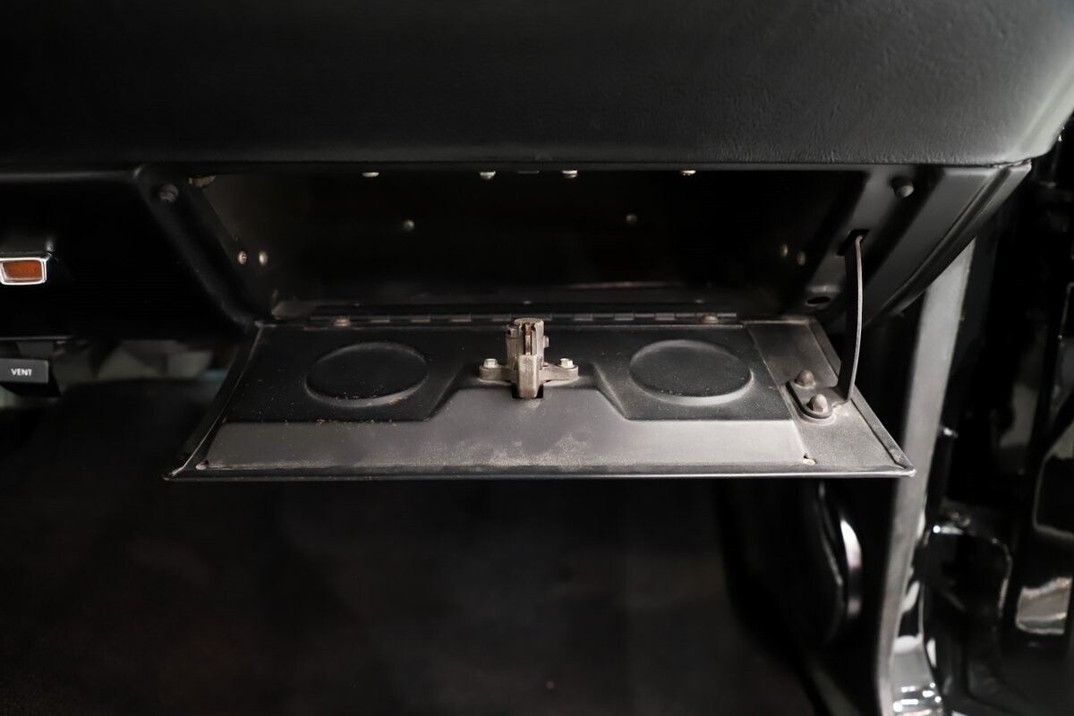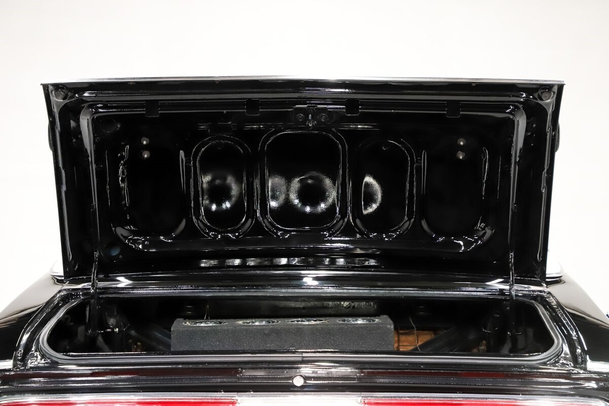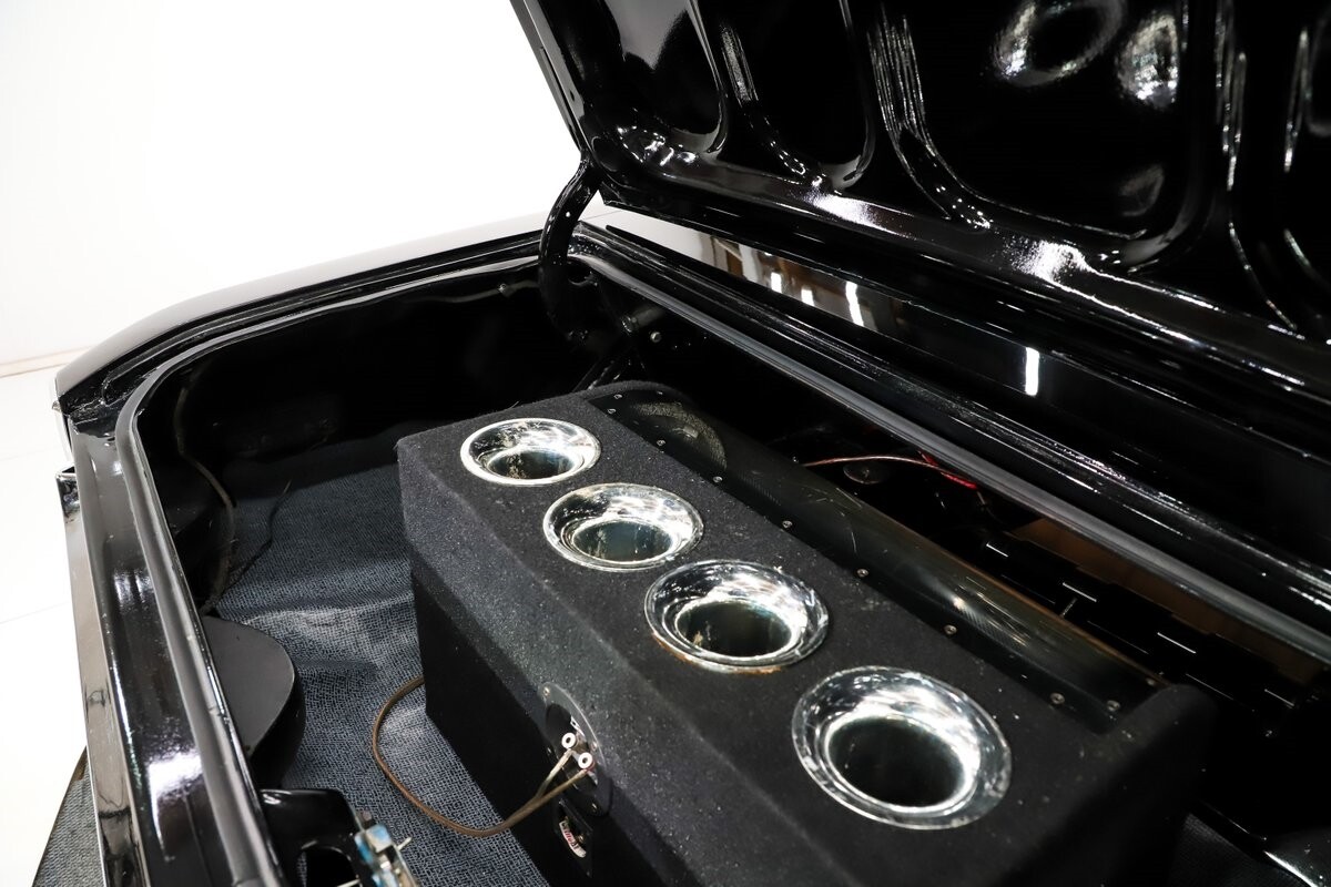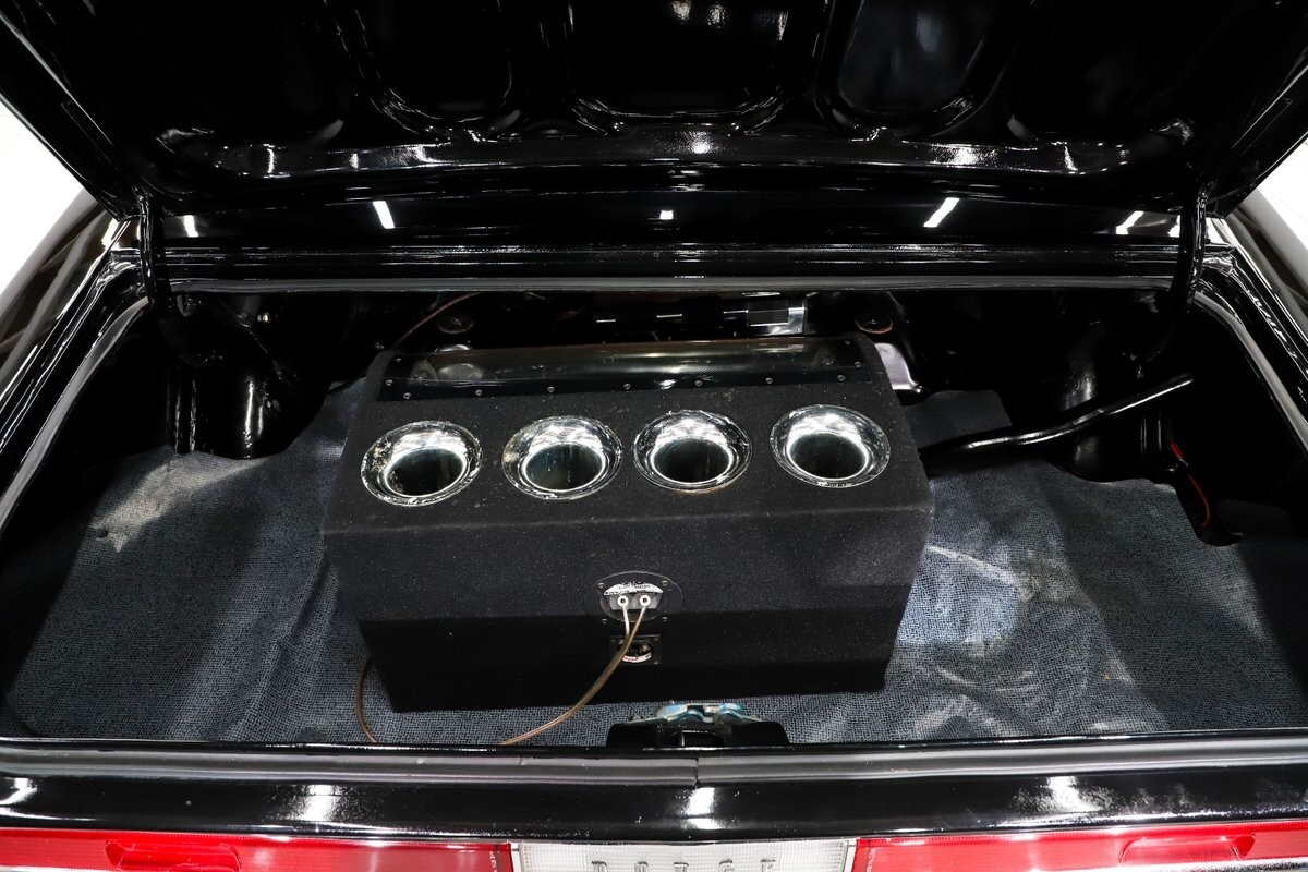 TRUNK COMPARTMENT: Under the trunk lid has been painted smooth, and glossy, as well as the jamb. New weather-stripping has been installed. The entire trunk itself was also painted black and glossy. It is completed with a trunk mat, giant subwoofer with a big amp to power it.