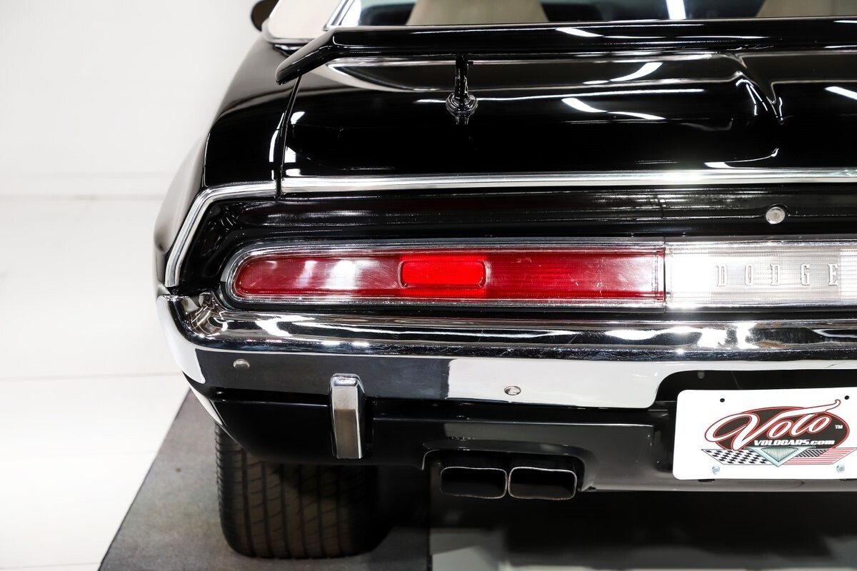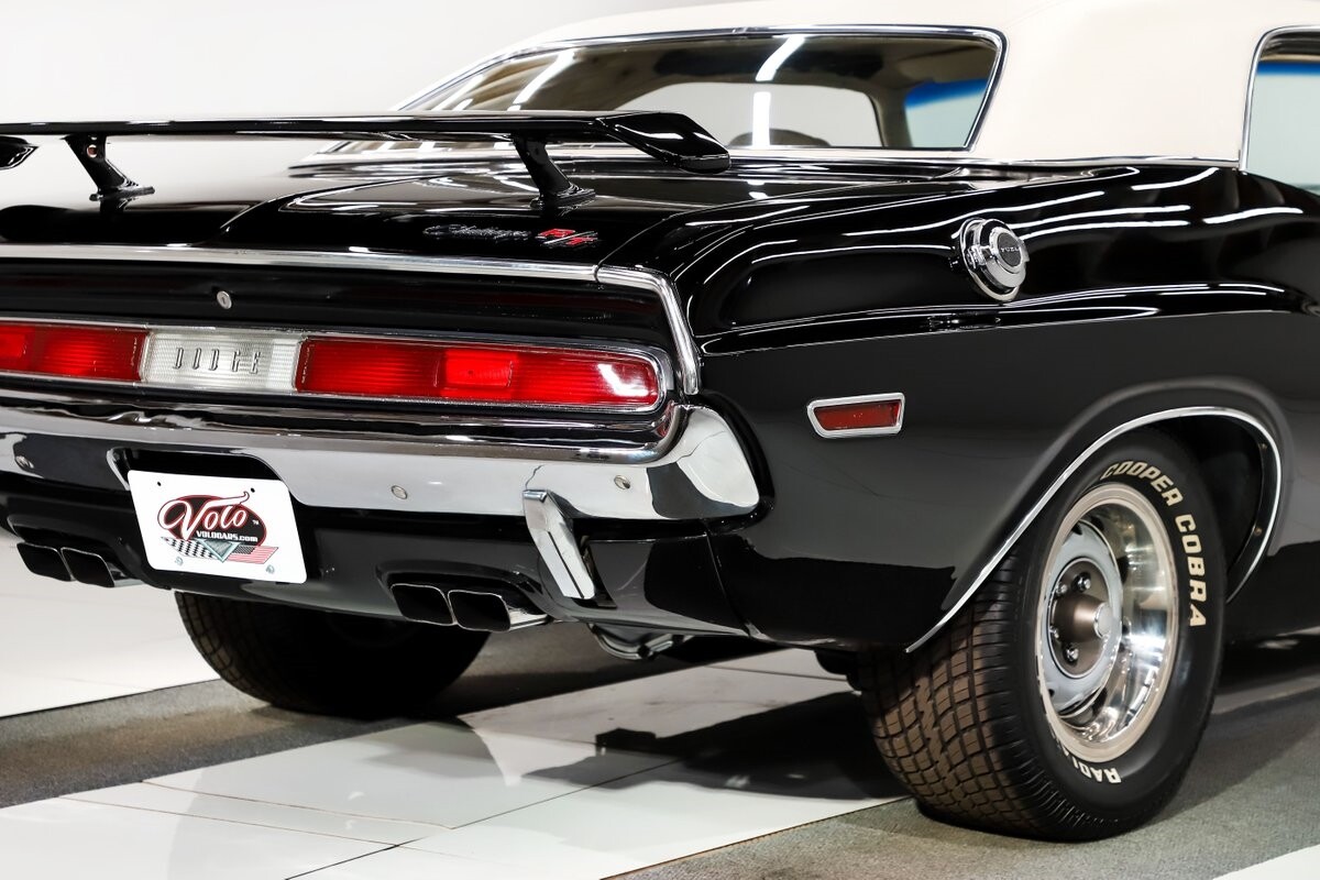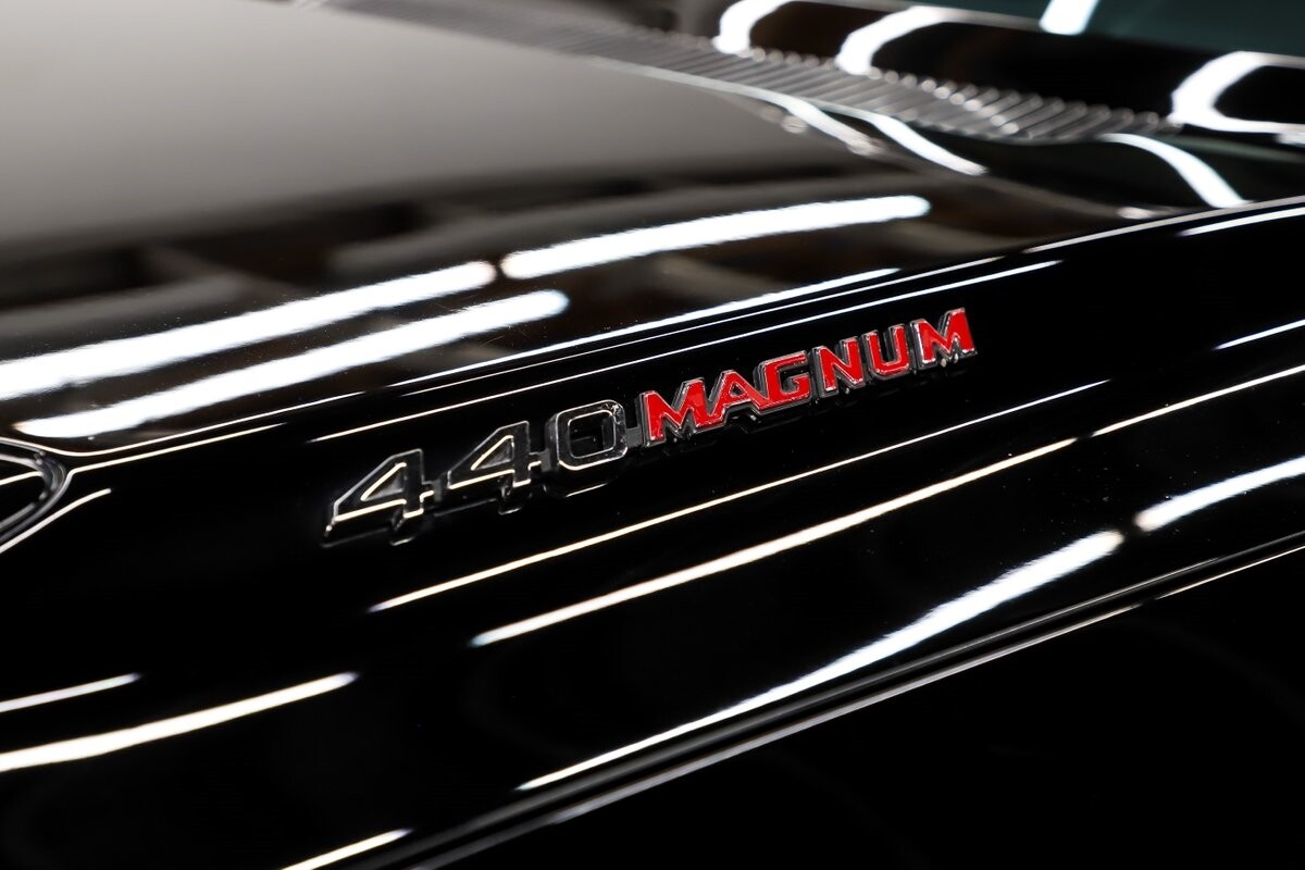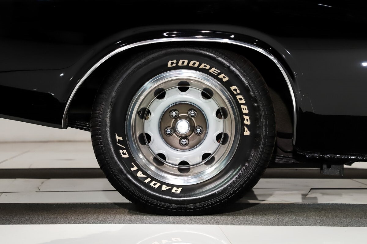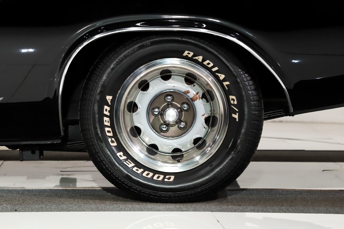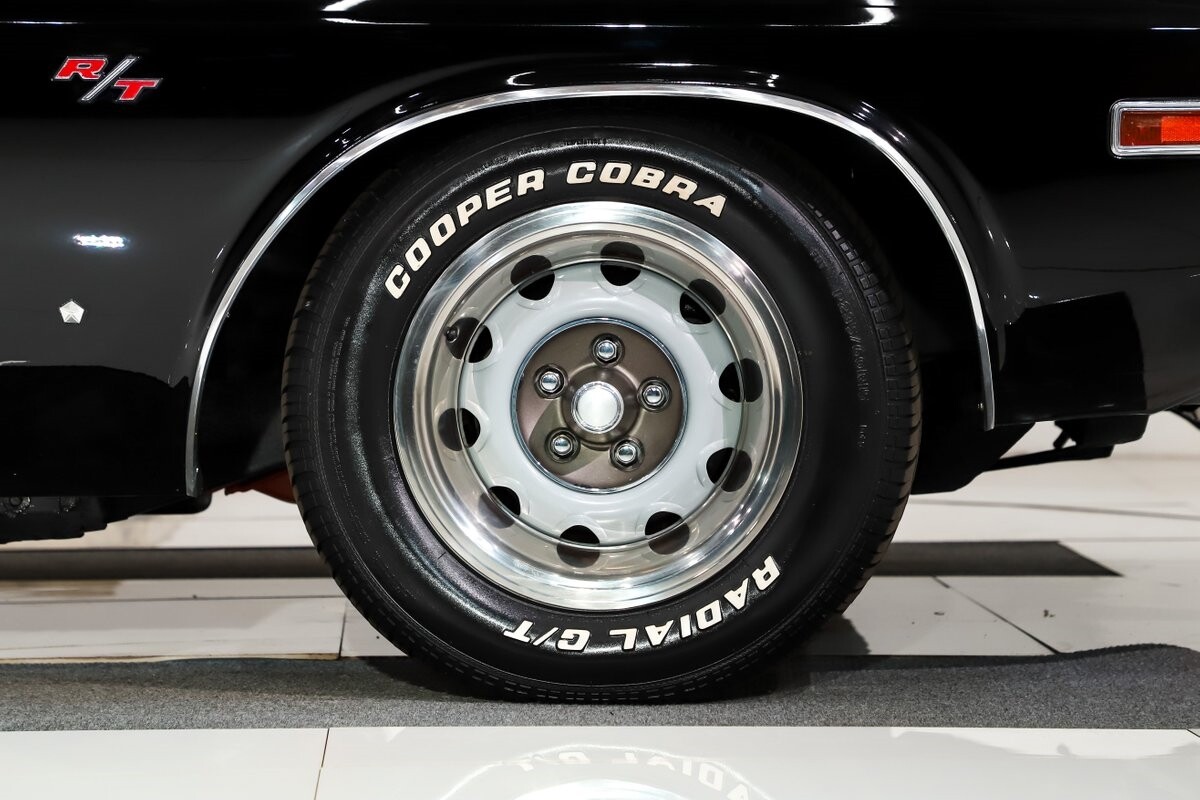 EXTERIOR: Slick mirror like finish. The black paint is polished well enough to shave in. The body panels line up straight. There's no shrinkage or ripples in this paint job! Born with the optional R/T package which features a very stylish front valance, power bulge hood that's fitted with dual hood pins and a racing flip open gas cap. It's stanced perfectly on 15" Rallye wheels with Cooper Cobra radial tires. Now what sets this apart is the white accented vinyl top. It's in very good condition with no cracks or tears. The glass appears to be original and in really good condition. The trim is good with light patina as well as the chrome bumpers. You could add white hood or side stripes to really make it pop!