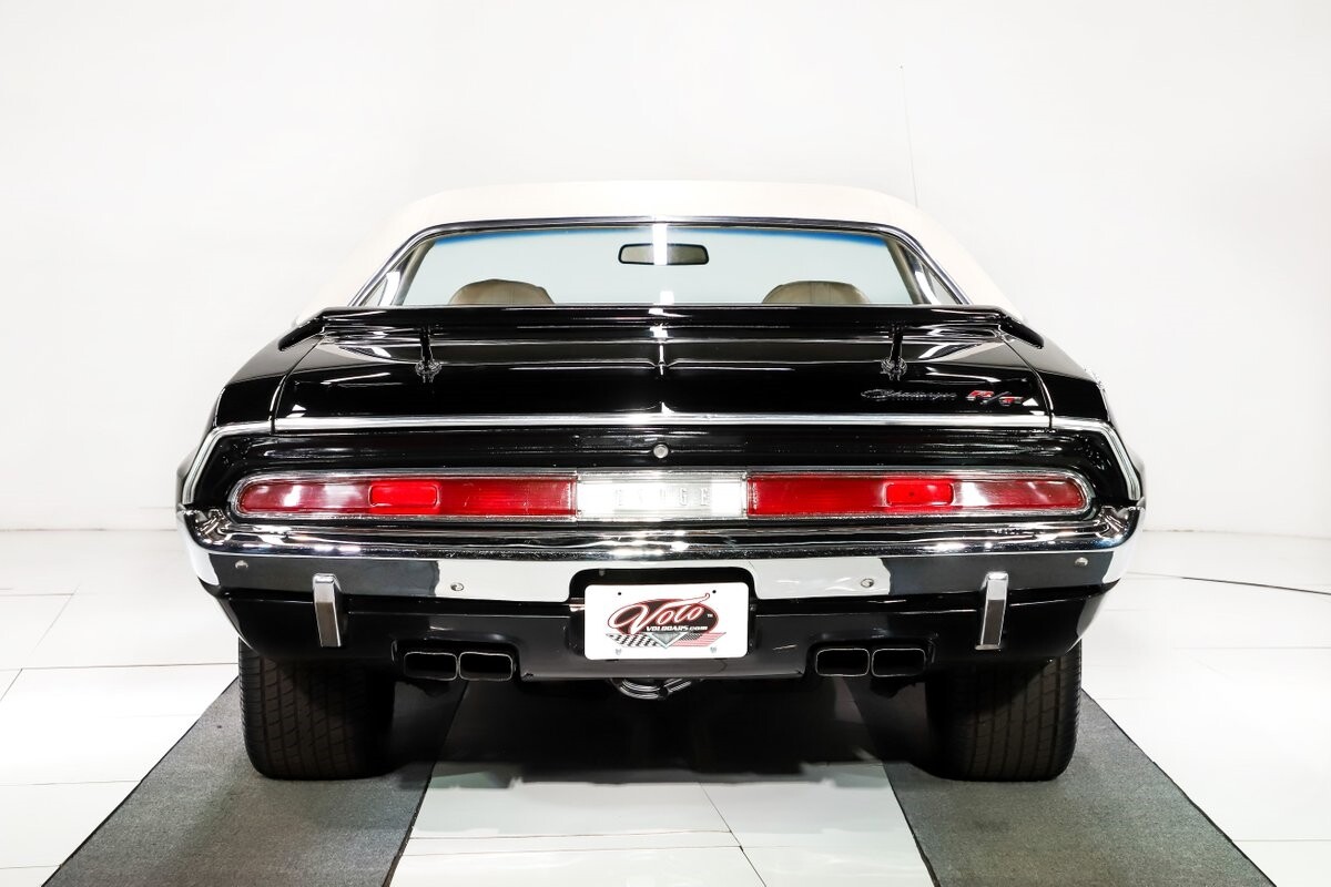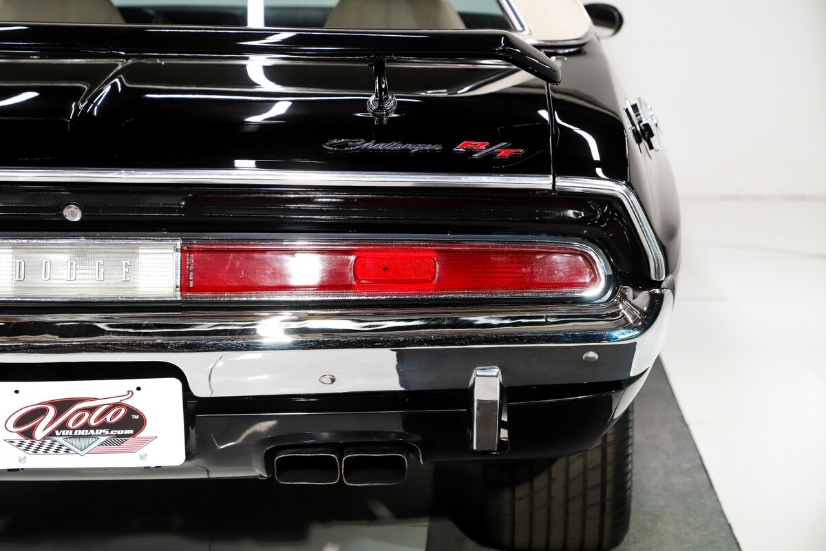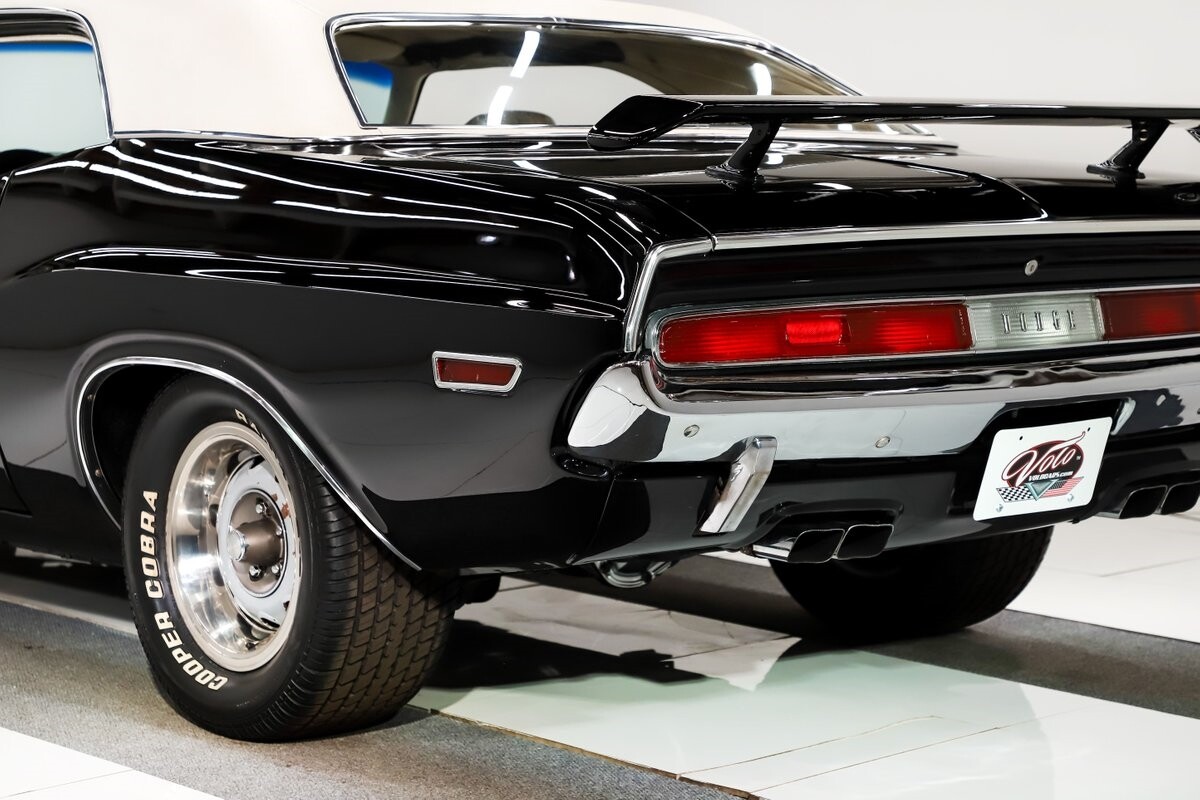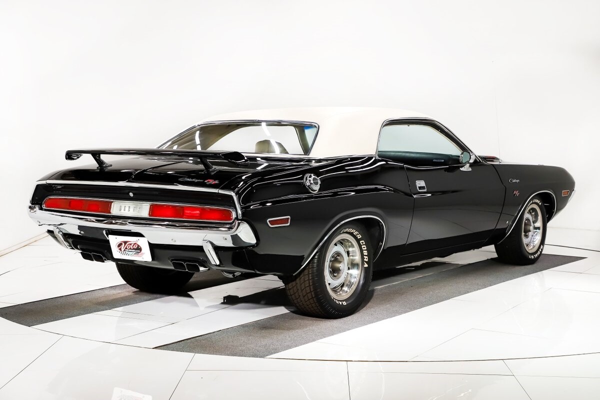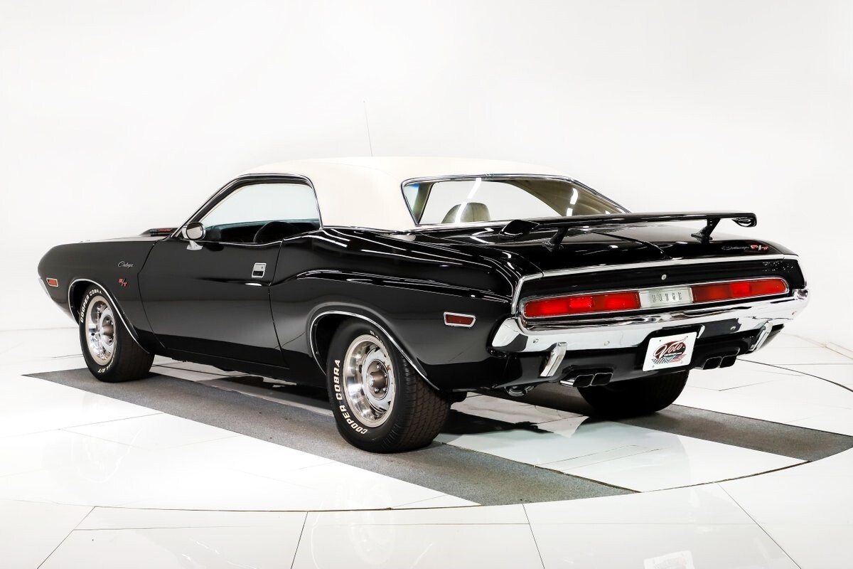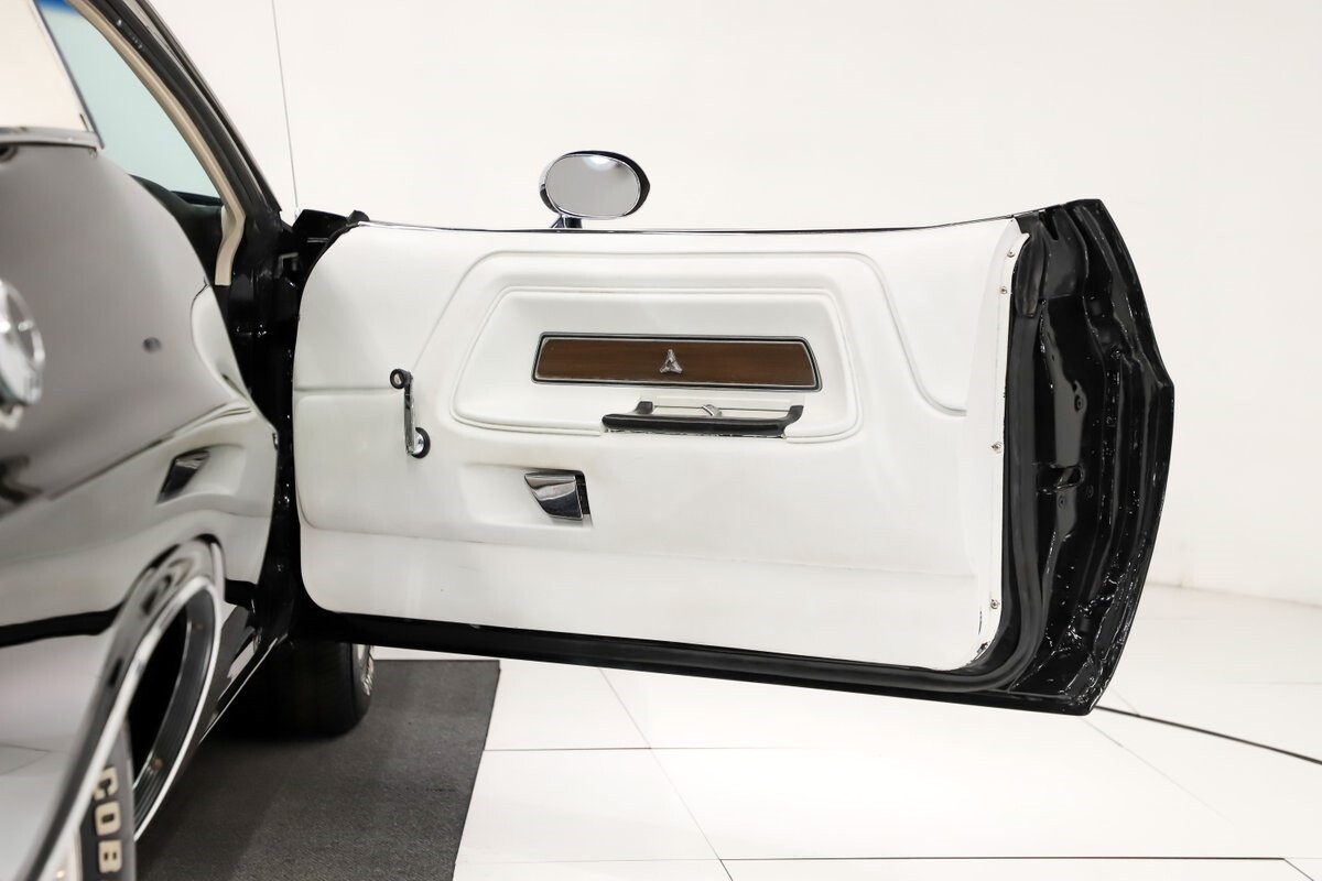 EXTERIOR: Slick mirror like finish. The black paint is polished well enough to shave in. The body panels line up straight. There's no shrinkage or ripples in this paint job! Born with the optional R/T package which features a very stylish front valance, power bulge hood that's fitted with dual hood pins and a racing flip open gas cap. It's stanced perfectly on 15" Rallye wheels with Cooper Cobra radial tires. Now what sets this apart is the white accented vinyl top. It's in very good condition with no cracks or tears. The glass appears to be original and in really good condition. The trim is good with light patina as well as the chrome bumpers. You could add white hood or side stripes to really make it pop!