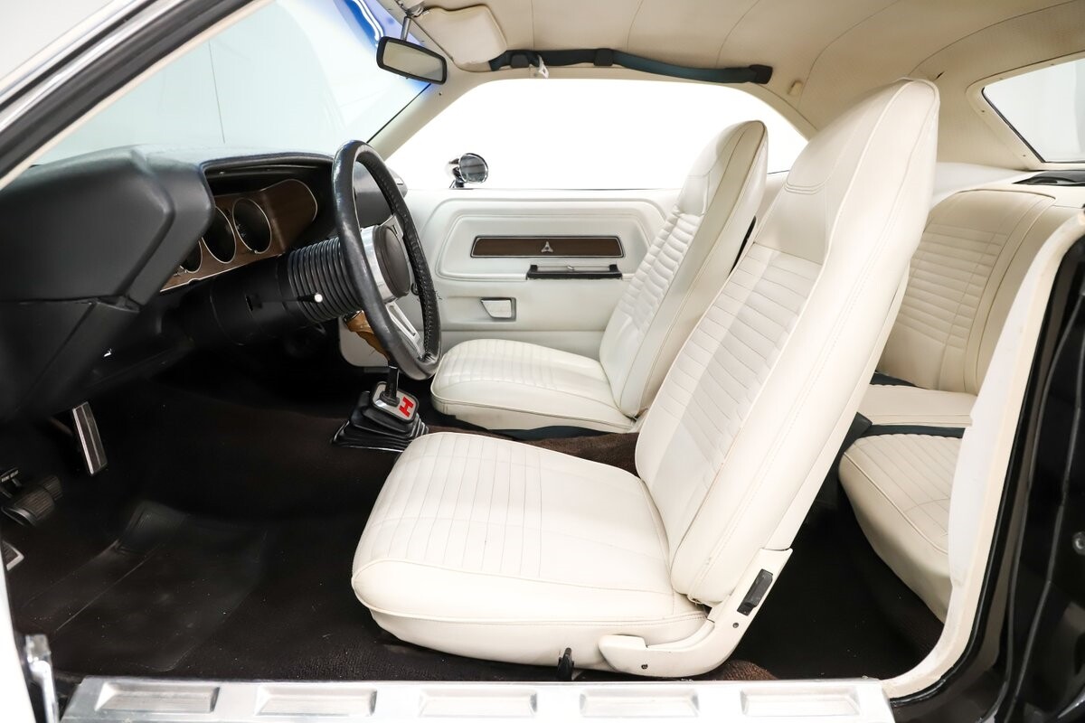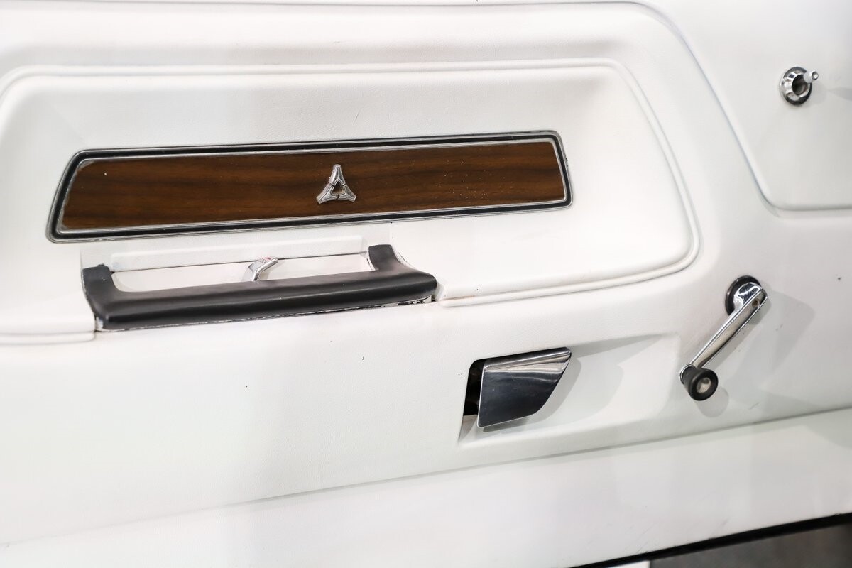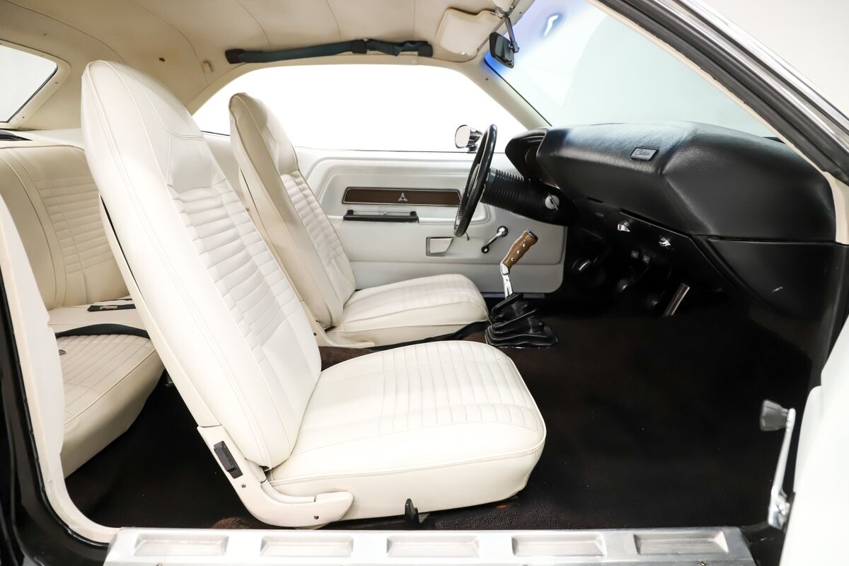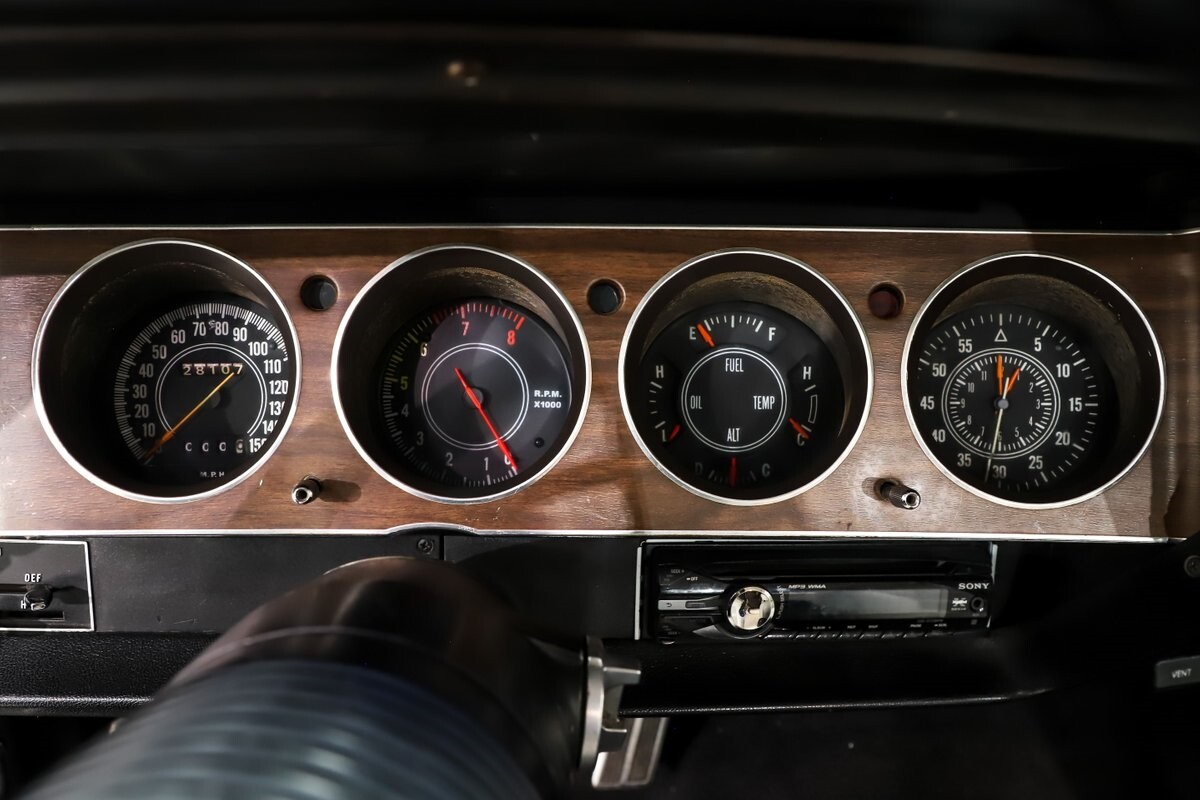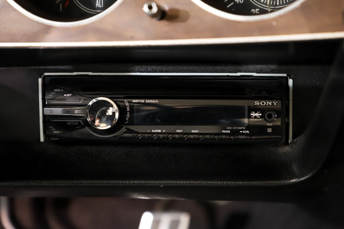 INTERIOR: The interior is good! It's not a brand new restoration but it's nice enough to show off and not be afraid to drive around. Again, the white interior pops so well from the black and really sets this R/T apart from others. The door panels have been dyed white and are in good condition, The white bucket seats are in really good shape with a Hurst 4 speed pistol grip shifter in between them. The carpet fits well, and the headliner is original but still in good shape with minor wear. The woodgrain Rallye dash face is a perfect contrast to the black and white. It appears to be original and still in good shape. It holds working gauges including the tachometer. Last but not least, it's been upgraded with a Sony stereo and custom sound system.