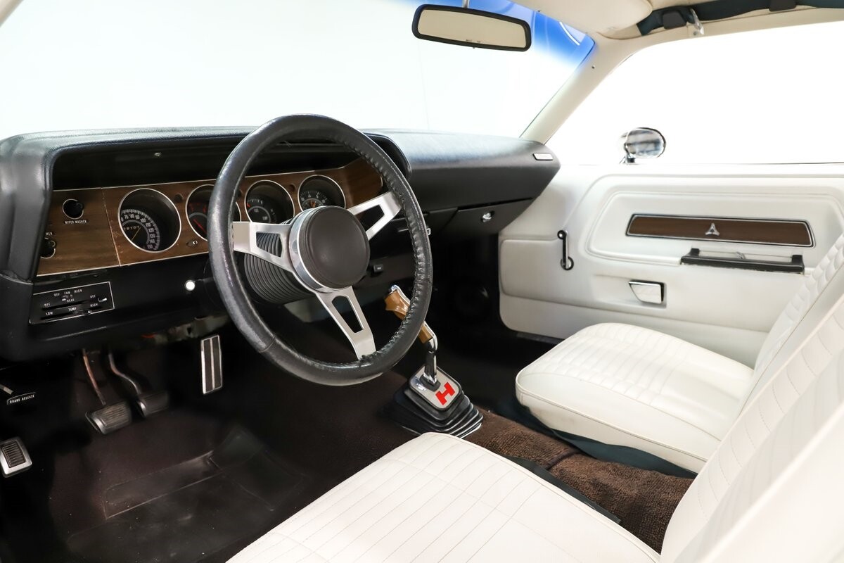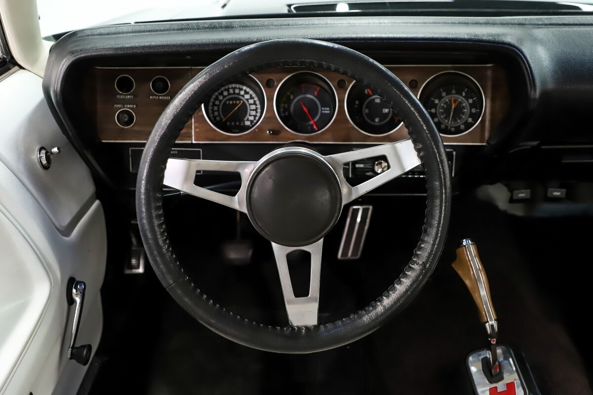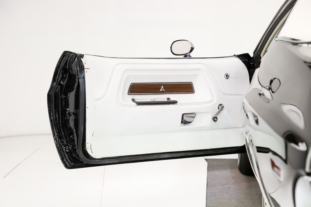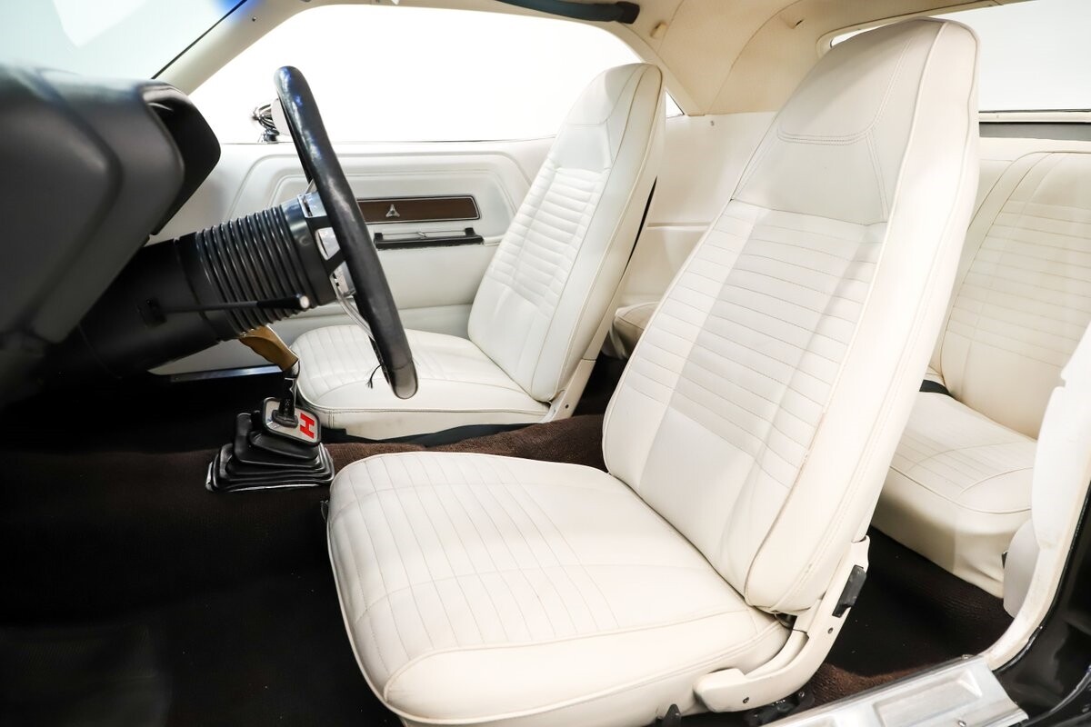 INTERIOR: The interior is good! It's not a brand new restoration but it's nice enough to show off and not be afraid to drive around. Again, the white interior pops so well from the black and really sets this R/T apart from others. The door panels have been dyed white and are in good condition, The white bucket seats are in really good shape with a Hurst 4 speed pistol grip shifter in between them. The carpet fits well, and the headliner is original but still in good shape with minor wear. The woodgrain Rallye dash face is a perfect contrast to the black and white. It appears to be original and still in good shape. It holds working gauges including the tachometer. Last but not least, it's been upgraded with a Sony stereo and custom sound system.