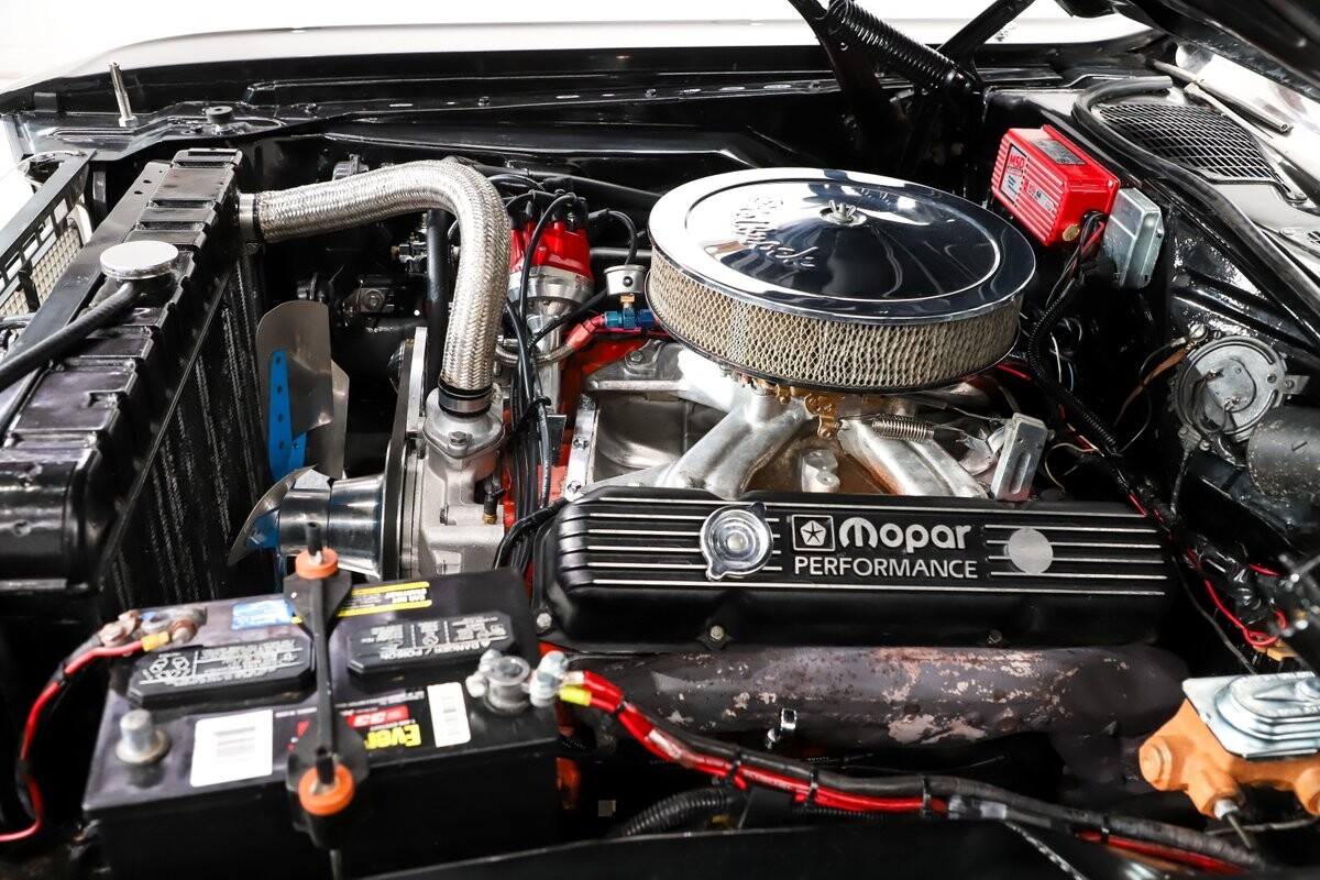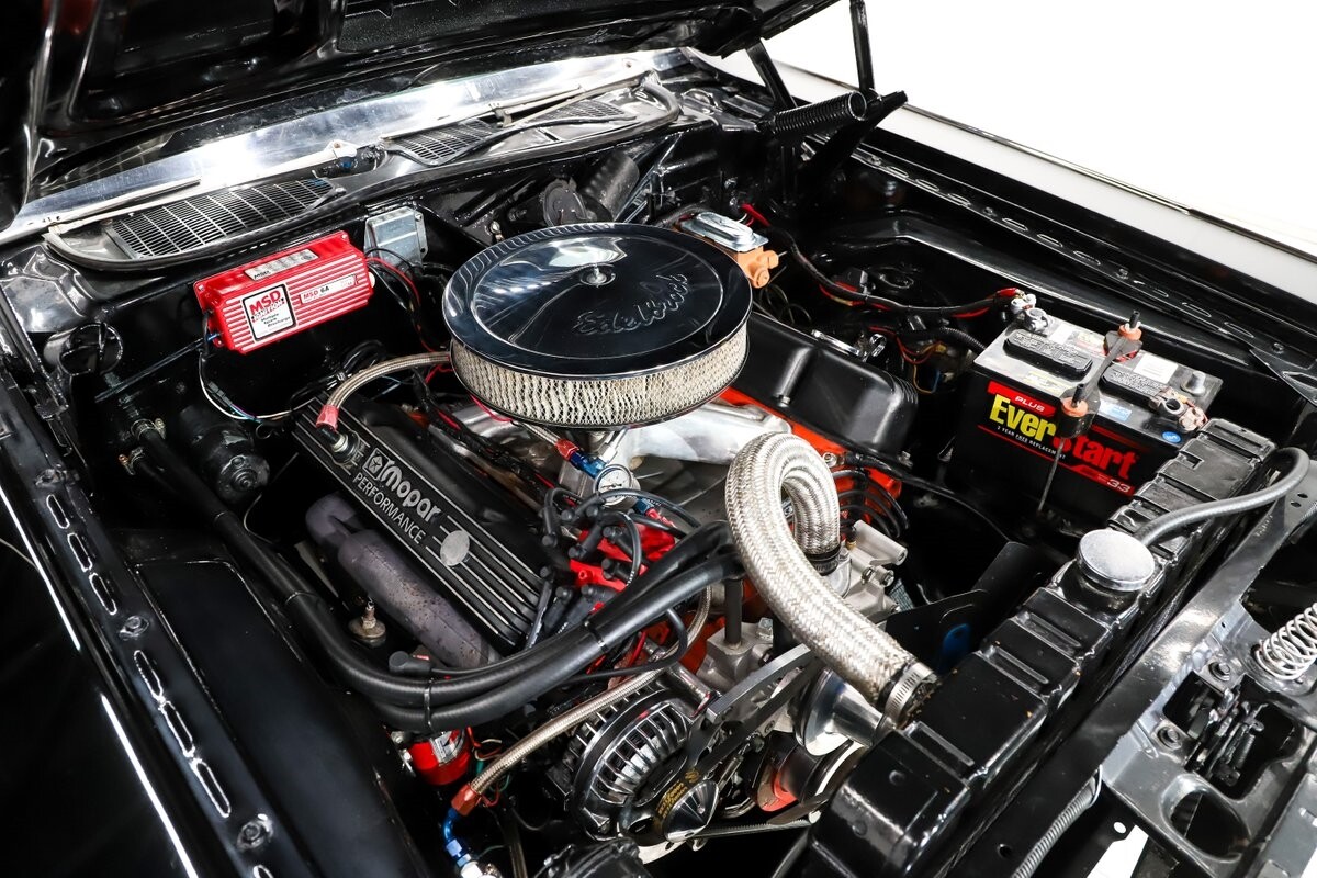 ENGINE COMPARTMENT: Under the hood is impressive! It's been upgraded to a period correct 440ci engine pushing 450HP. Built with flat top pistons, and a nice 509 Mopar Cam. It's completed with MSD ignition, aluminum high rise intake with dual feed Holly carb, Edelbrock air cleaner, billet pulleys and brackets, and a fuel pressure regulator with AN hoses and fittings.