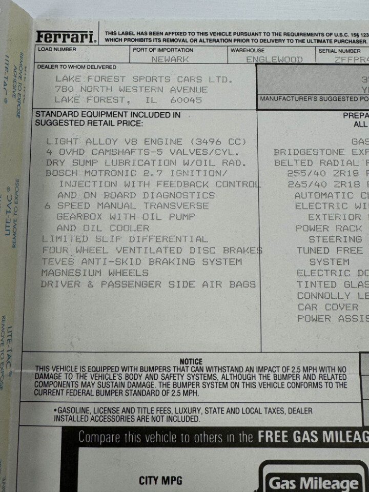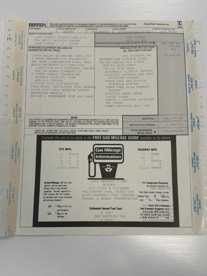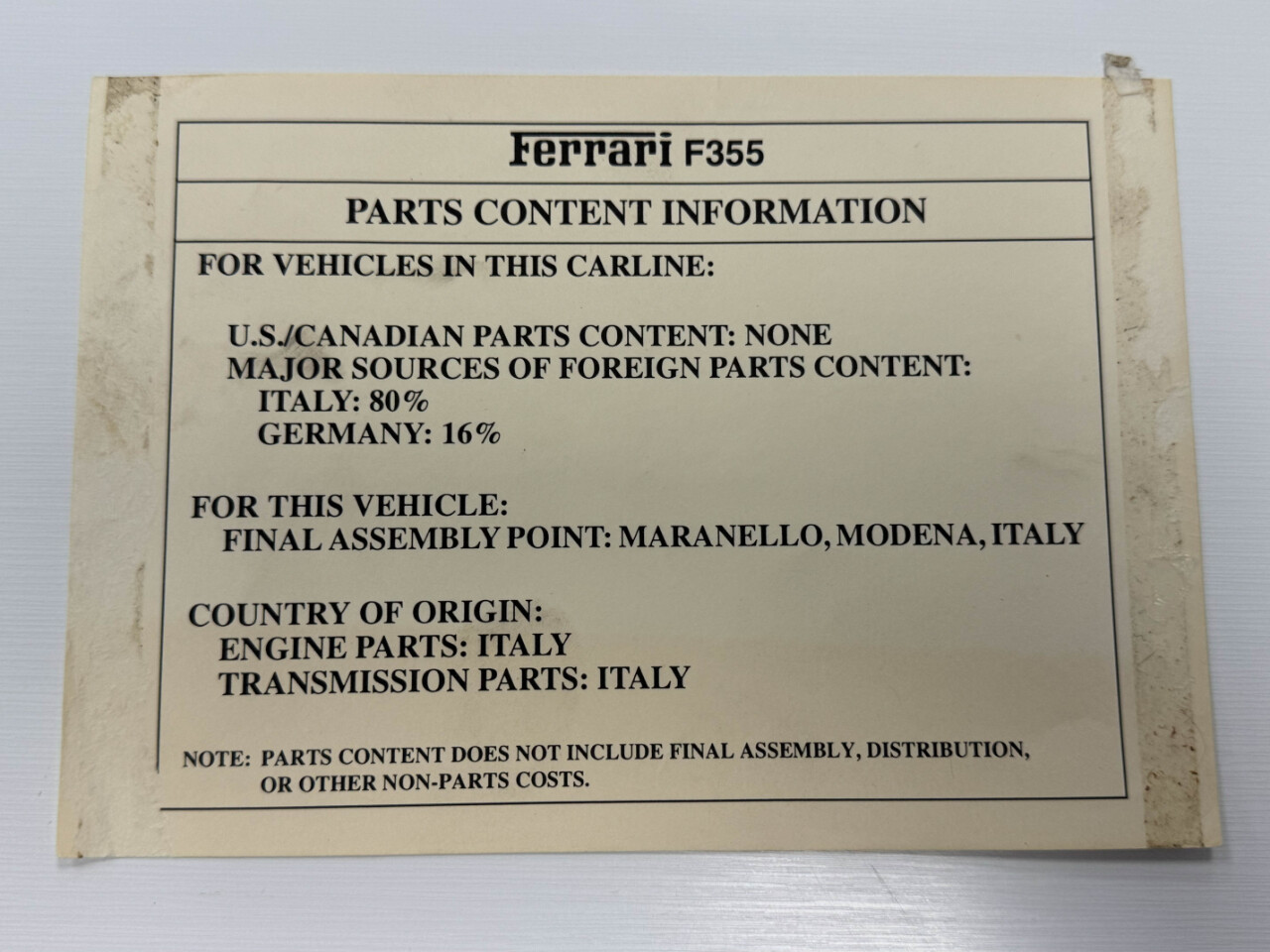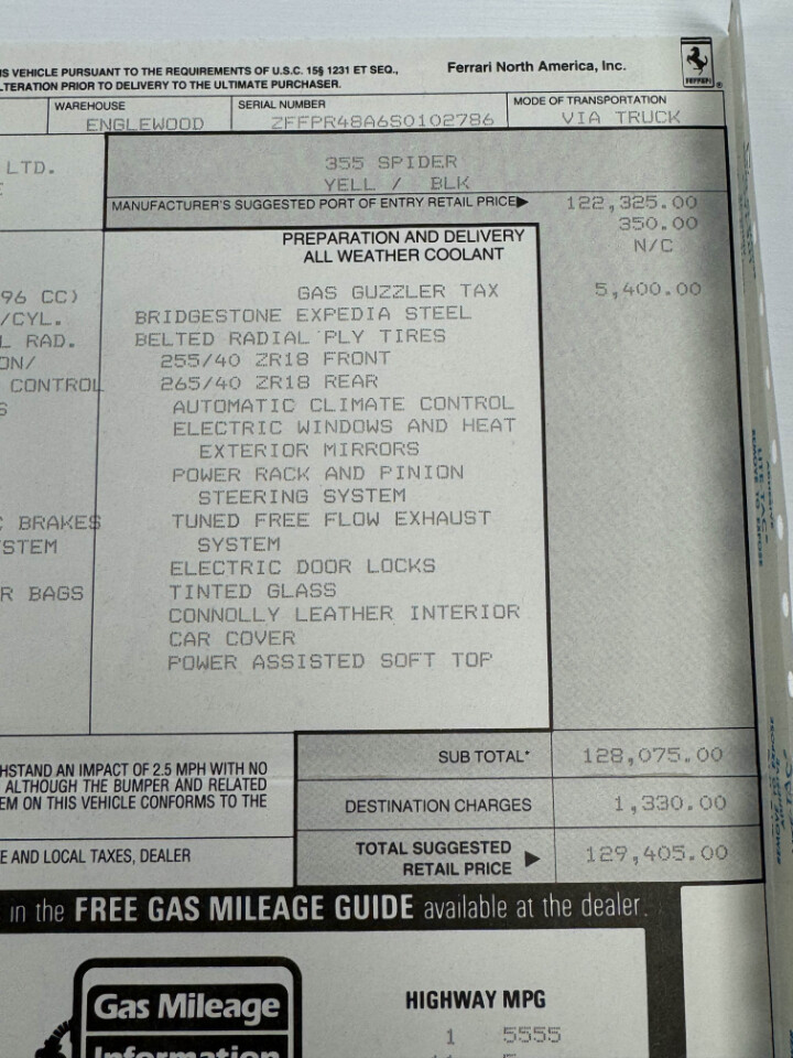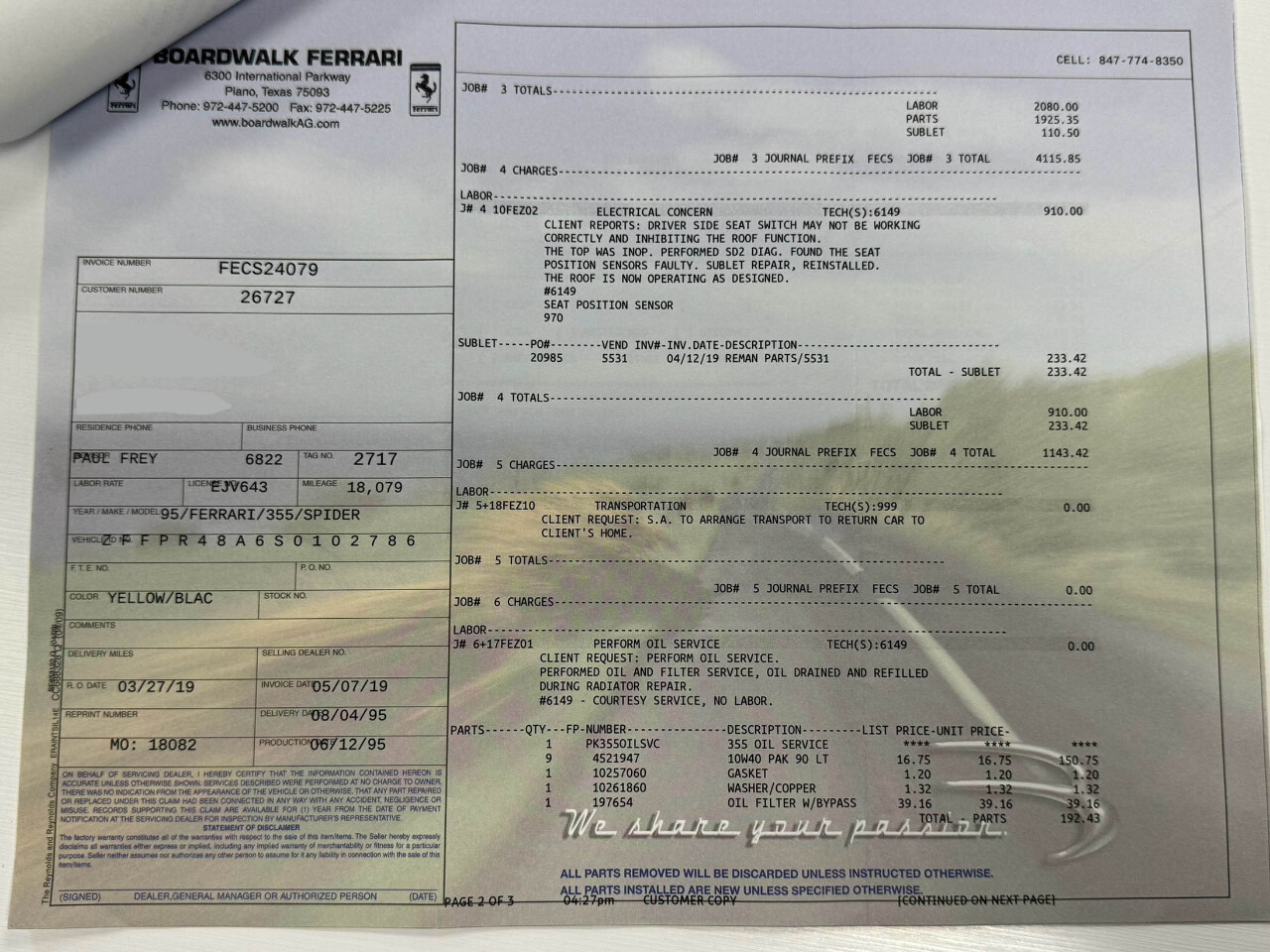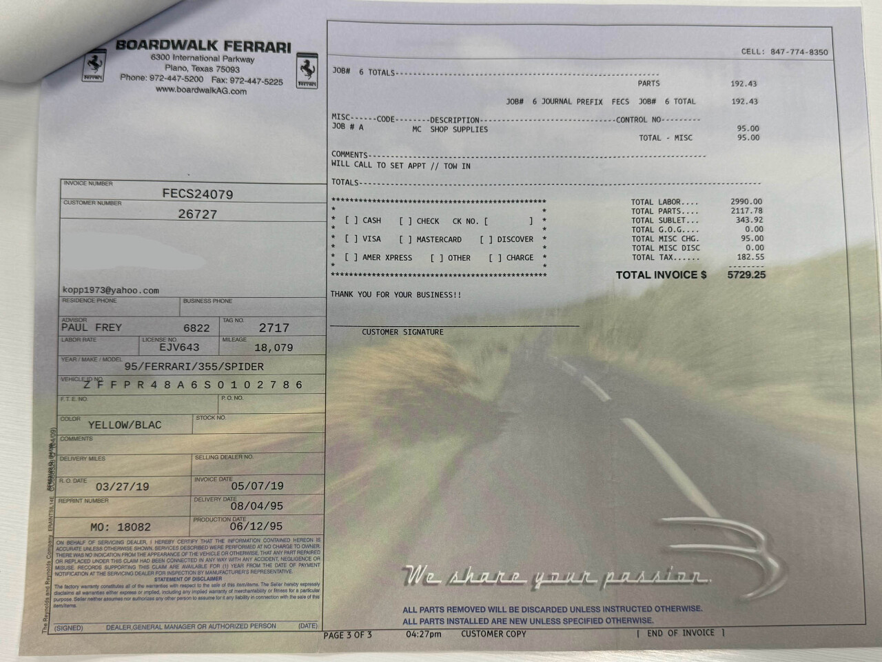 FULL HIGH RESOLUTION PHOTOS AND DETAILED DESCRIPTION ON YOU HAVE A VEHICLE YOU ARE LOOKING TO SELL, PLEASE CALL US AT 770-769-1398WE SHOW VEHICLES BY APPOINTMENT ONLY. PLEASE CALL TO SCHEDULE AN APPOINTMENT IN ORDER TO VIEW A LISTING IN PERSON.NEW ARRIVAL! RECENT ENGINE OUT TIMING BELT SERVICE PERFORMED IN DECEMBER 2023! HIGHLY ORIGINAL, LOW-MILE FERRARI F355 SPIDER WITH A GATED 6 SPEED MANUAL IN AMAZING SHAPE!! NEW MICHILEN TIRES INSTALLED LESS THAN 500 MILES AGO! HAS PPF ON FRONT CLIP AND HIGH IMPACT AREAS! ALWAYS SERVICED ON TIME, BEAUTIFUL CAR INSIDE AND OUT. RUNS AND DRIVES AMAZING! COMES WITH BOOKS, MANUALS, ORIGINAL TOOL KIT, CAR COVER, SERVICE RECORDS, AND ORIGINAL WINDOW STICKER!EXTERIOR IS FINISHED INGIALLO MODENA WITHBLACKLEATHER INTERIOR.FACTORY OPTIONS AND FEATURES INCLUDE:3.5L 5V V8 ENGINE6-SPEED GATED MANUAL TRANSMISSIONREAR WHEEL DRIVEUPGRADED SONY HEAD UNITBLACK POWER-ASSISTED SOFT TOPPOWER WINDOWS18 5 SPOKE MAGNESIUM WHEELSPOP UP HEADLAMPSPOWER RACK AND PINION STEERING SYSTEMTUNED FREE FLOW EXHAUSTLIMITED SLIP DIFFERENTIALFOUR WHEEL VENTILATED DISC BRAKESAND MORE.GAS MOTORCARS IS A FAMILY OWNED AND OPERATED CAR DEALERSHIP LOCATED IN MARIETTA, GA. WE ONLY SELL VEHICLES OF THE HIGHEST QUALITY. WE SHIP VEHICLES WORLDWIDE AT THE BUYER'S EXPENSE. WE TAKE CONSIGNMENTS AS WELL AS TRADES.WE SHOW VEHICLES BY APPOINTMENT ONLY.PLEASE CALL AHEAD TO SCHEDULE A DATE AND TIME IN ORDER TO VIEW A LISTING IN PERSON.CONNECT WITH US ON INSTAGRAM @GASMOTORCARSIt is the customers sole responsibility to verify the existence and condition of any equipment listed. Neither the dealership nor DealerCarSearch is responsible for misprints on prices or equipment. It is the customers sole responsibility to verify the accuracy of the prices with the dealer, including the pricing for all added accessories. Visit Gas Motorcars online at to see more pictures of this vehicle or call us at770-769-1398 today to schedule your test drive.