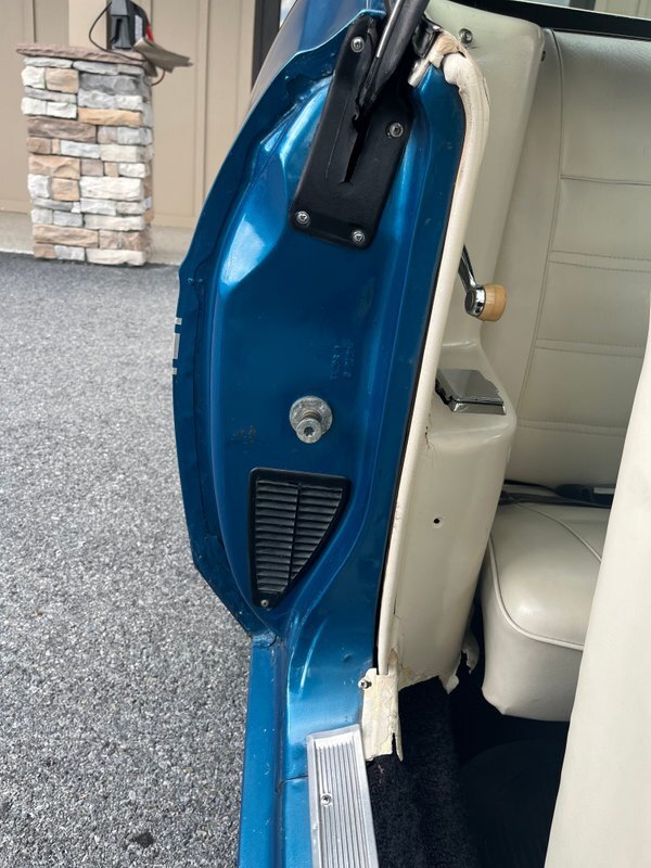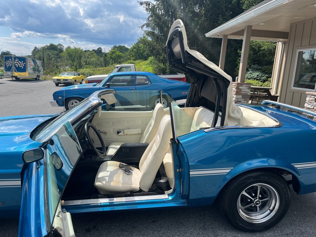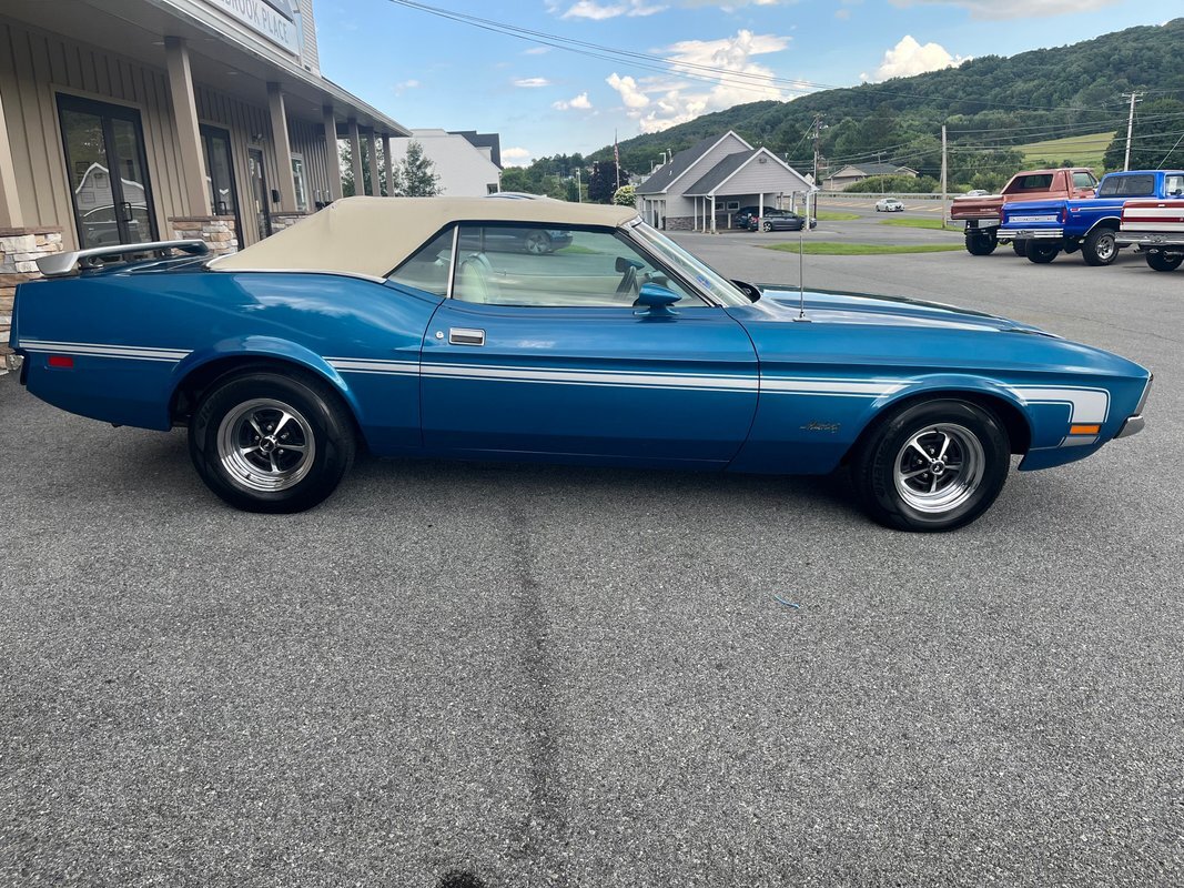 The 1971 Ford Mustang Convertible is a classic icon, featuring a robust 302 cubic inch V8 engine paired with a rebuilt carburetor and automatic transmission, delivering a thrilling driving experience. Its power-operated White convertible top adds convenience and elegance to the stunning Blue exterior. Inside, a White interior exudes timeless charm, complemented by a racing stripe that adds a sporty touch. The non-functional NASA hood adds a touch of nostalgia and style. This Mustang has undergone extensive maintenance and upgrades, including repairs to the water pump mounting, radiator hoses, valve cover gaskets, and freeze plugs on cylinder heads. Additionally, transmission leaks have been sealed, and various components such as idler arms, tie rods, dash bulbs, and the headlight switch have been replaced. Take note to cracks in dash and also cracking on passenger rear interior. With power steering, replaced lines, pump, and gearbox, this Mustang offers effortless maneuverability and control. The front and rear wheel cylinders have been replaced and brakes cleaned, ensuring optimal stopping power. This 1971 Ford Mustang Convertible combines classic design, performance, and meticulous maintenance for a truly memorable driving experience.