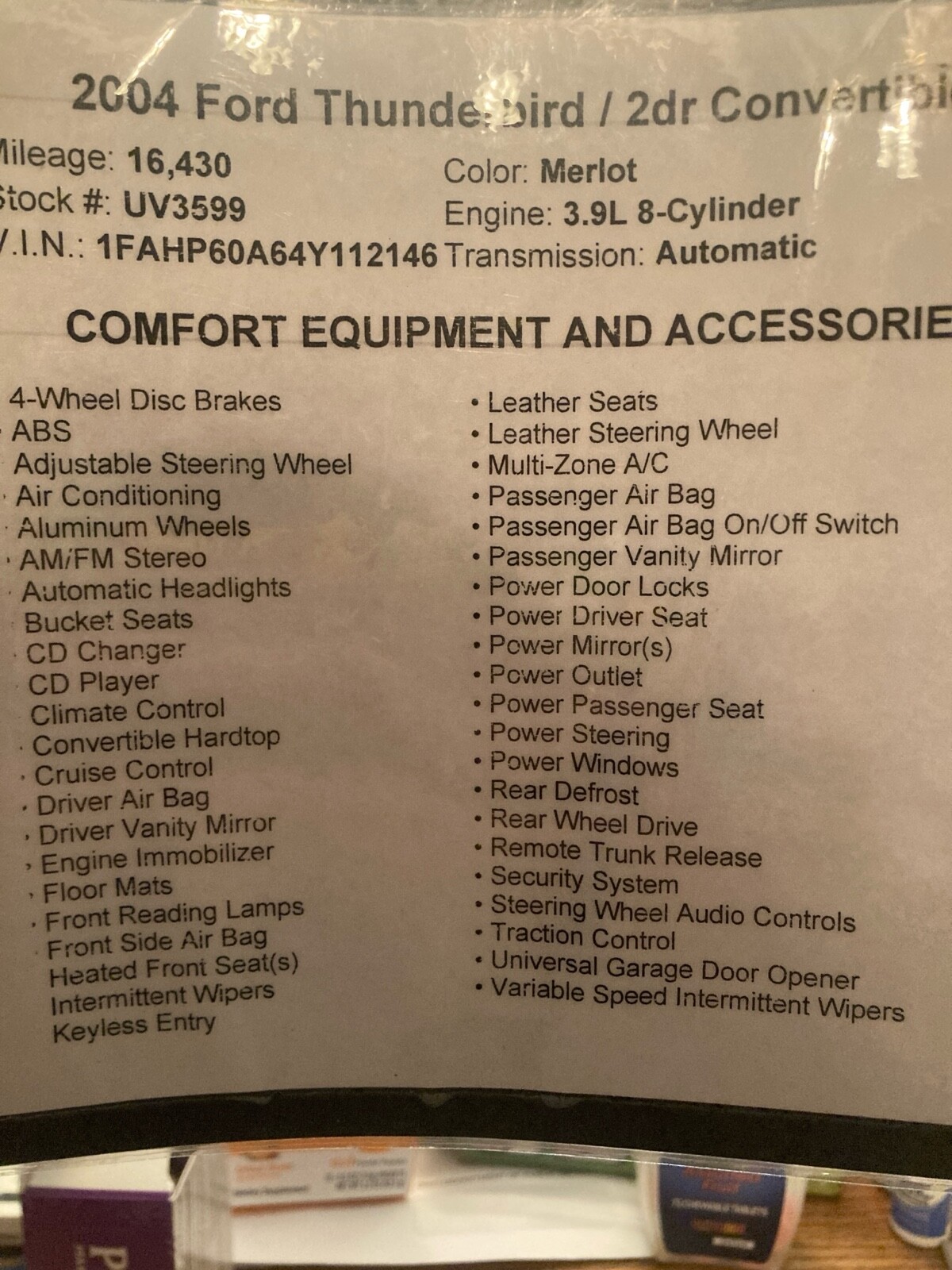 This 2004 Ford Thunderbird is a great addition to any car collection. With its vibrant burgundy color and sleek design, it's sure to turn heads. The vehicle has been well-maintained and has only had one owner for the past 5+ years. The Thunderbird is perfect for those who love classic cars and want to add a touch of nostalgia to their collection. Its mileage is at 20400 and it's been titled as "clean". This car is ideal for those who are looking for a unique and rare find. Don't miss out on the opportunity to own this piece of history.Seller's Notes