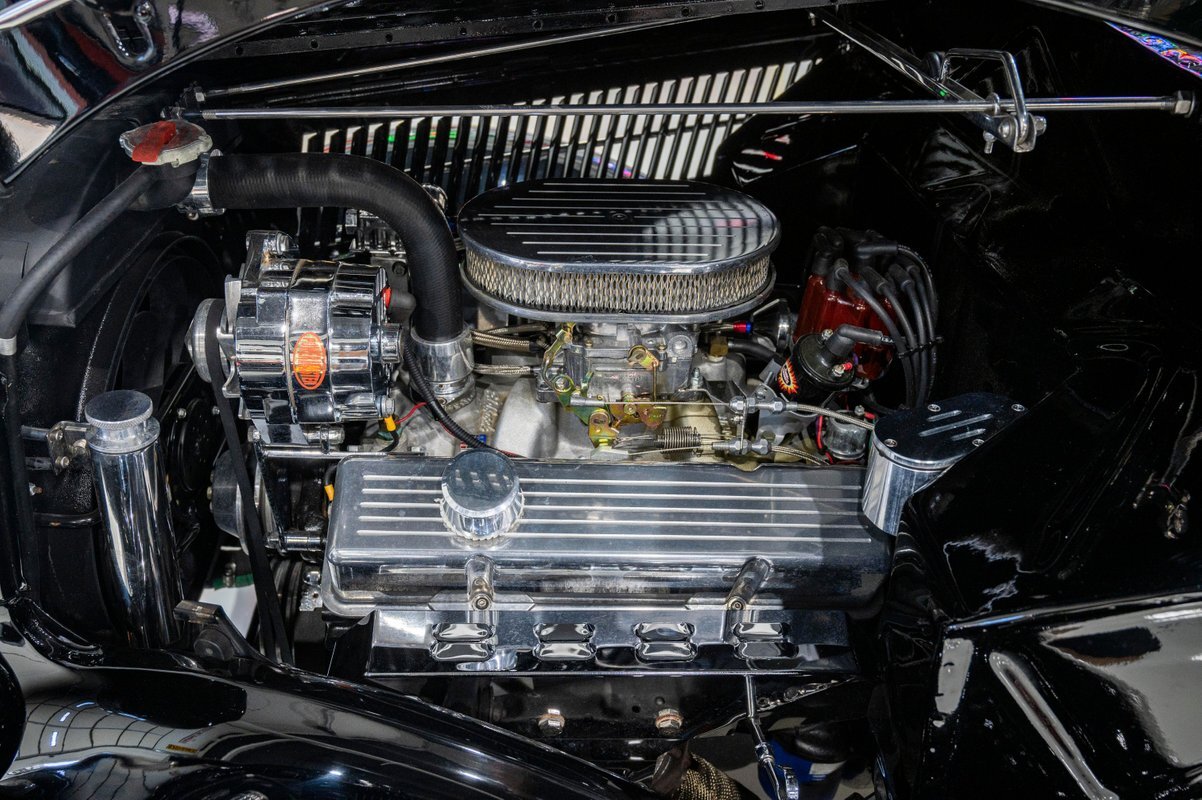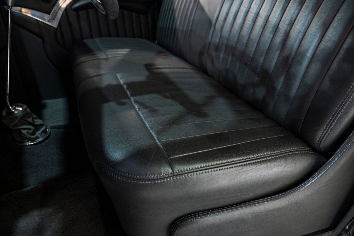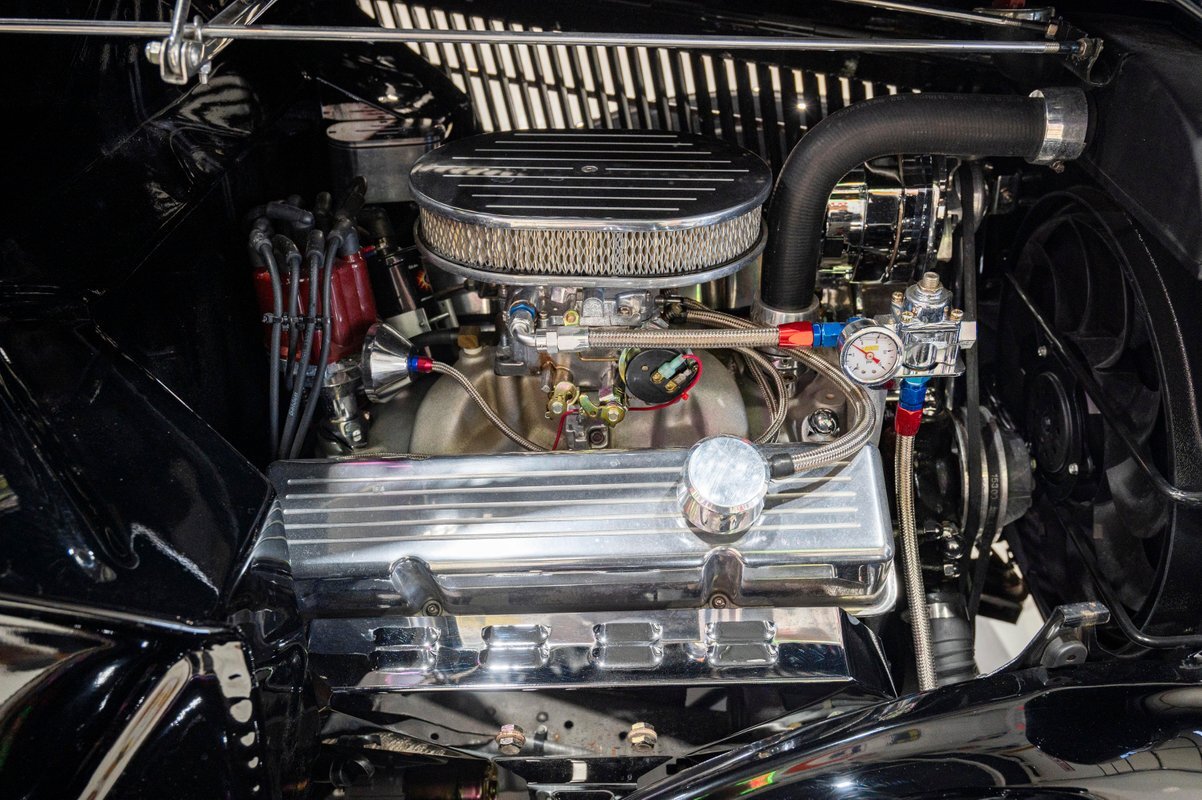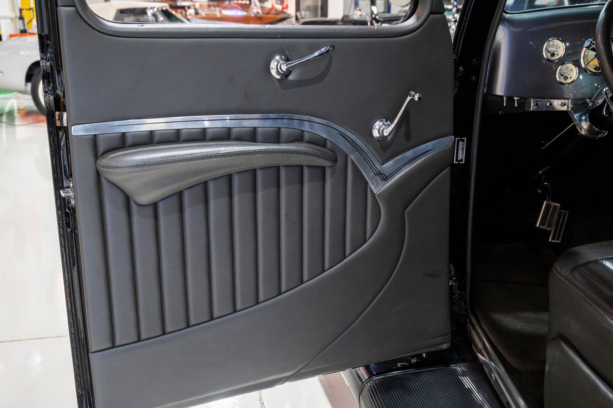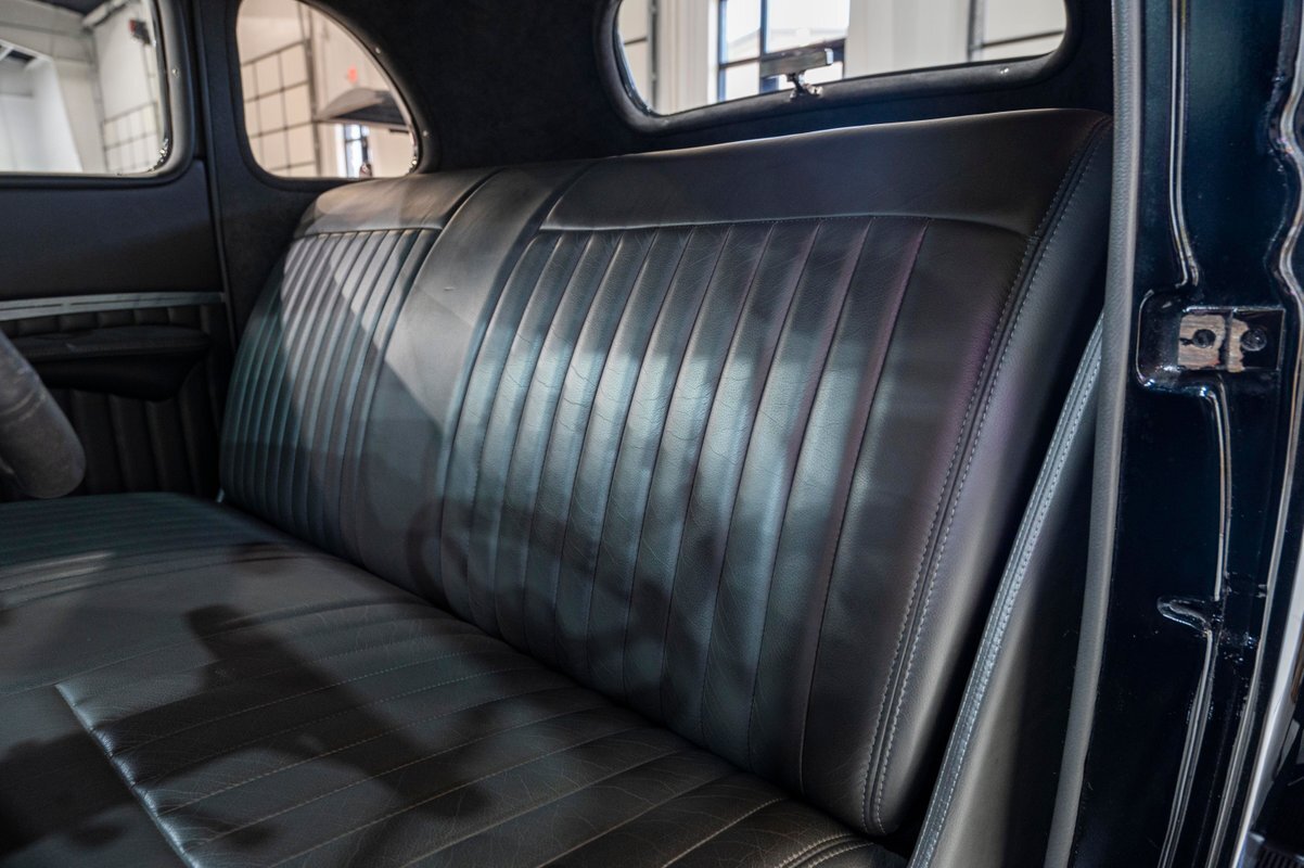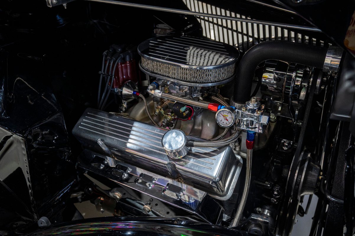 Finished in classic black exterior with new gray leather seats this recent restoration features tastefull styling throughout. Showcasing this build is a smooth-running 350 Chevy V-8, automatic, rack & pinion steering, and a host of engine details that are hallmarks of the best street rods. The care in restoration is evident everywhere, from the chromed alternator, polished valve covers, overflow tank and master cylinder to the chromed steering column with a "banjo" steering wheel. Topping it all off are modern VDO gauges, and steel wheels with early Ford hubcaps to complete the modern retro look.