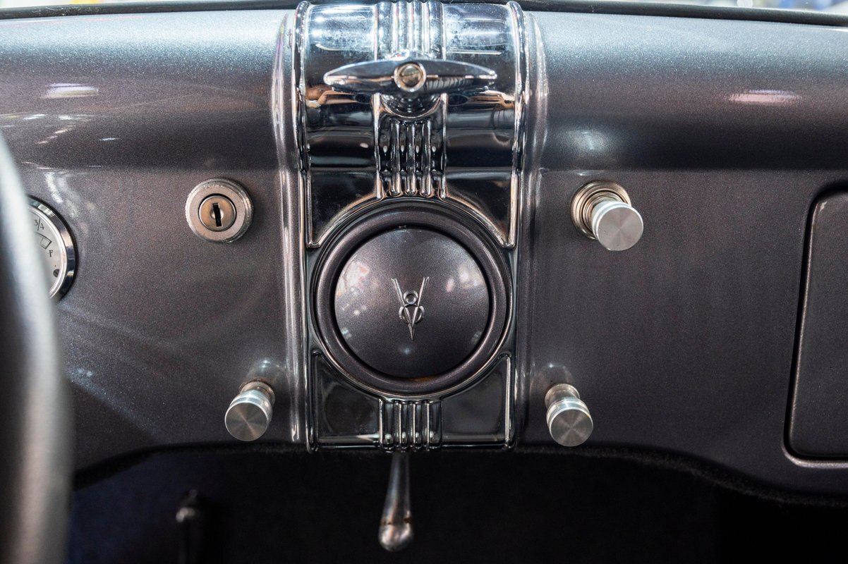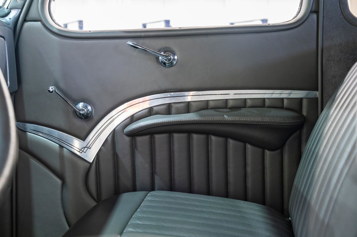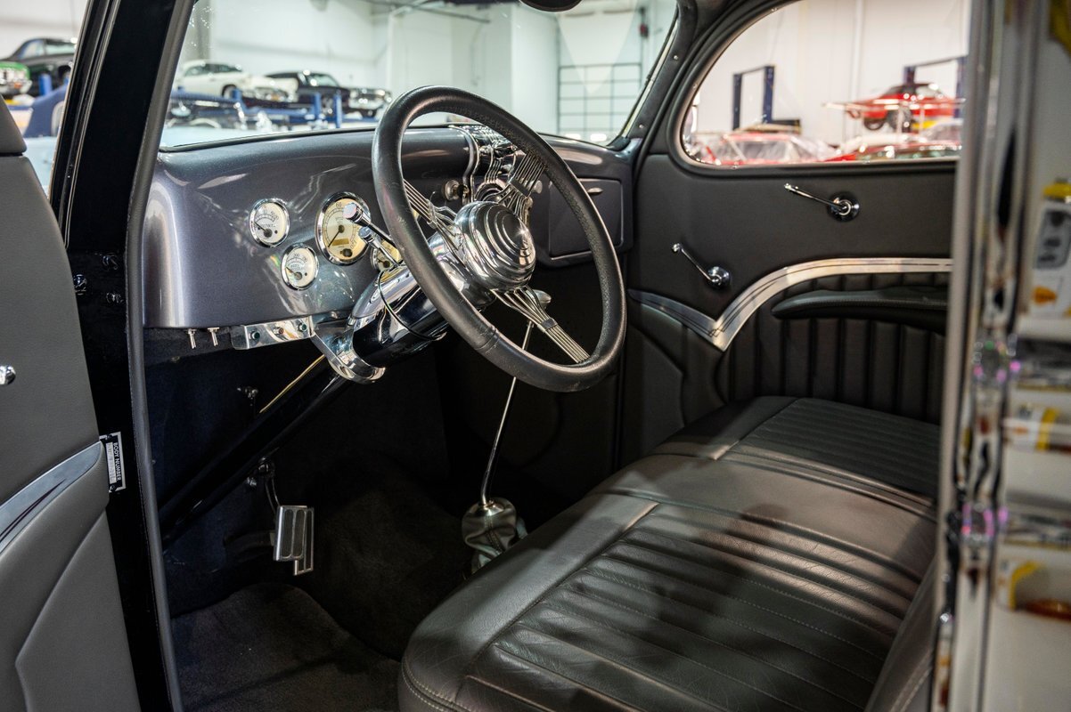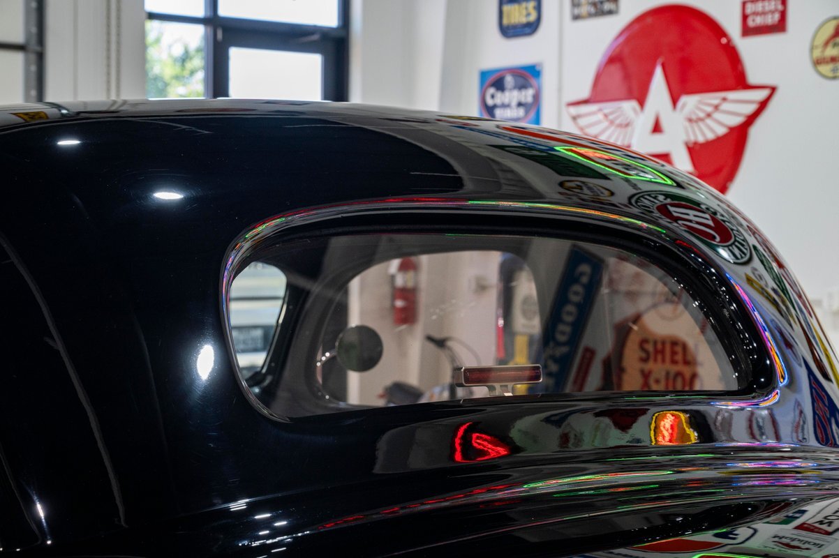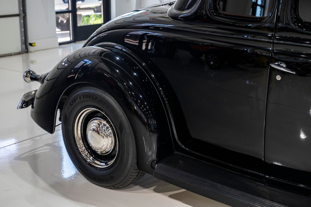 Finished in classic black exterior with new gray leather seats this recent restoration features tastefull styling throughout. Showcasing this build is a smooth-running 350 Chevy V-8, automatic, rack & pinion steering, and a host of engine details that are hallmarks of the best street rods. The care in restoration is evident everywhere, from the chromed alternator, polished valve covers, overflow tank and master cylinder to the chromed steering column with a "banjo" steering wheel. Topping it all off are modern VDO gauges, and steel wheels with early Ford hubcaps to complete the modern retro look.