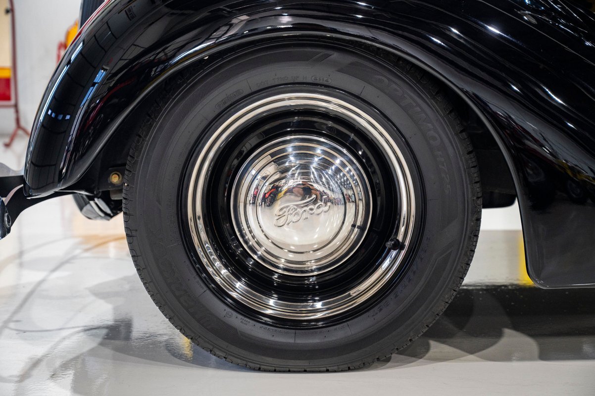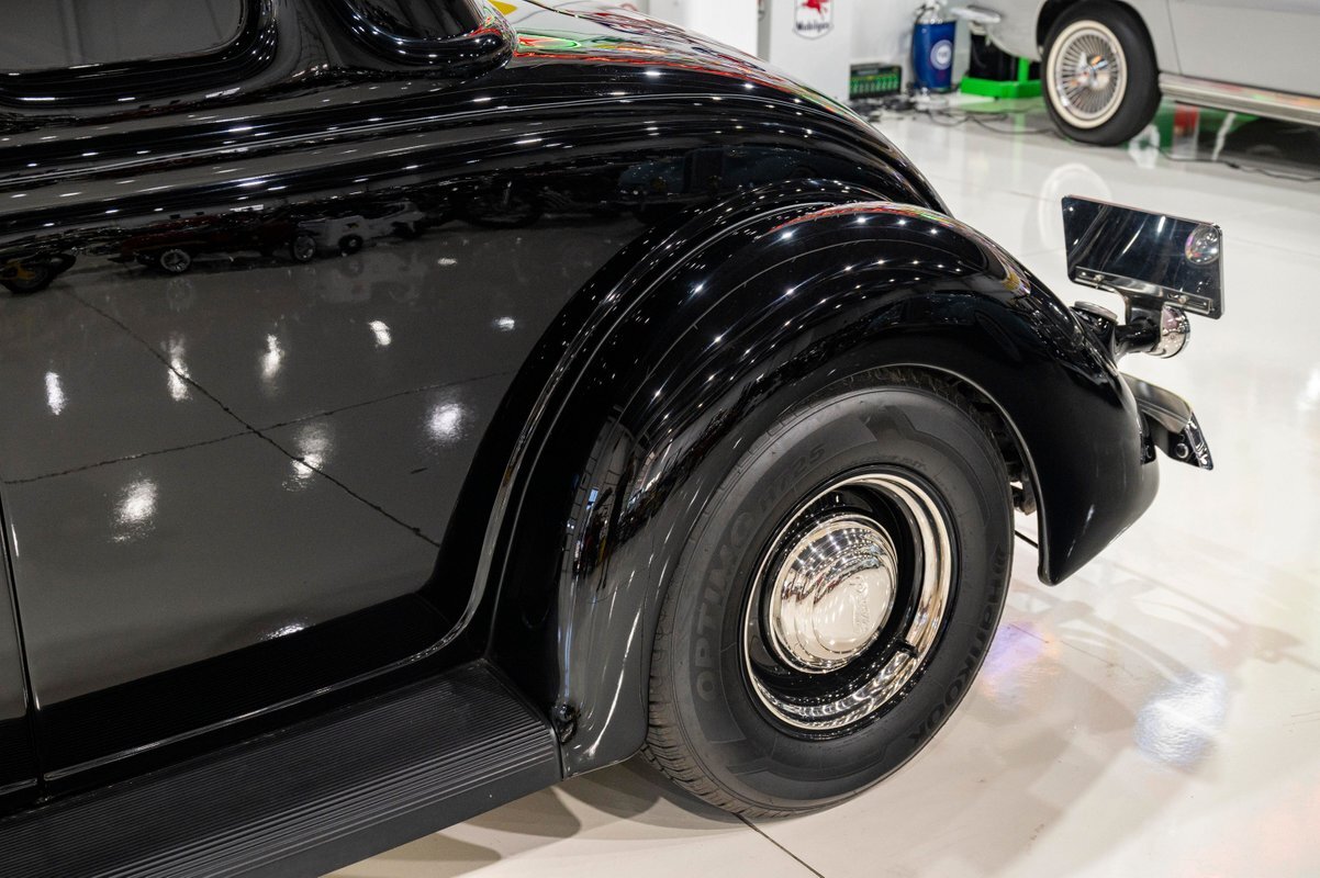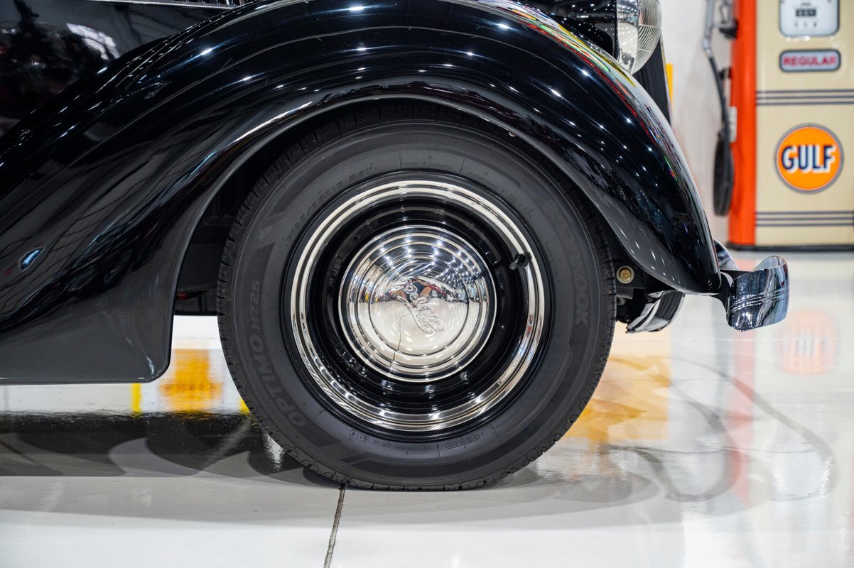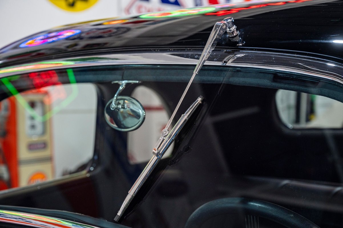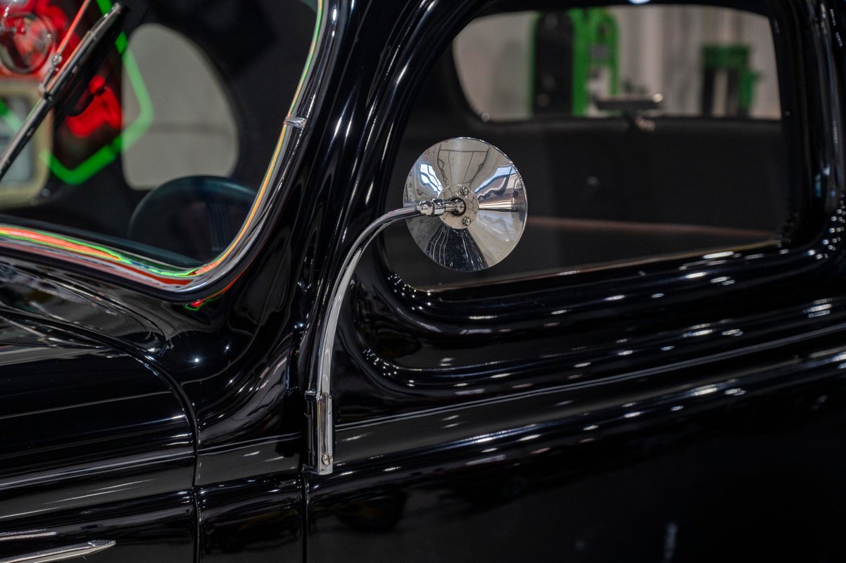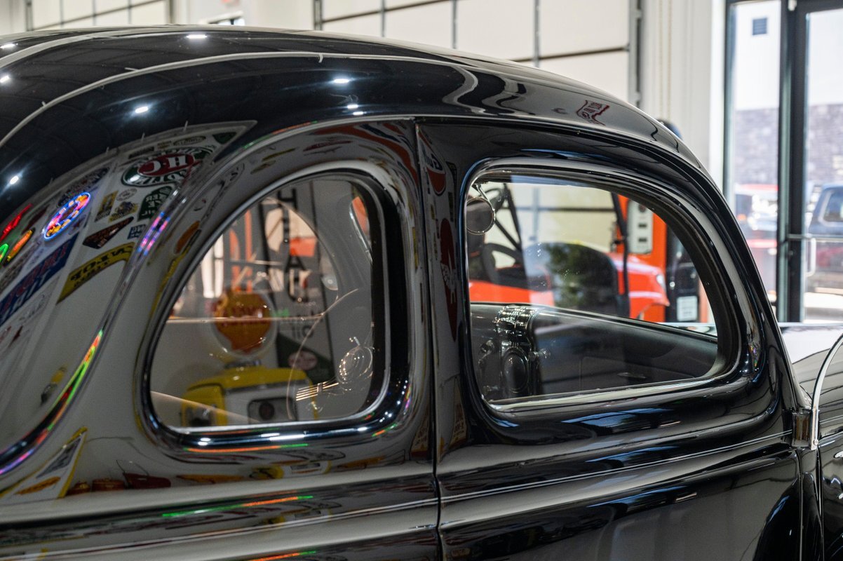 Finished in classic black exterior with new gray leather seats this recent restoration features tastefull styling throughout. Showcasing this build is a smooth-running 350 Chevy V-8, automatic, rack & pinion steering, and a host of engine details that are hallmarks of the best street rods. The care in restoration is evident everywhere, from the chromed alternator, polished valve covers, overflow tank and master cylinder to the chromed steering column with a "banjo" steering wheel. Topping it all off are modern VDO gauges, and steel wheels with early Ford hubcaps to complete the modern retro look.