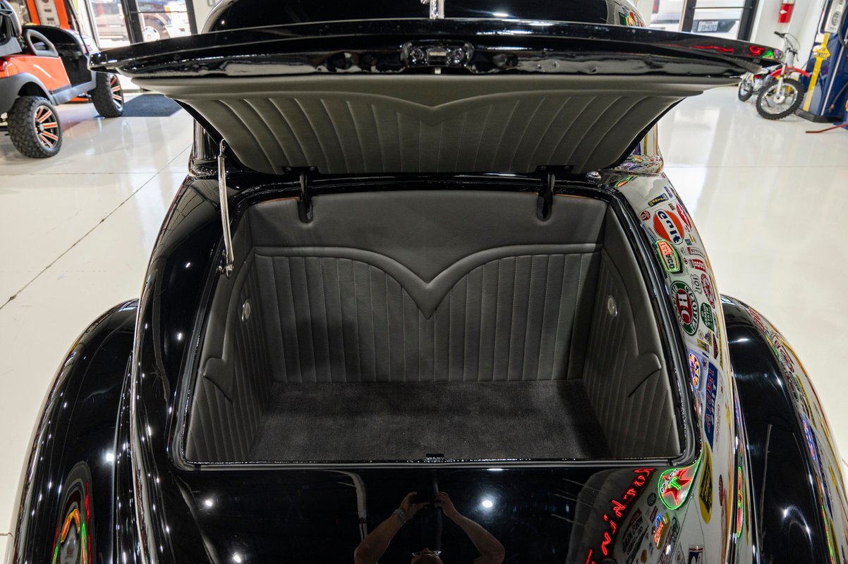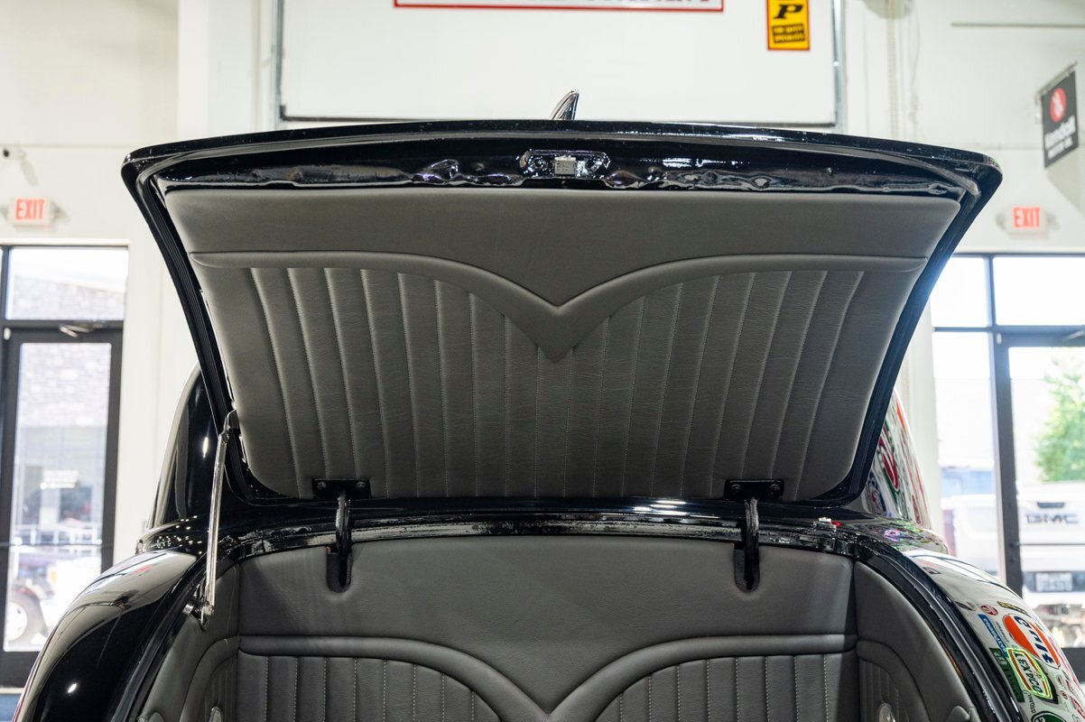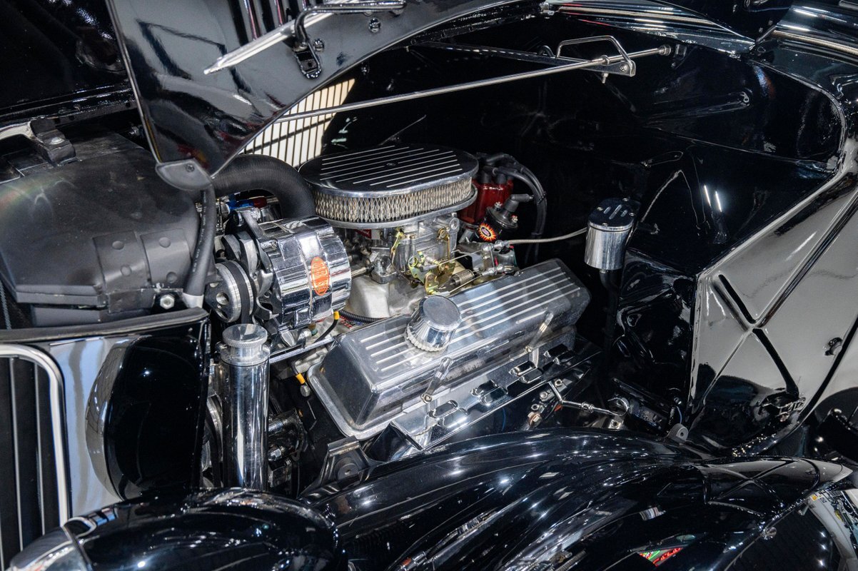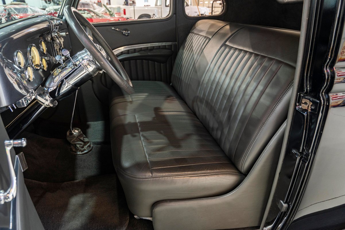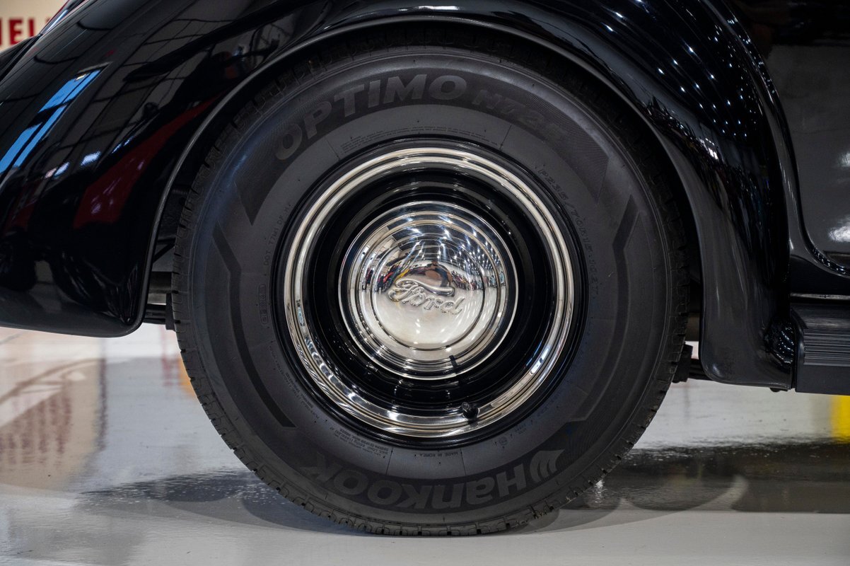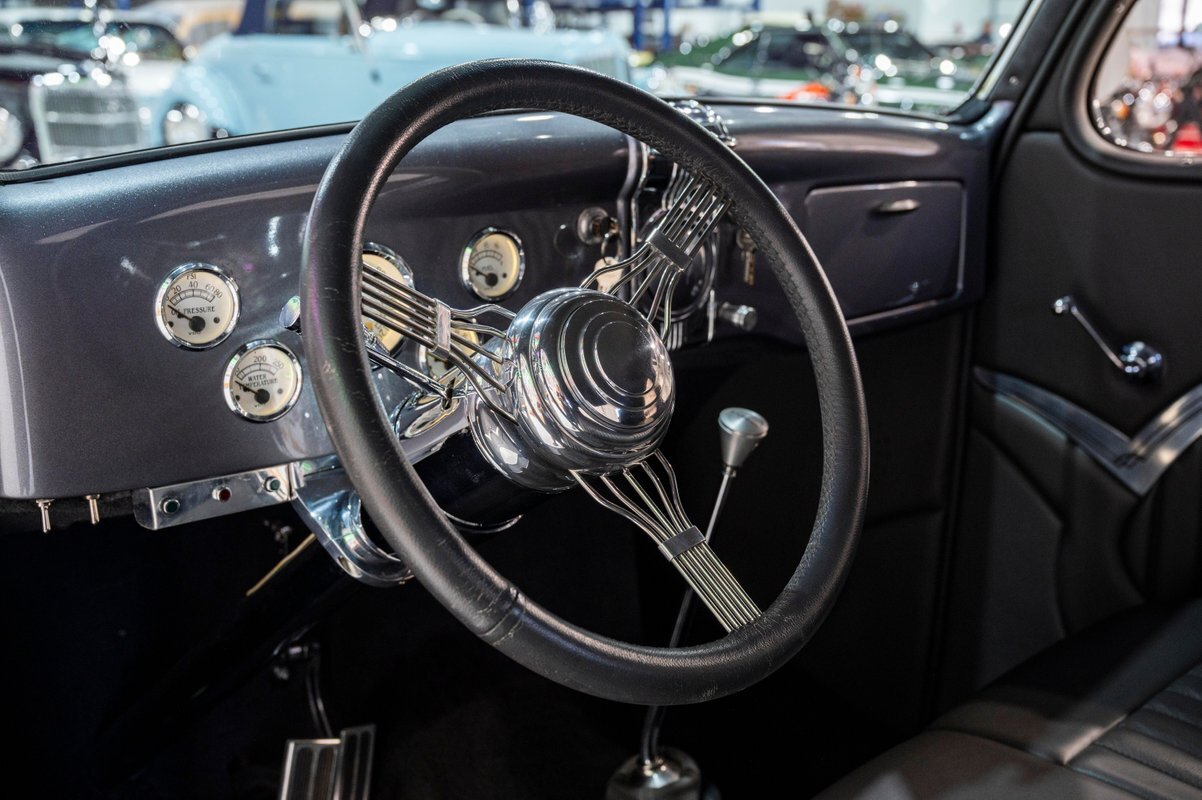 Finished in classic black exterior with new gray leather seats this recent restoration features tastefull styling throughout. Showcasing this build is a smooth-running 350 Chevy V-8, automatic, rack & pinion steering, and a host of engine details that are hallmarks of the best street rods. The care in restoration is evident everywhere, from the chromed alternator, polished valve covers, overflow tank and master cylinder to the chromed steering column with a "banjo" steering wheel. Topping it all off are modern VDO gauges, and steel wheels with early Ford hubcaps to complete the modern retro look.