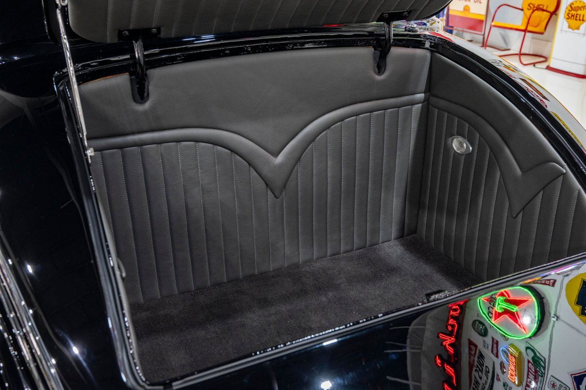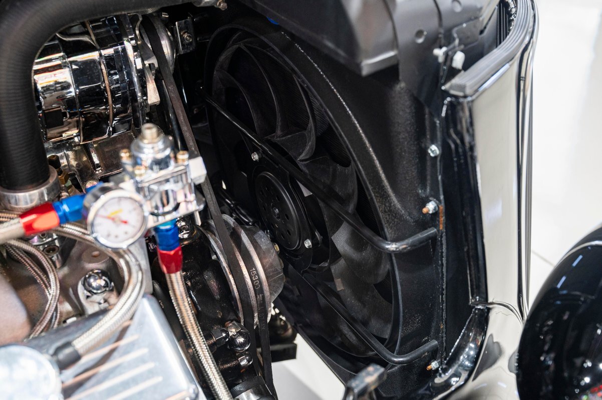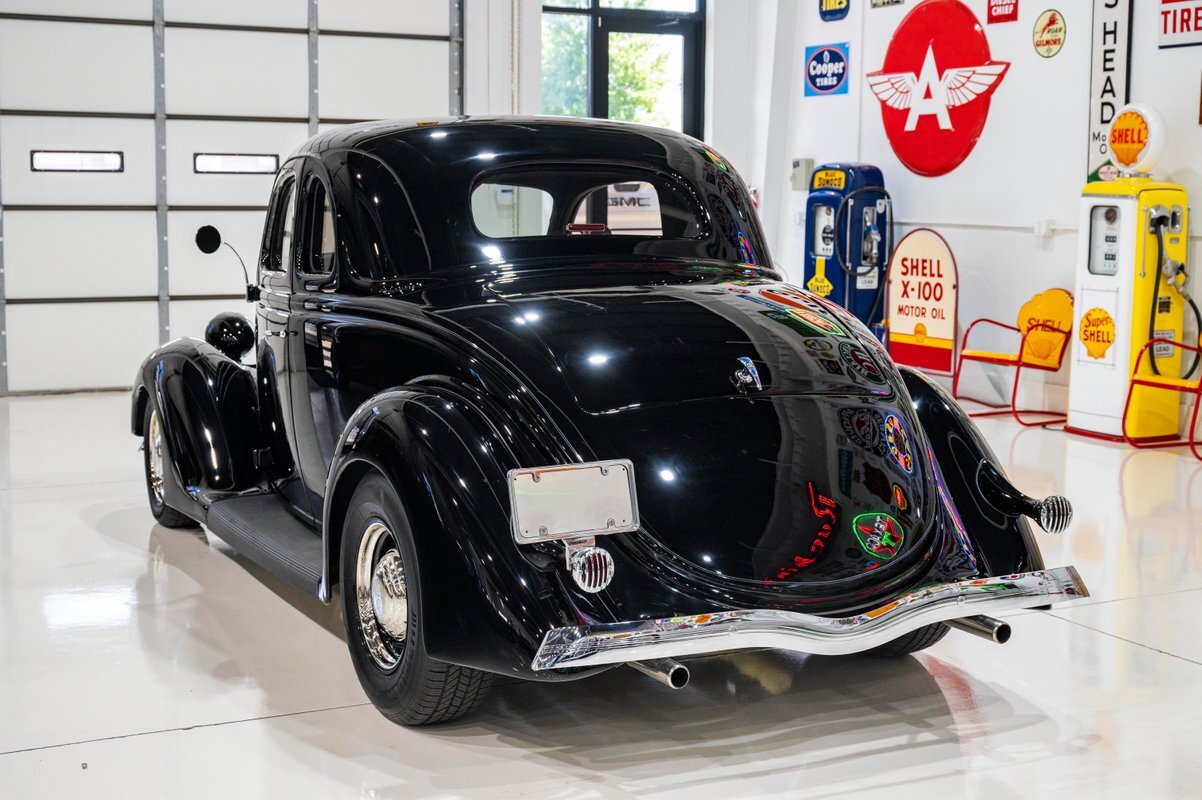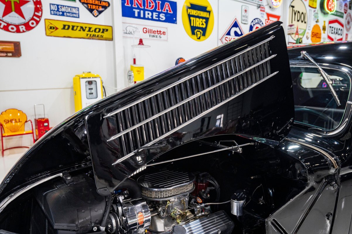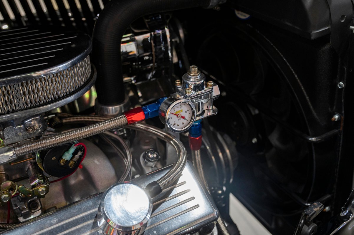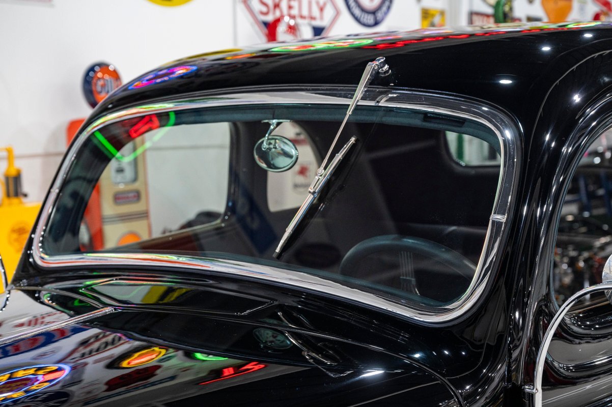 Finished in classic black exterior with new gray leather seats this recent restoration features tastefull styling throughout. Showcasing this build is a smooth-running 350 Chevy V-8, automatic, rack & pinion steering, and a host of engine details that are hallmarks of the best street rods. The care in restoration is evident everywhere, from the chromed alternator, polished valve covers, overflow tank and master cylinder to the chromed steering column with a "banjo" steering wheel. Topping it all off are modern VDO gauges, and steel wheels with early Ford hubcaps to complete the modern retro look.