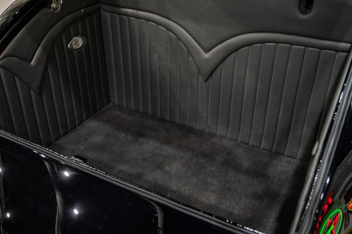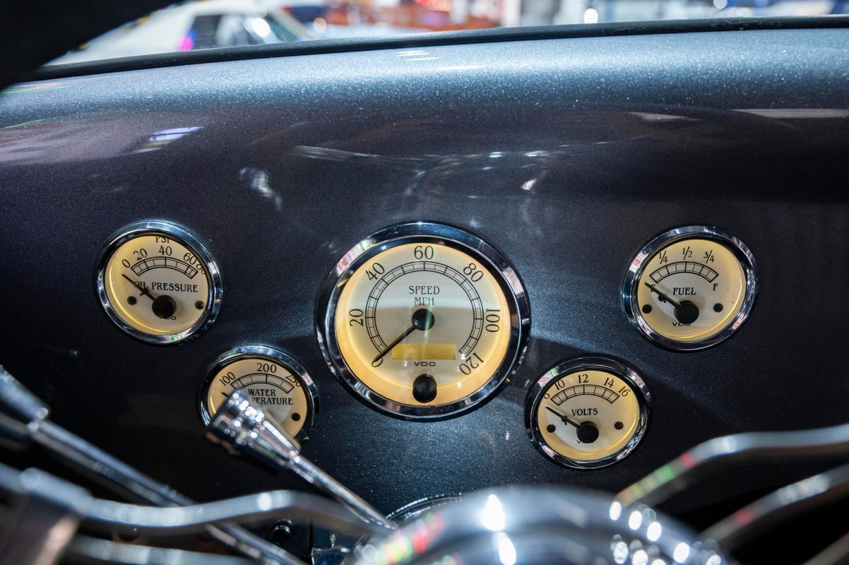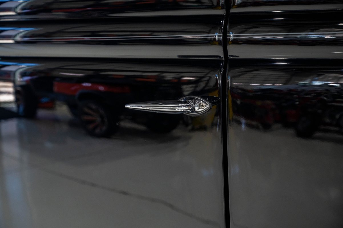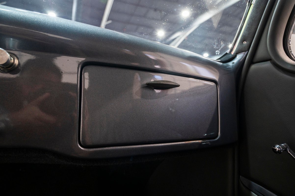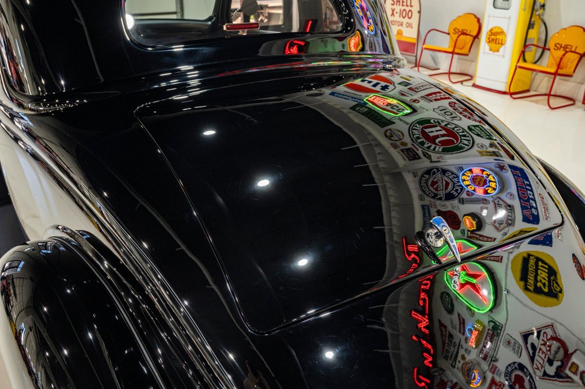 Finished in classic black exterior with new gray leather seats this recent restoration features tastefull styling throughout. Showcasing this build is a smooth-running 350 Chevy V-8, automatic, rack & pinion steering, and a host of engine details that are hallmarks of the best street rods. The care in restoration is evident everywhere, from the chromed alternator, polished valve covers, overflow tank and master cylinder to the chromed steering column with a "banjo" steering wheel. Topping it all off are modern VDO gauges, and steel wheels with early Ford hubcaps to complete the modern retro look.