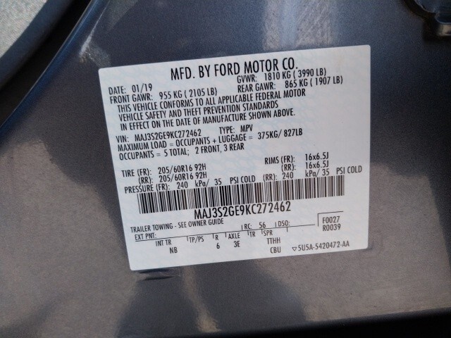Ford Gold Certified Certified, 110V/150W AC Power Outlet, 3.44 Axle Ratio, 4-Wheel Disc Brakes, 6 Speakers, 7 Speakers, ABS brakes, Air Conditioning, Alloy wheels, AM/FM radio: SiriusXM, Ambient Lighting, AppLink/Apple CarPlay and Android Auto, Automatic temperature control, BLIS Blind Spot Information System, Brake assist, Bumpers: body-color, Compass, Delay-off headlights, Driver door bin, Driver vanity mirror, Dual front impact airbags, Dual front side impact airbags, Electronic Stability Control, Emergency communication system: SYNC 3 911 Assist, Equipment Group 200A, Exterior Parking Camera Rear, FordPass Connect, Front anti-roll bar, Front Bucket Seats, Front Center Armrest, Front fog lights, Front reading lights, Front wheel independent suspension, Fully automatic headlights, Heated front seats, Illuminated entry, Keyless-Entry Keypad, Knee airbag, Leather Shift Knob, Leather steering wheel, Low tire pressure warning, Navigation System, Occupant sensing airbag, Outside temperature display, Overhead airbag, Overhead console, Panic alarm, Passenger door bin, Passenger vanity mirror, Power door mirrors, Power driver seat, Power moonroof, Power steering, Power windows, Radio data system, Radio: AM/FM Stereo w/MP3 Capable, Rear Parking Sensors, Rear seat center armrest, Rear side impact airbag, Rear window defroster, Rear window wiper, Remote keyless entry, Roof rack: rails only, SE Convenience Package, SiriusXM Radio, SiriusXM Traffic & Travel Link, Speed control, Speed-sensing steering, Split folding rear seat, Steering wheel mounted audio controls, SYNC 3 Communications & Entertainment System, SYNC 3 Communications & Entertainment System w/47B, Tachometer, Telescoping steering wheel, Tilt steering wheel, Tire Inflator & Sealant Kit, Traction control, Trip computer, Turn signal indicator mirrors, Unique Cloth Heated Front Bucket Seats, Variably intermittent wipers, Wheels: 16 Shadow Silver-Painted Aluminum.
