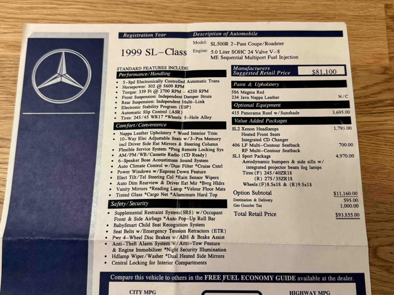 FULL HIGH RESOLUTION PHOTOS AND DETAILED DESCRIPTION ON YOU HAVE A VEHICLE YOU ARE LOOKING TO SELL, PLEASE CALL US AT 770-455-8494WE SHOW VEHICLES BY APPOINTMENT ONLY. PLEASE CALL TO SCHEDULE AN APPOINTMENT IN ORDER TO VIEW A LISTING IN PERSON.NEW ARRIVAL!! TOP HYDRAULICS REBUILT!! FACTORY OPTIONED PANO ROOF INCLUDED WITH STAND! EVERY SERVICE STAMP/RECORD SINCE NEW IN A BINDER! ULTRA RARE MERCEDES BENZ R129 SL500 WITH SPORT PACKAGE, FACTORY OPTIONED CHROME AMG SPORT WHEELS, AND PANORAMIC ROOF! MERCEDES BENZ OF PALM SPRINGS SERVICED AND NAPA VALLEY-OWNED AS DOCUMENTED IN OWNERSHIP HISTORY. METICULOUSLY WELL MAINTAINED AND HIGHLY ORIGINAL. CLEAN CARFAX WITH NO ACCIDENTS, NO DAMAGE, AND ALL ORIGINAL PAINT.RECENTLY RECEIVED SUSPENSION OVERHAUL, ALIGNMENT, AND BRAND NEW MICHELIN TIRES NOT EVEN 1000 MILES AGO. RUNS AND DRIVES VERY NICELY. COMES WITH TWO KEYS AND TWO BLANK SPARES, ALL BOOKS, MANUALS, RECORDS, ORIGINAL WINDOW STICKER, VMI, INTERNAL OPTIONS SHEET, ORIGINAL RADIO, PANO ROOF, AND MORE. $93,855 ORIGINAL MSRP!!EXTERIOR IS PAINTED INMAGMA RED WITHJAVA LEATHERINTERIOR.OPTIONS AND FEATURES INCLUDE:5.0L M113 V8 ENGINEAUTOMATIC TRANSMISSIONSL1 SPORT PACKAGE18 CHROME 5 SPOKE AMG SPORT STAGGERED WHEELSSL2 XENON HEAD LAMPSPANORAMA ROOF WITH SUNSHADECUP HOLDERBLACK SOFT TOP WITH NO RIPS OR TEARSELECTRONICALLY ADJUSTABLE FRONT SEATS WITH HEAT, MEMORY AND MULTI CONTOURCONTINENTAL HEAD UNIT BLUETOOTH RADIO WITH OEM INCLUDEDBOSE SOUND SYSTEMCRUISE CONTROLAIR CONDITIONING (ICE COLD)BURL WALNUT WOOD TRIMPOWER WINDOWSBOOKS & MANUALSWIND DEFLECTORAND MORE.GAS MOTORCARS IS A FAMILY OWNED AND OPERATED CAR DEALERSHIP LOCATED IN MARIETTA, GA. WE ONLY SELL VEHICLES OF THE HIGHEST QUALITY. WE SHIP VEHICLES WORLDWIDE AT THE BUYER'S EXPENSE. WE TAKE CONSIGNMENTS AS WELL AS TRADES.WE SHOW VEHICLES BY APPOINTMENT ONLY.PLEASE CALL AHEAD TO SCHEDULE A DATE AND TIME IN ORDER TO VIEW A LISTING IN PERSON.FOLLOW US ON INSTAGRAM @GASMOTORCARSIt is the customers sole responsibility to verify the existence and condition of any equipment listed. Neither the dealership nor DealerCarSearch is responsible for misprints on prices or equipment. It is the customers sole responsibility to verify the accuracy of the prices with the dealer, including the pricing for all added accessories. Visit Gas Motorcars online at to see more pictures of this vehicle or call us at770-455-8494 today to schedule your test drive.