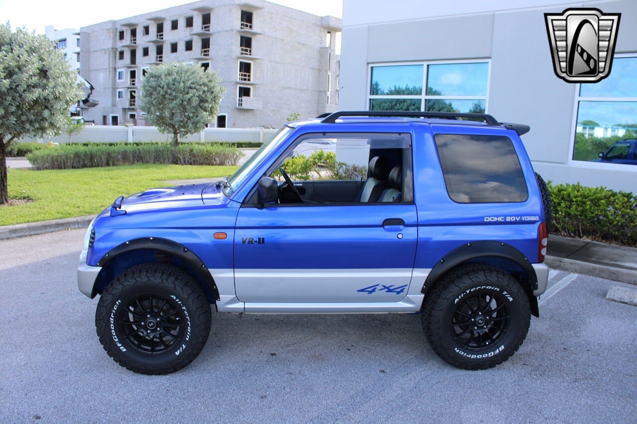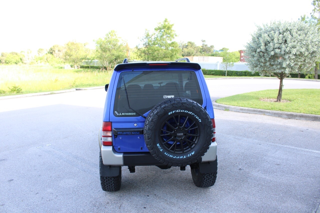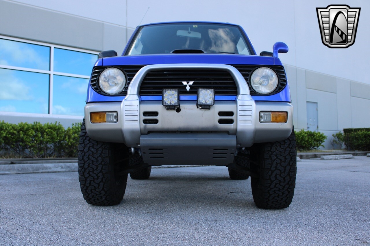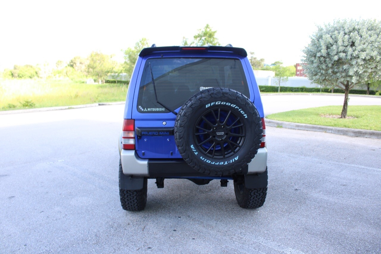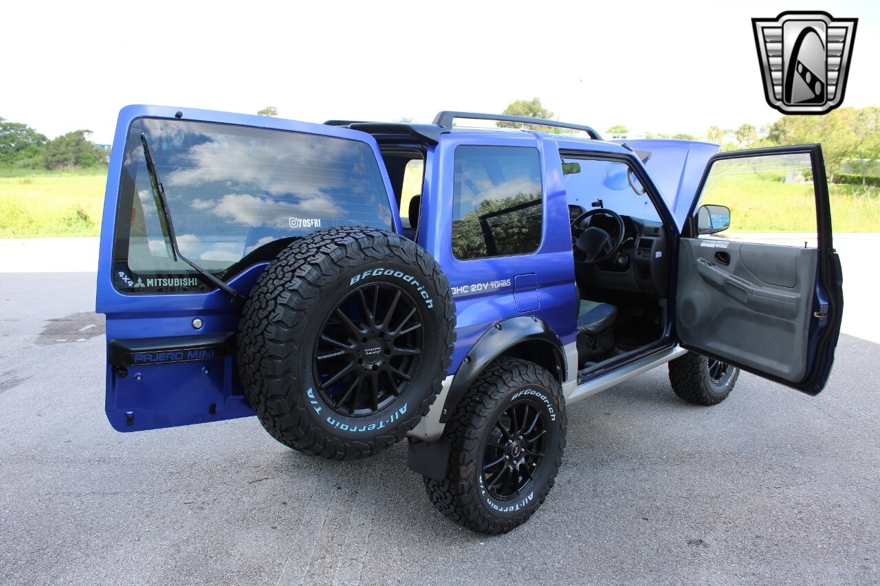 Introducing the 1996 Mitsubishi Pajero Mini BR2, a compact SUV that combines practicality with a touch of adventure. This vehicle boasts a striking blue exterior that is sure to turn heads wherever you go. Step inside, and you'll find a comfortable gray cloth interior that provides a cozy and inviting atmosphere for both driver and passengers.
