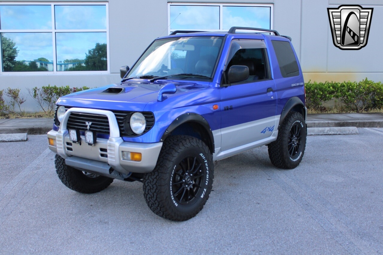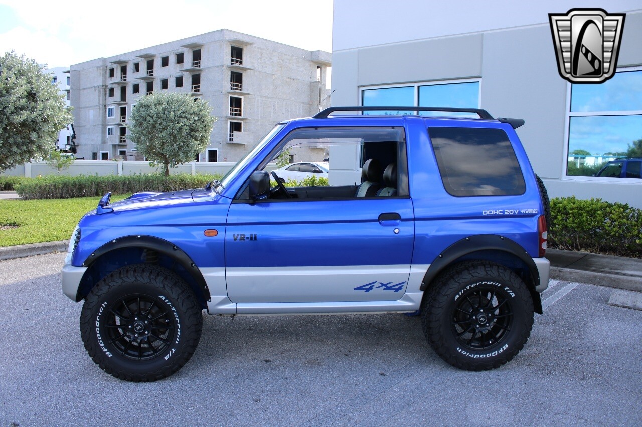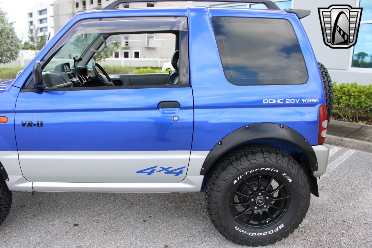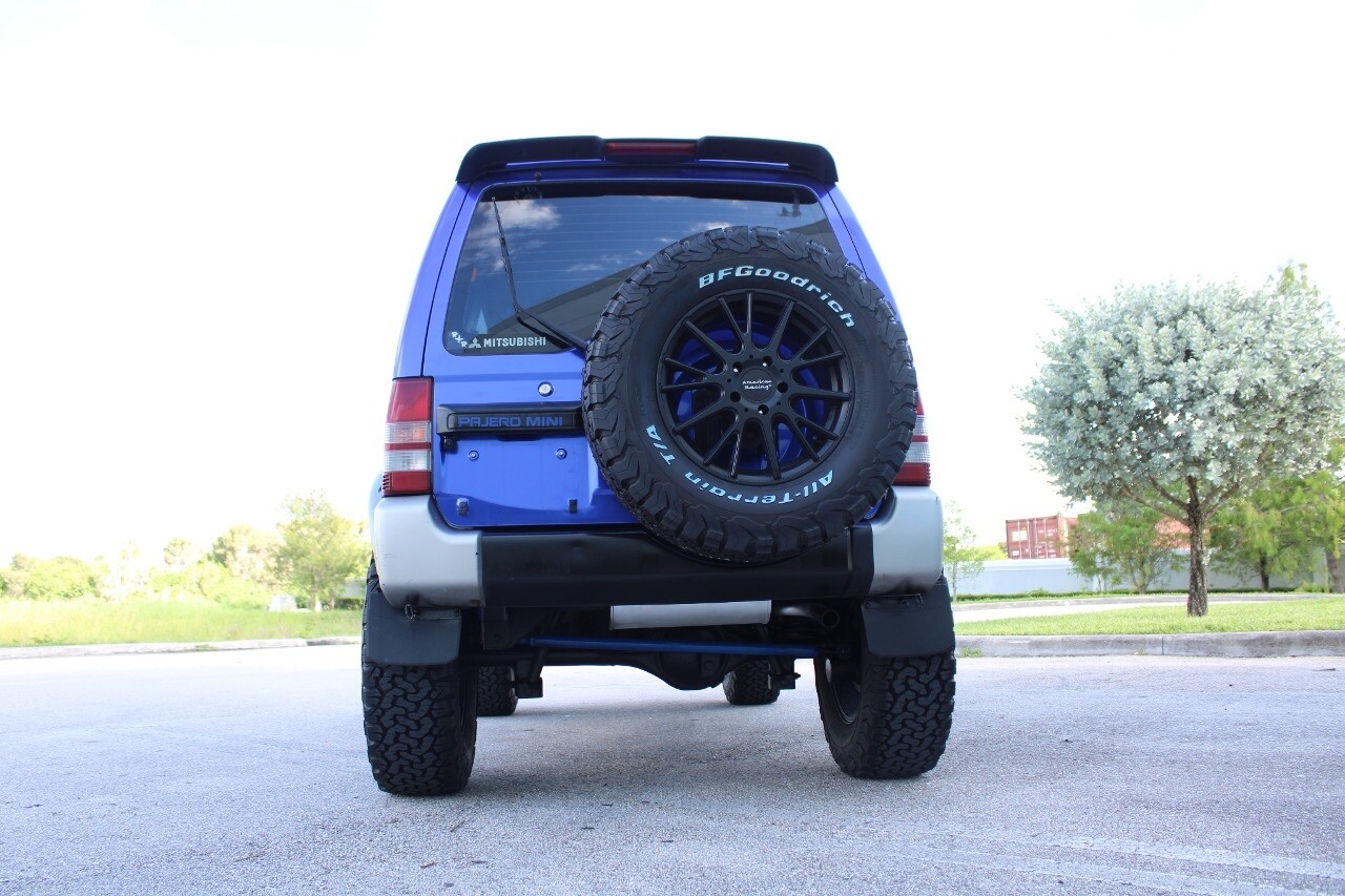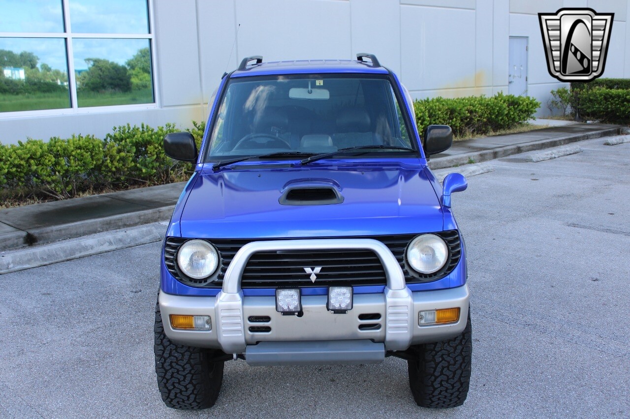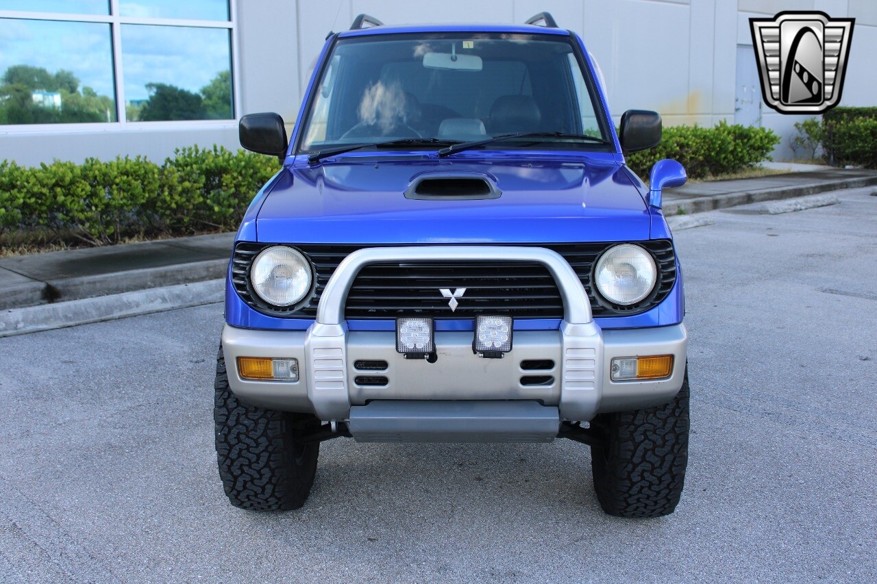 Introducing the 1996 Mitsubishi Pajero Mini BR2, a compact SUV that combines practicality with a touch of adventure. This vehicle boasts a striking blue exterior that is sure to turn heads wherever you go. Step inside, and you'll find a comfortable gray cloth interior that provides a cozy and inviting atmosphere for both driver and passengers.